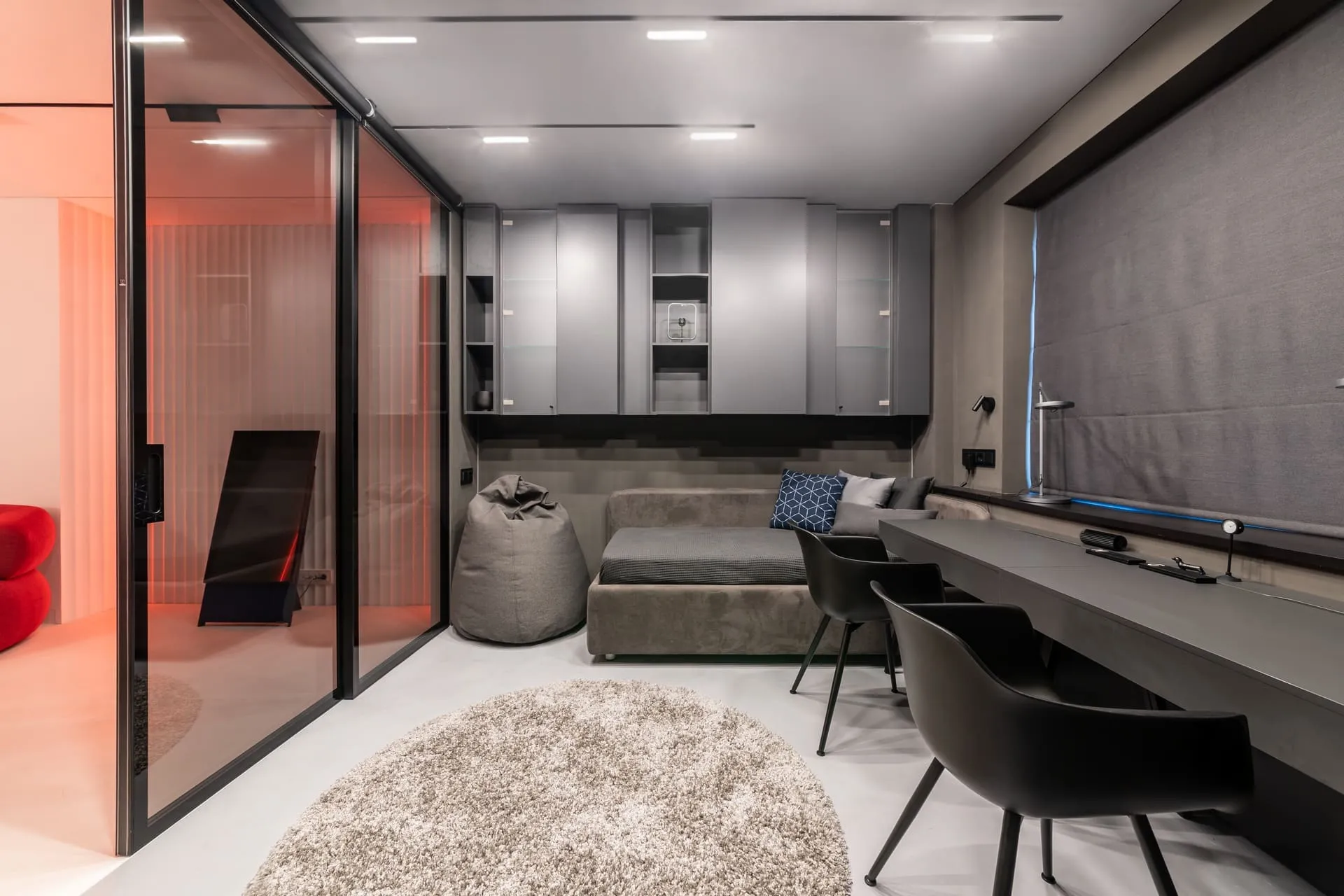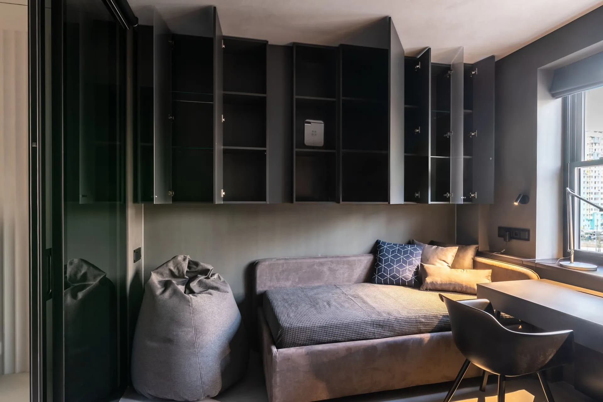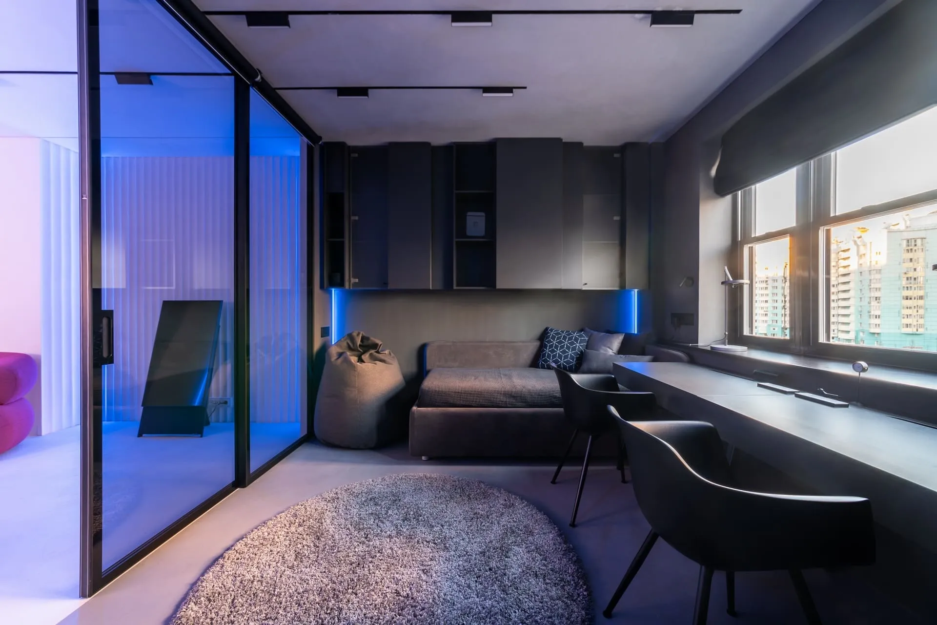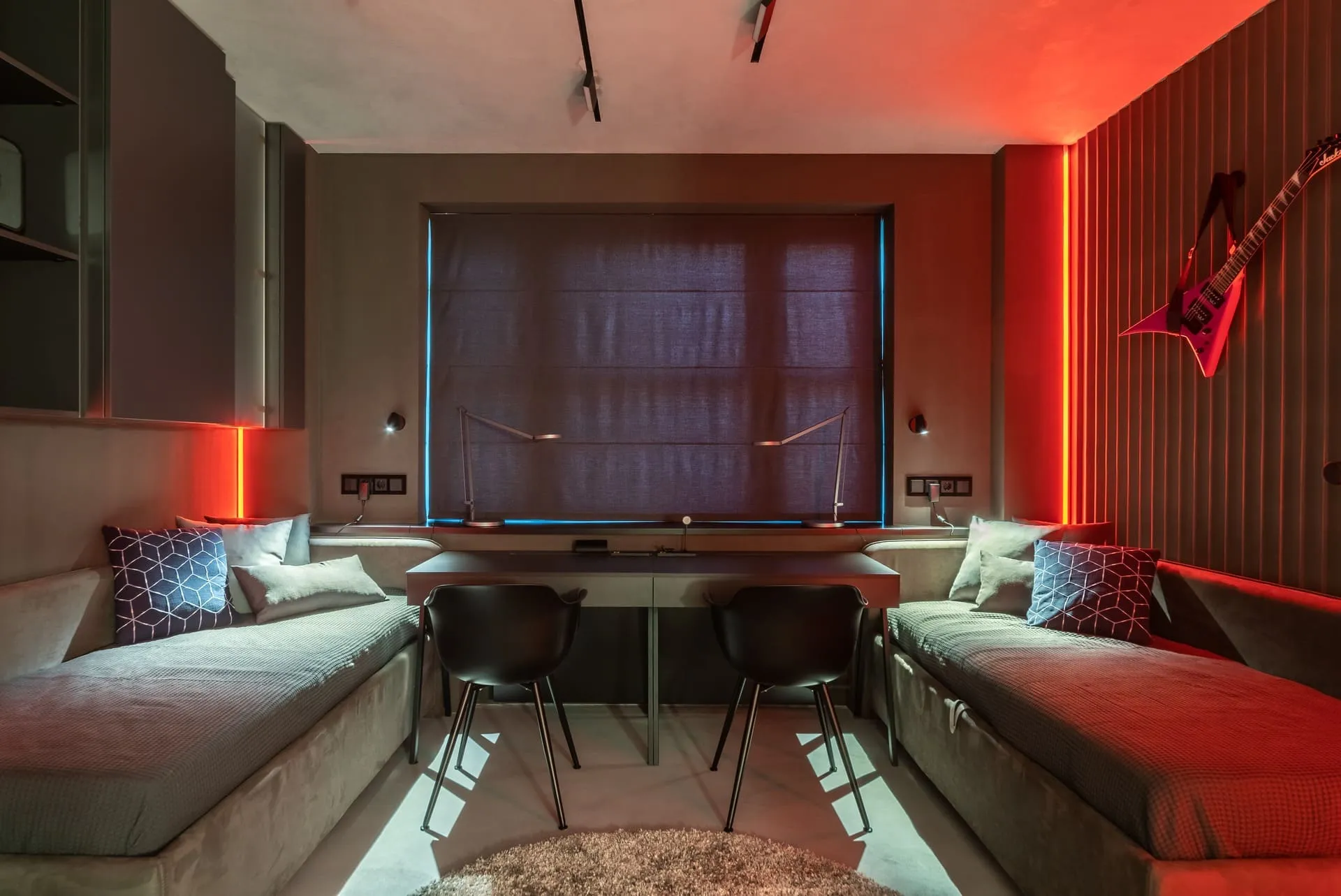 Подростковая часть получилась весьма брутальной, но именно таким и был запрос детей. А возможность полной светоизоляции и игры подсветкой даёт совершенно новые впечатления от той же мебели.