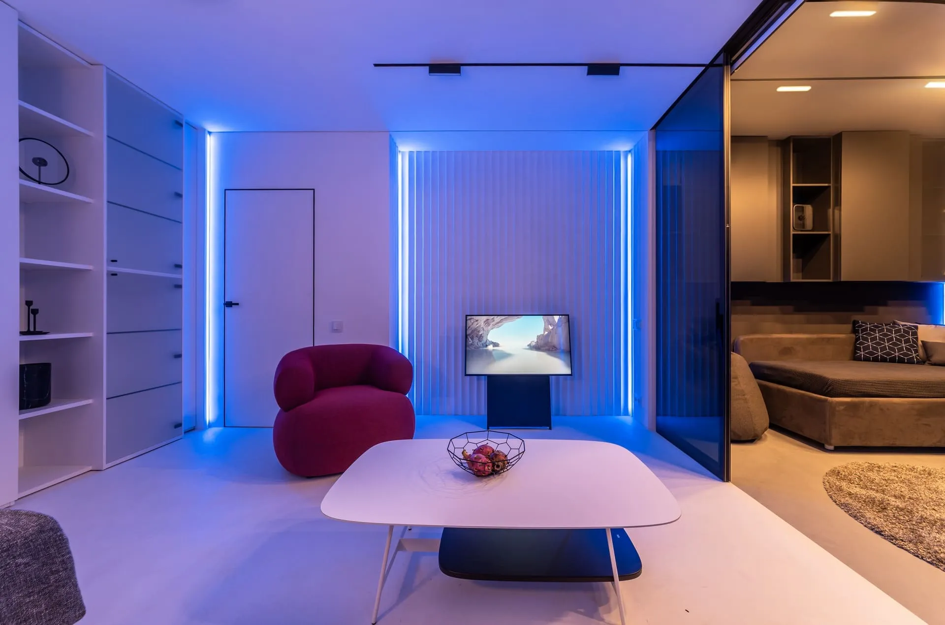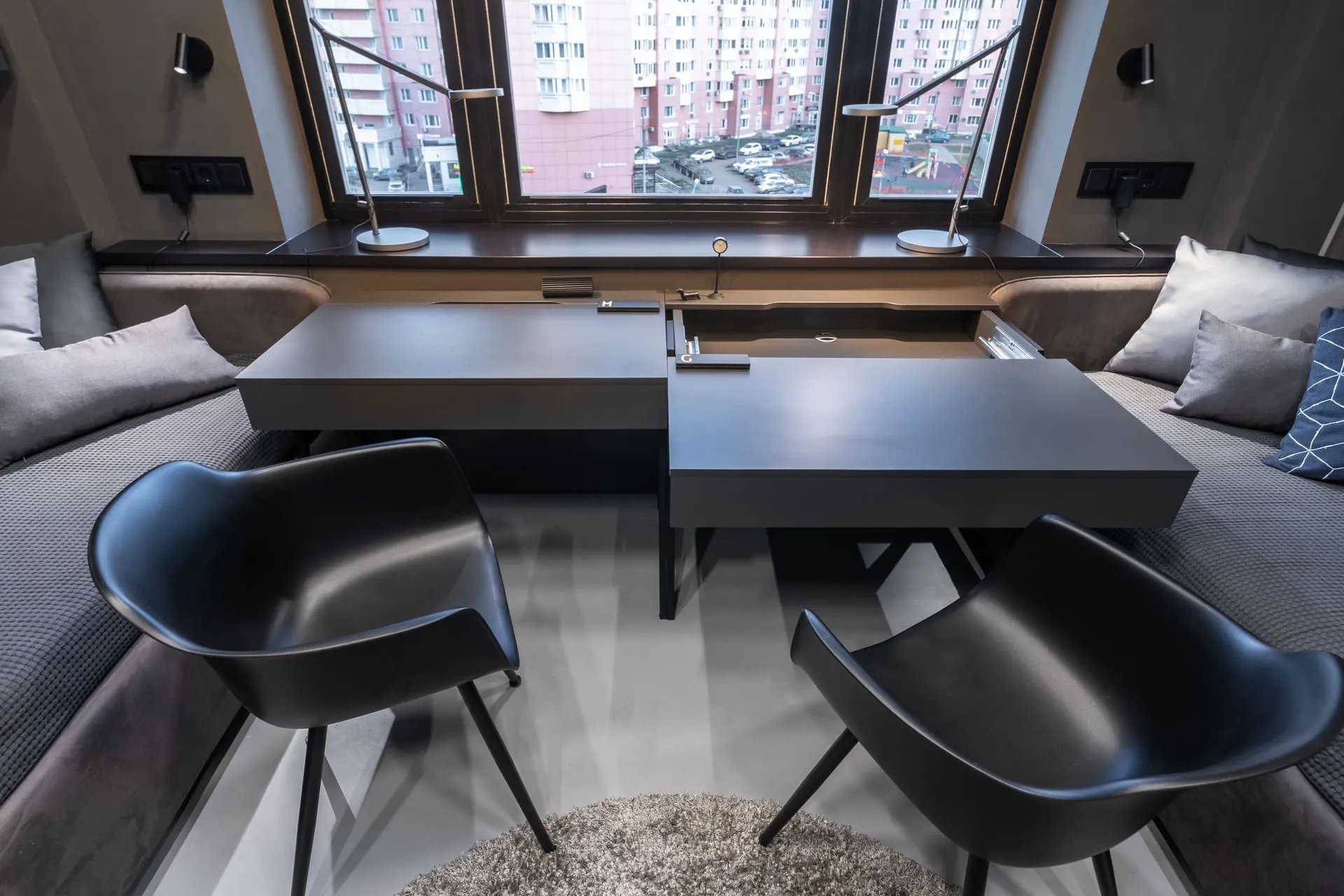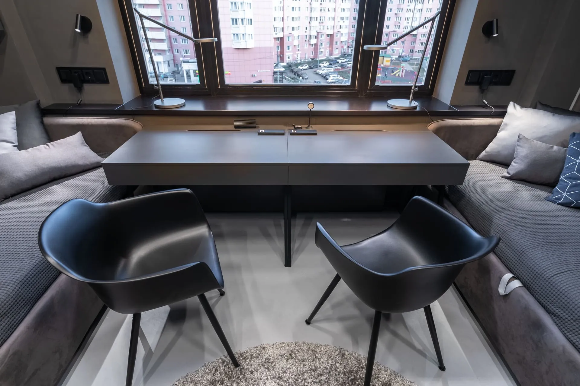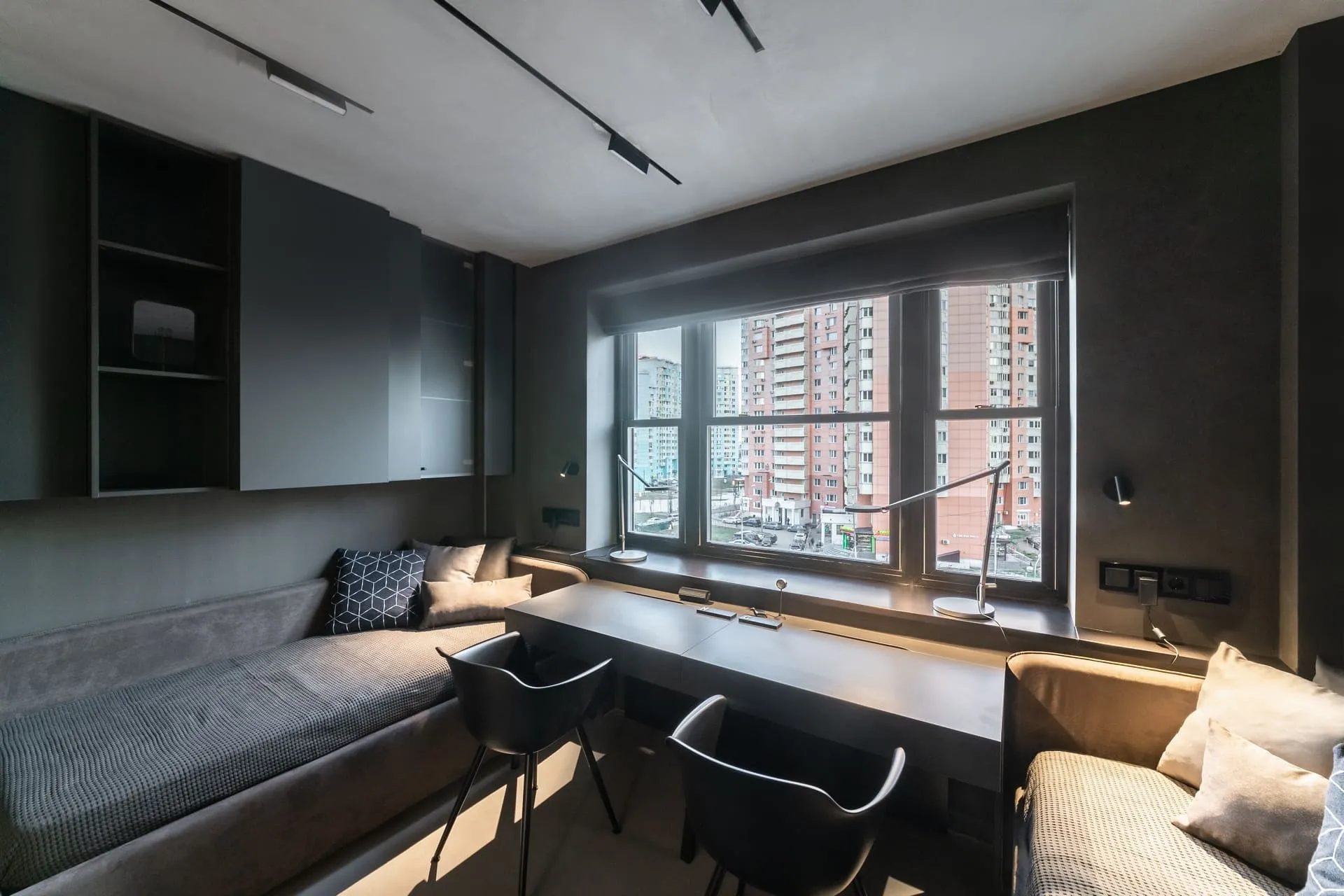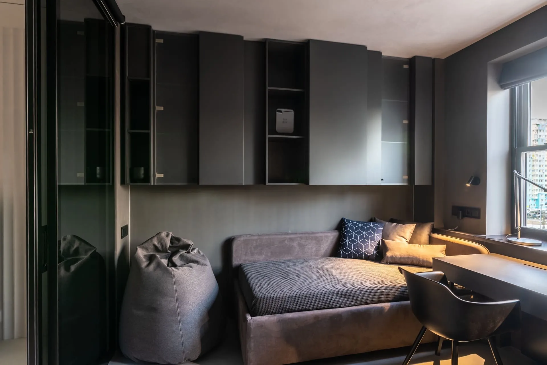 Подростковая часть получилась весьма брутальной, но именно таким и был запрос детей. А возможность полной светоизоляции и игры подсветкой даёт совершенно новые впечатления от той же мебели.