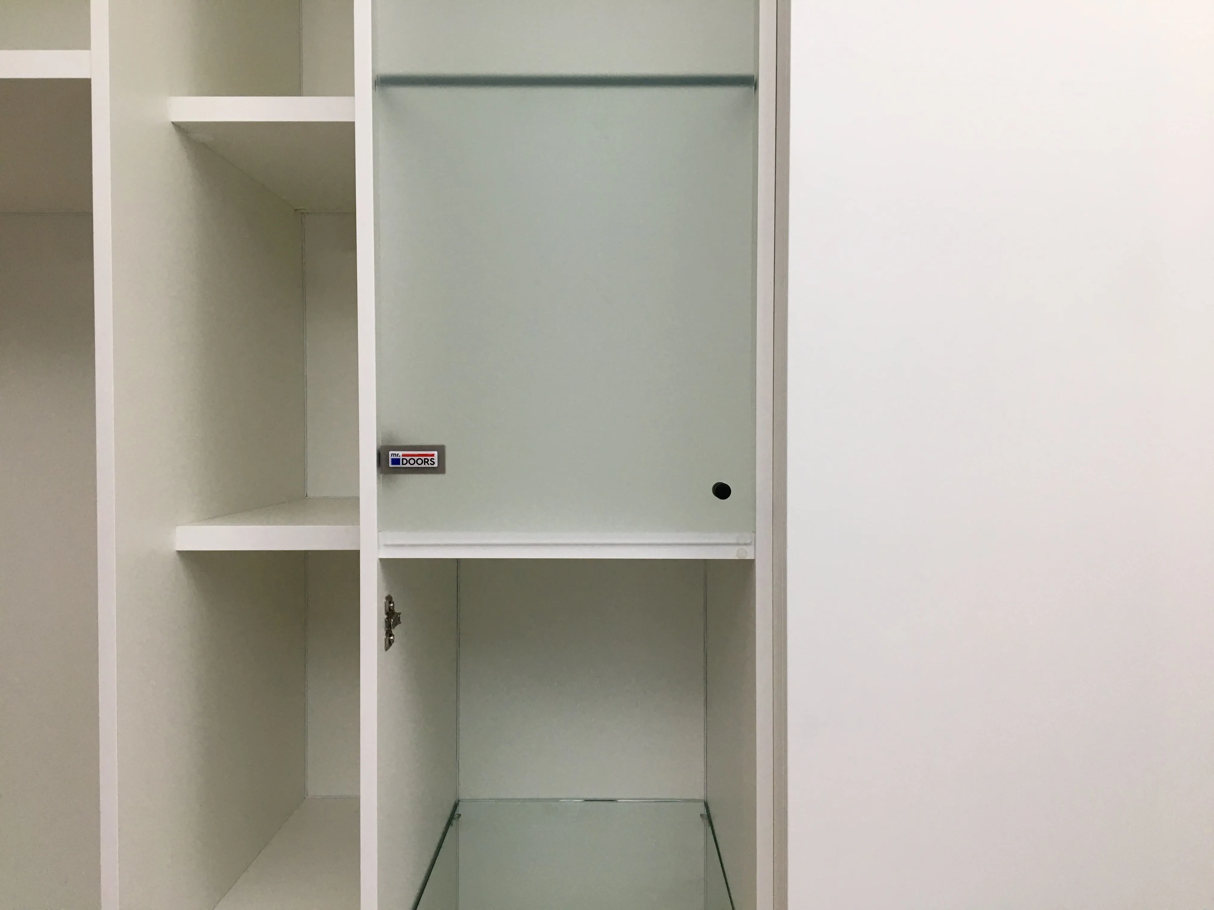Для фасадов использовано новое матовое стекло Мателюкс Экстра. Ручки Пайплайн в цвете Лакато чёрный. Панельные фасады выполнены в эмали, максимальной высоты и минимальной ширины (узкие). Открывание – Р2О.