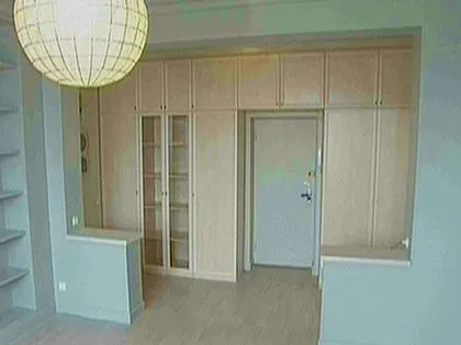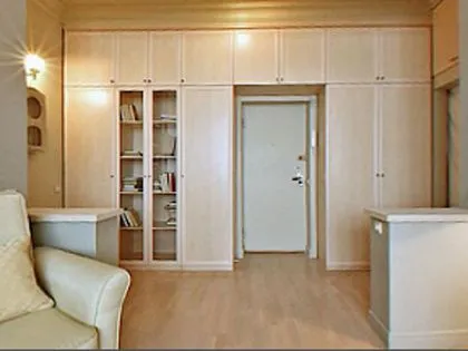 В данном проекте предлагается вариант обустройства гостиной. При переделке квартира лишилась прихожей, но от этого преобразования новый интерьер только выиграл. Прихожая из узкого тёмного помещения превратилась в часть большой и светлой гостиной и не утратила при этом своё функциональное назначение. Поэтому всю торцевую стену с входной дверью заняли портальным шкафом с множеством отделений. Шкаф сделан из ламинированного ДСП декора «Берёза», имеет гардеробное отделение, антресоли и витрину со стеклянными вставками.