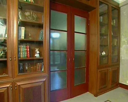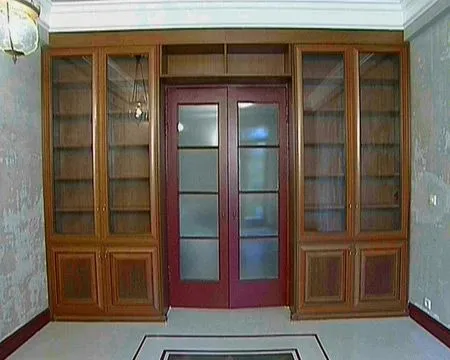 На этот раз перед дизайнерами была поставлена задача оформить гостиную-спальню в двухкомнатной квартире. Дизайнеры решили превратить это помещение в комнату старинного замка. Антикварные люстры, расписной пол, камин - вся обстановка навеяна романтикой прошедших столетий. Мебель так же призвана поддержать впечатление остановившегося времени. В данную обстановку очень удачно вписывается мебель новой серии "Mr.Doors Classics", которая создана специально для людей, ценящих прошлое. В этой необыкновенной гостиной всю торцевую стену с входной дверью заняла библиотека – два шкафа в классическом стиле, соединенных над дверью подвесным мостом. Материал композиции – экологически чистая ДСП, шпонированные рамы, цвет – "Орех-Антик". В верхние фасады вставлены стёкла, а нижние декорированы панелями "Буазери" из массива берёзы.