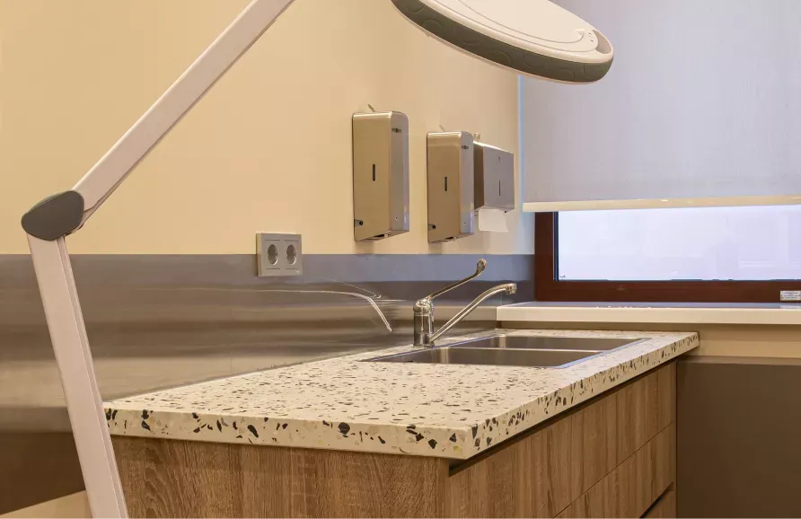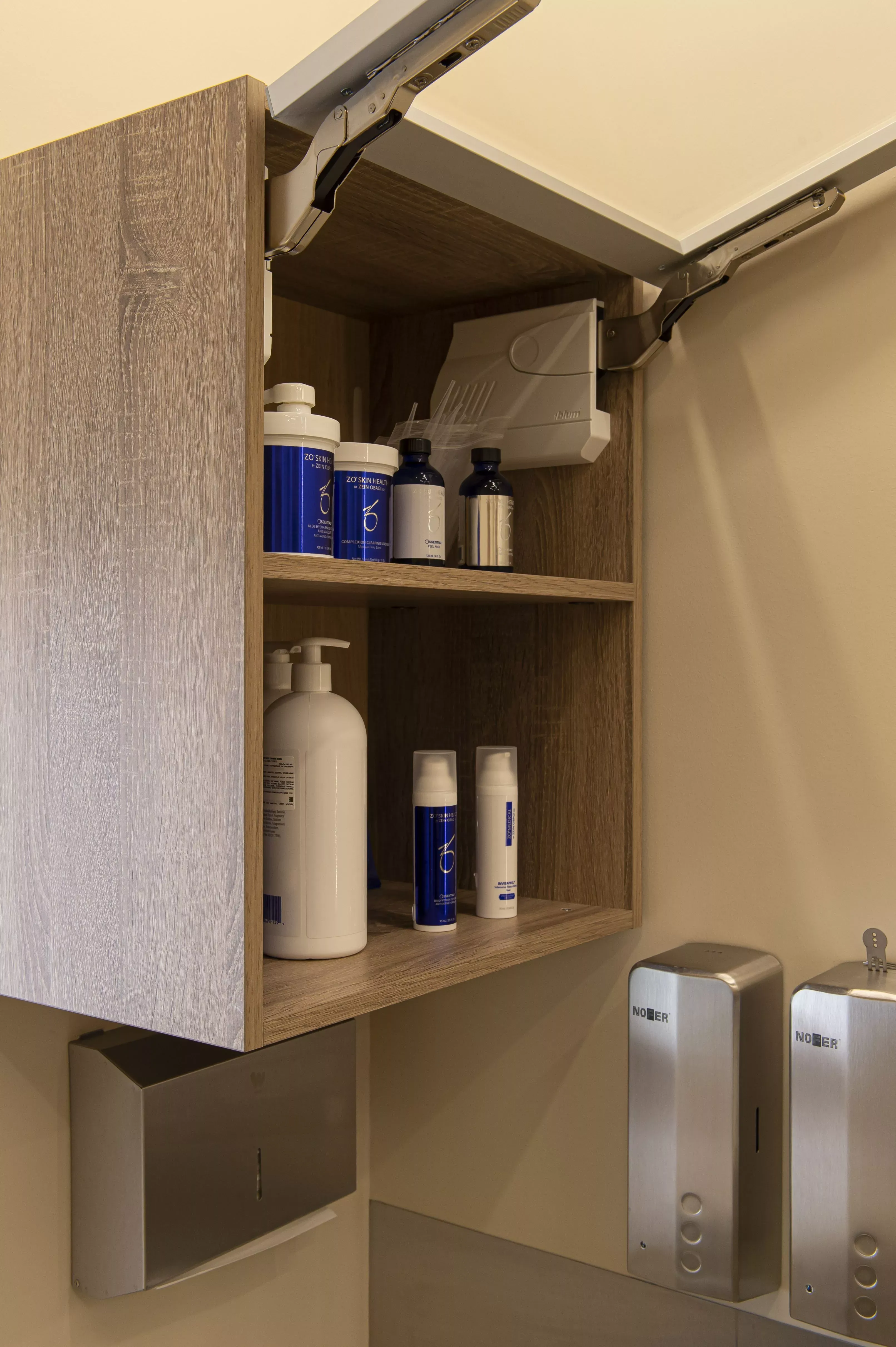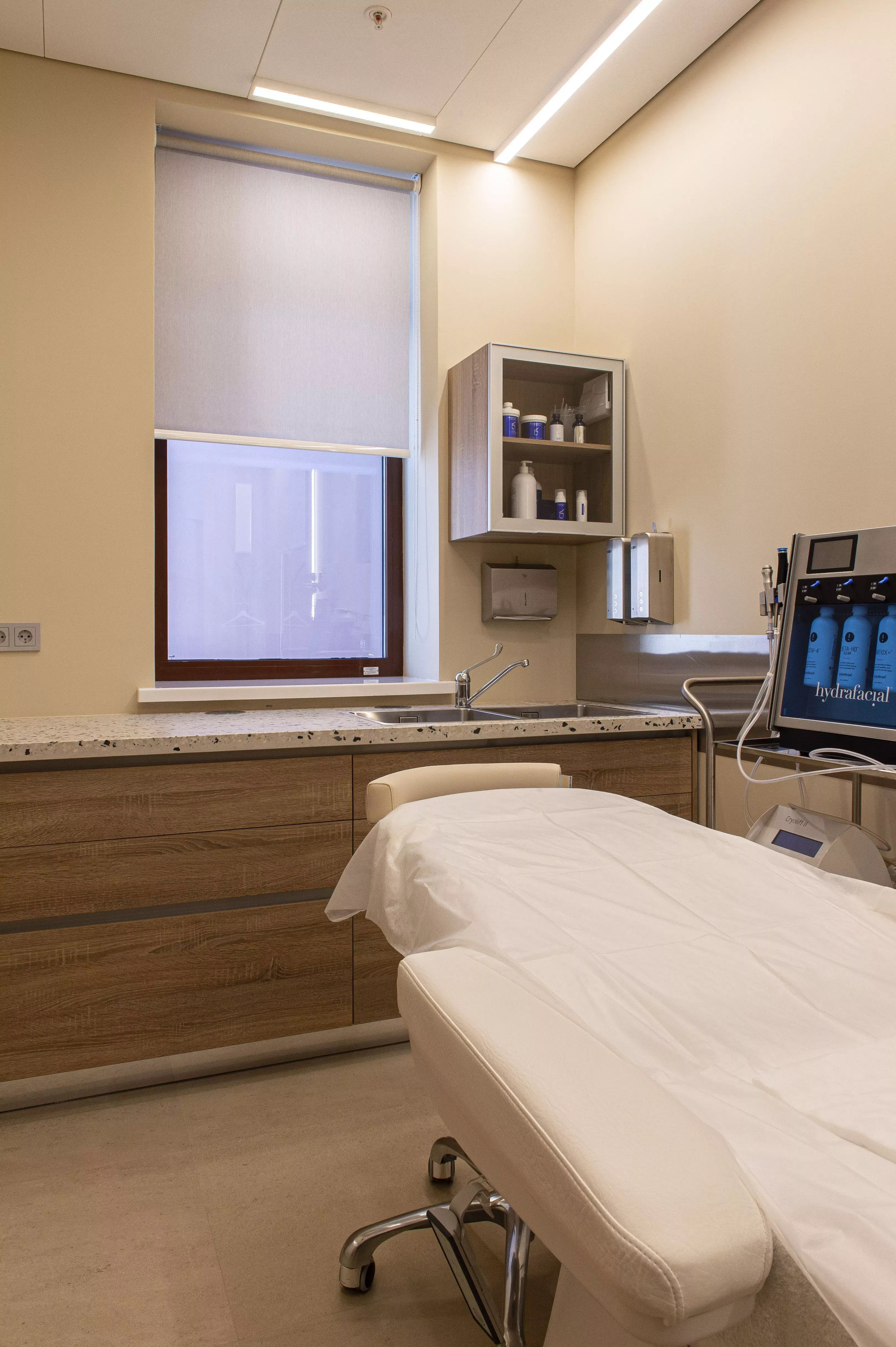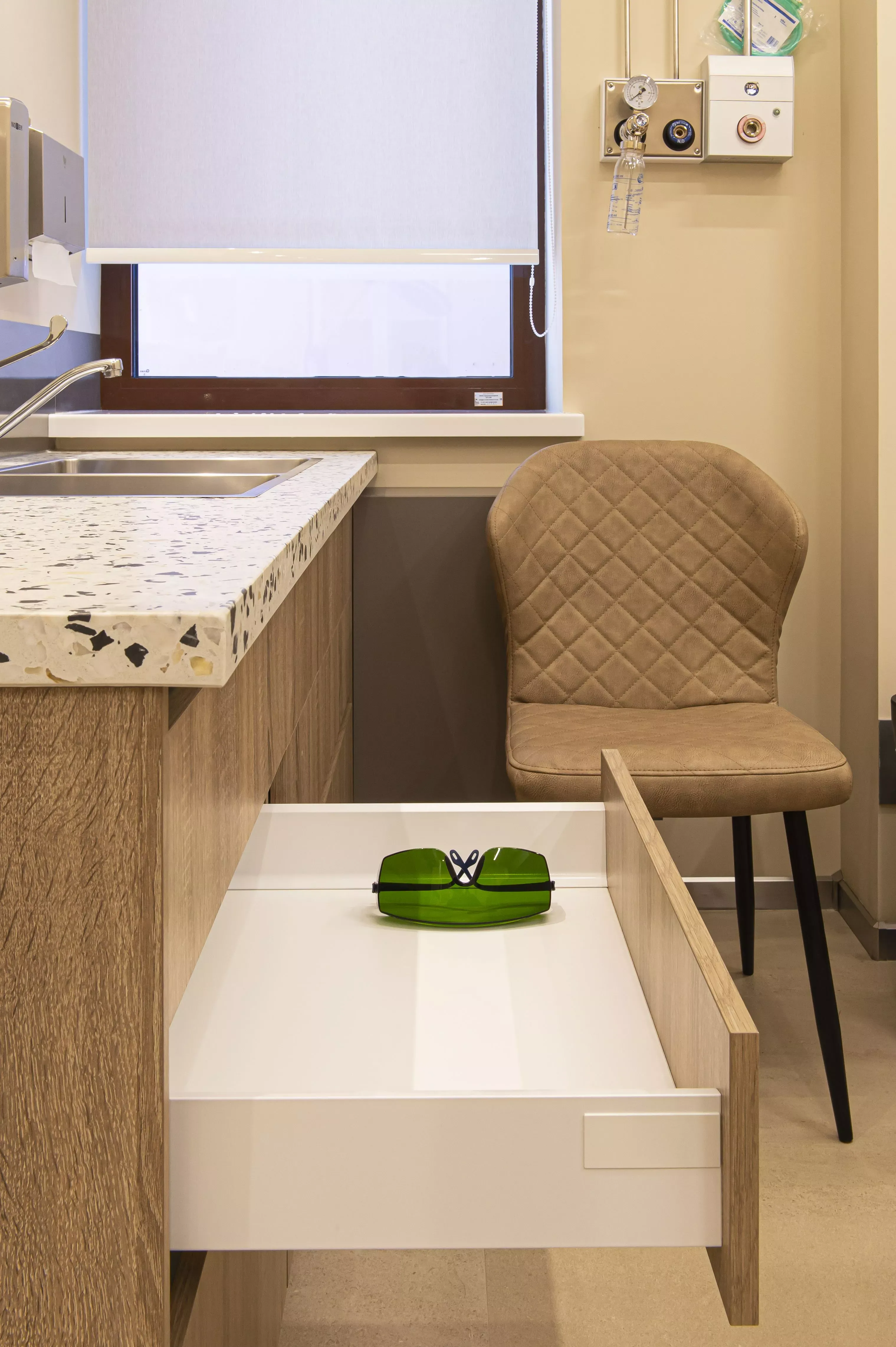 Благодаря одинаковым декорам и столешницам кабинеты смотрятся одинаково, при этом существенно отличаясь по функционалу. Интерьер получился теплым, располагающим к хорошим эмоциям во время приема.