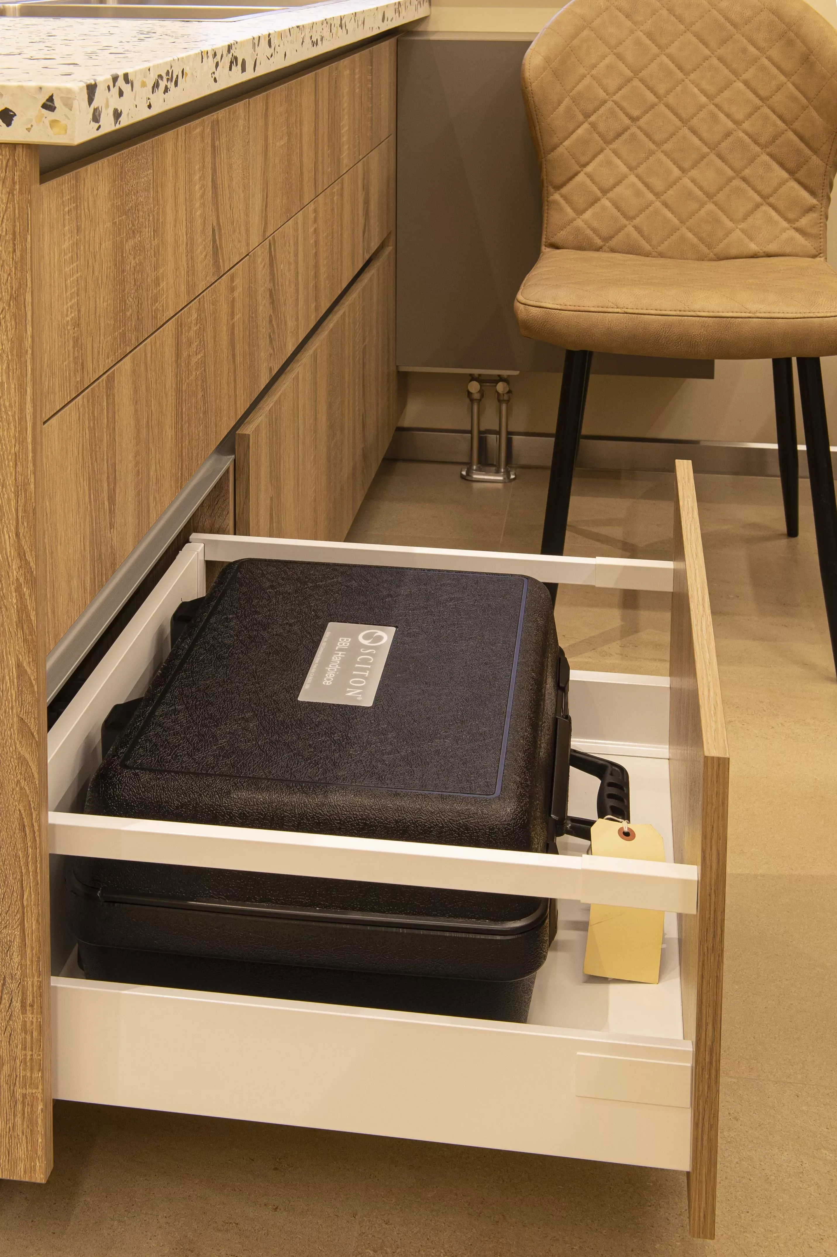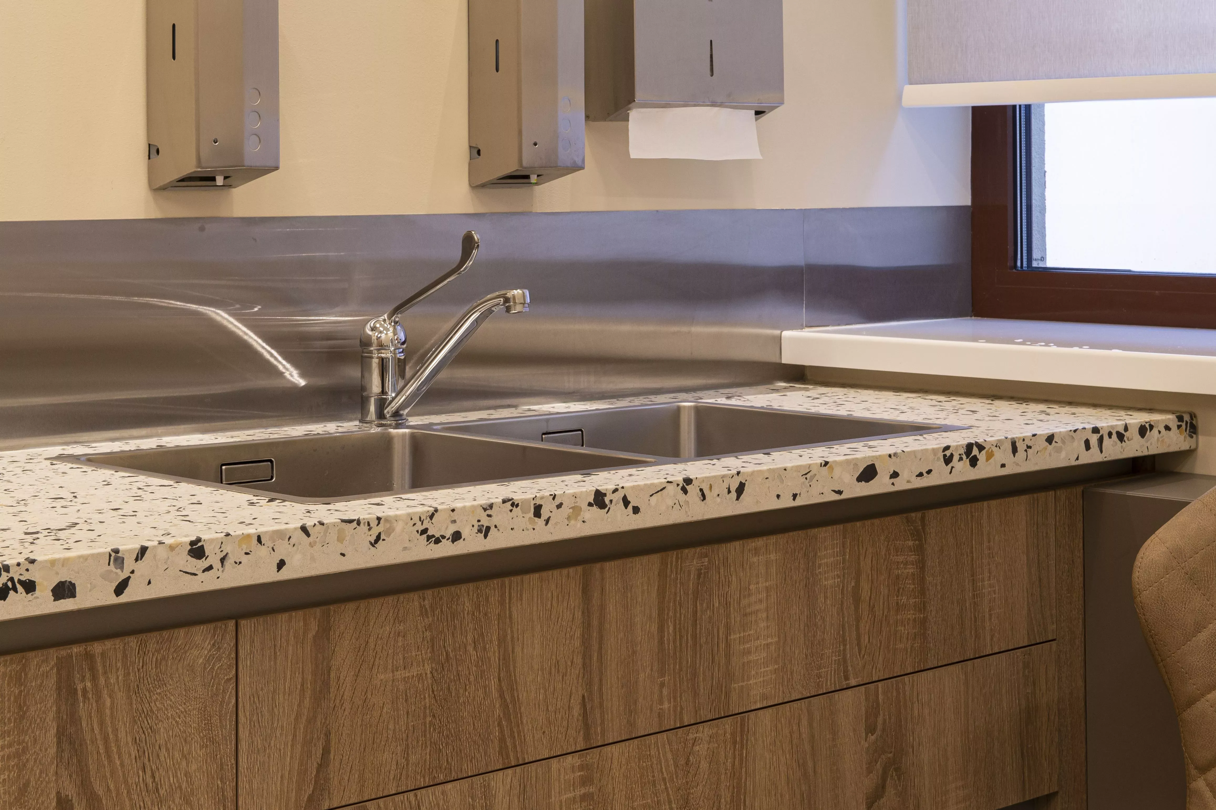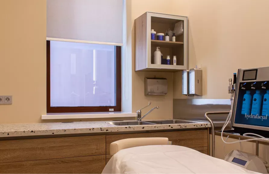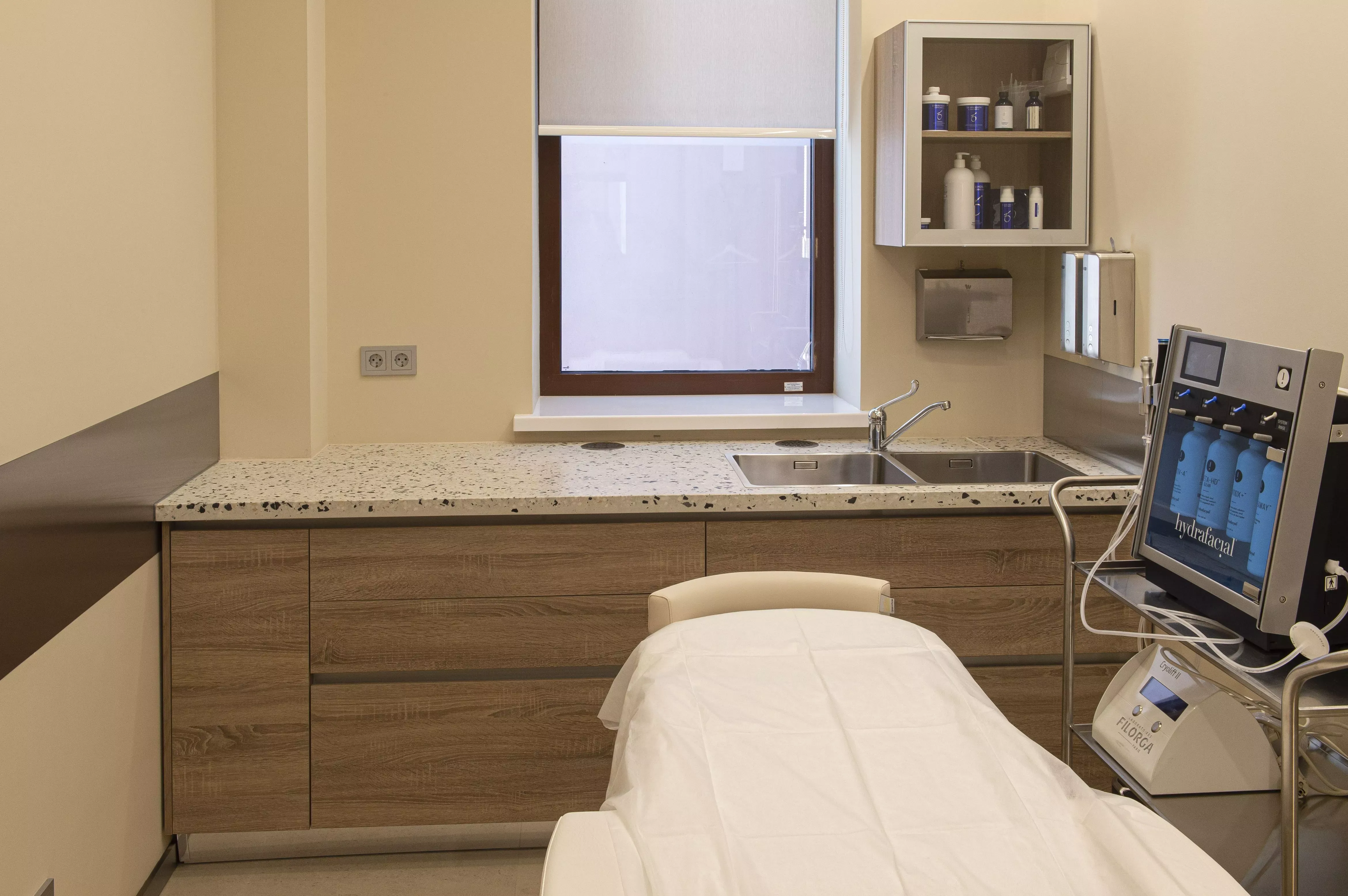 Благодаря одинаковым декорам и столешницам кабинеты смотрятся одинаково, при этом существенно отличаясь по функционалу. Интерьер получился теплым, располагающим к хорошим эмоциям во время приема.