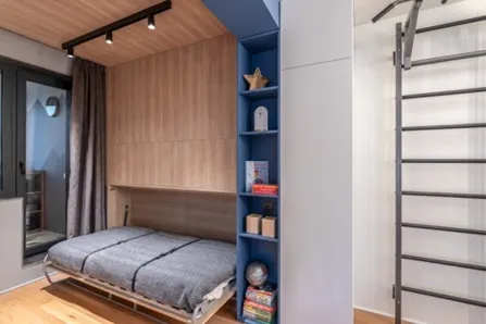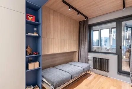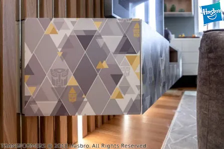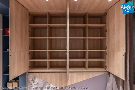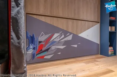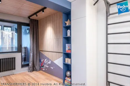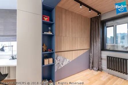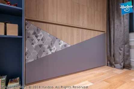 Нам удалось сделать комнату по-настоящему особенной. На крышку одной из кроватей (которая является ее основанием в разложенном виде) нанесен узор со стилизованными изображениями автоботов из популярного фильма «Трансформеры». На второй кровати изображен легендарный Оптимус Прайм. Яркая геометричная разбивка плоскостей придаёт всей композиции особую динамику. Для удобства откидывания кроватей сделан специальный захват. Внутри кроватных ниш устроена мягкая теплая подсветка с сенсорным выключателем.
