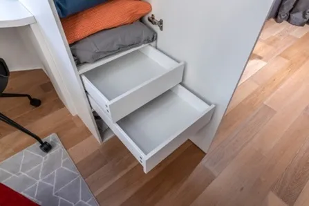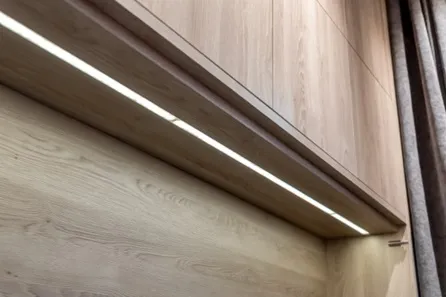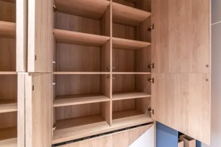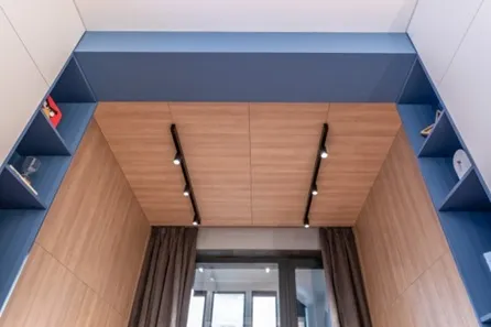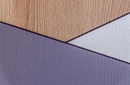 Все корпусные детали и фасады закрытых стеллажей над кроватями выполнены из ламинированных панелей с синхронной структурой «Дуб Гладстон» (программа FEELWOOD - структура материала идеально имитирует поверхность натурального дерева). Этими же панелями обшит потолок.