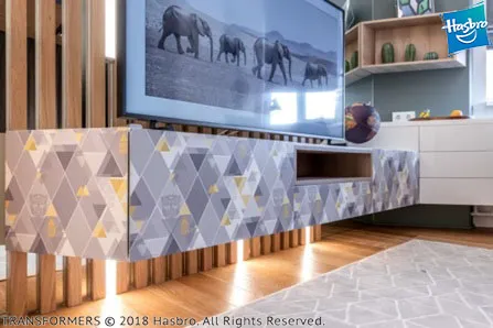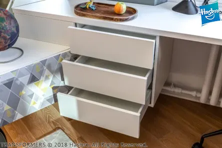На фасады и боковины тумбы под ТВ также нанесены геометрические узоры в стилистике автобота Бамблби, а сам герой изображен на дверце стеллажа над столом. Корпус всей мебели выполнен из ламинированной плиты «Алебастр». Фасады отделаны матовой белой эмалью. Задняя стенка открытых секций стеллажа, а также подвесной модуль выполнены в декоре «Дуб Гладстон». В столешнице у окна сделана специальная вентиляционная решетка, чтобы теплый воздух от радиатора проникал в комнату.
