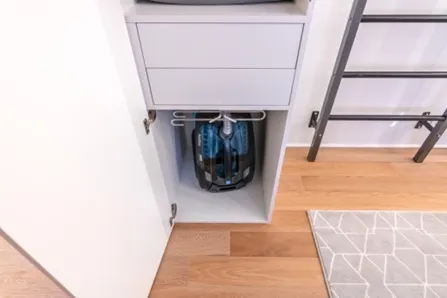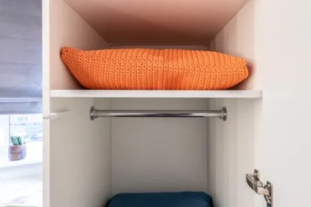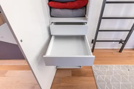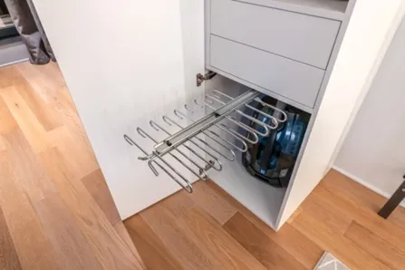 В шкафах расположили вешала для одежды и брюк, выдвижные ящики и множество полок.