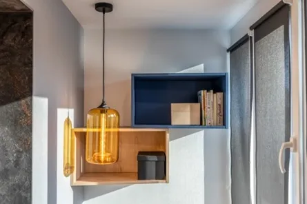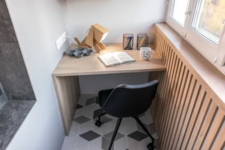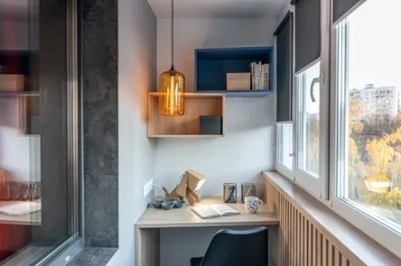 На балконе устроено второе рабочее место, состоящее из стола, стеллажа и подвесных модулей. Основной декор - «Дуб Гладстон». В столешницу встроен специальный сопроводитель проводов.
