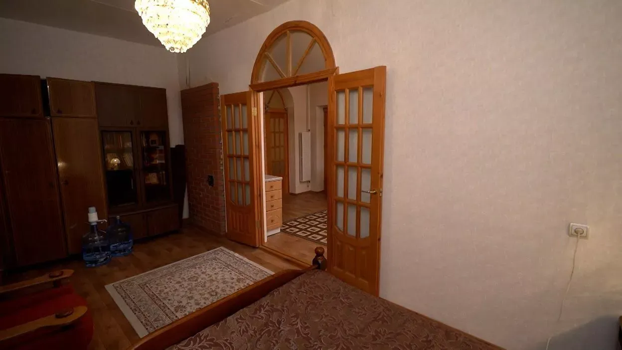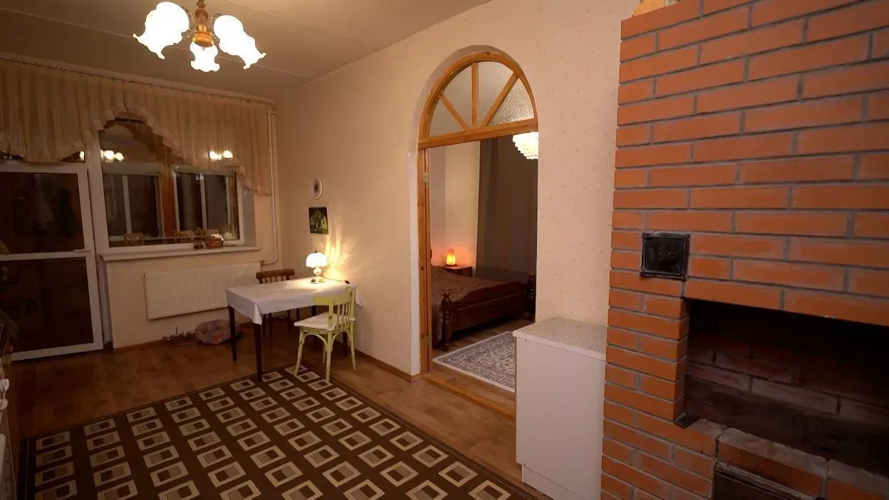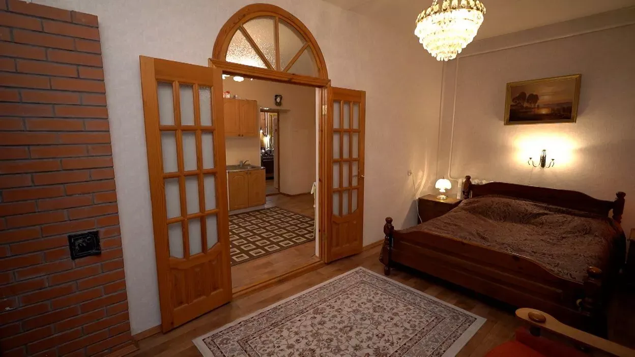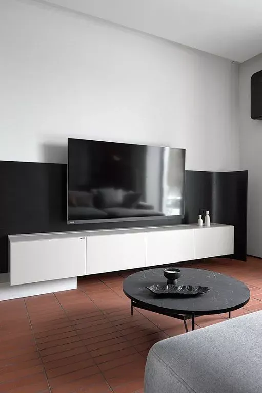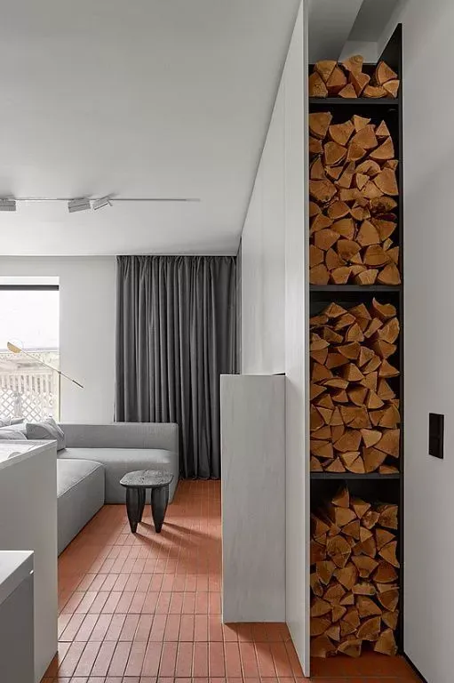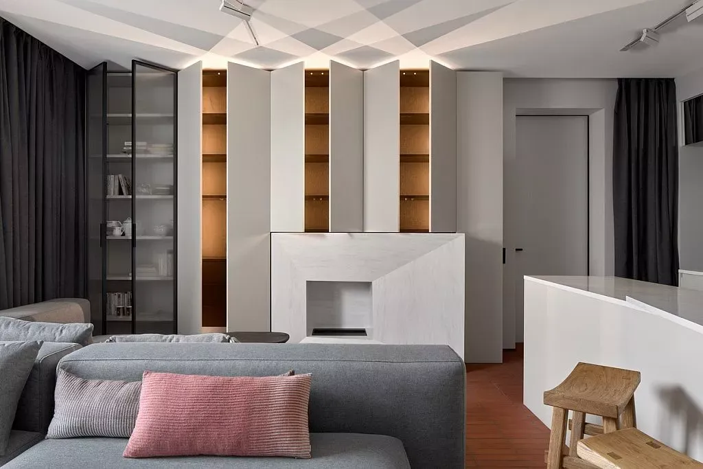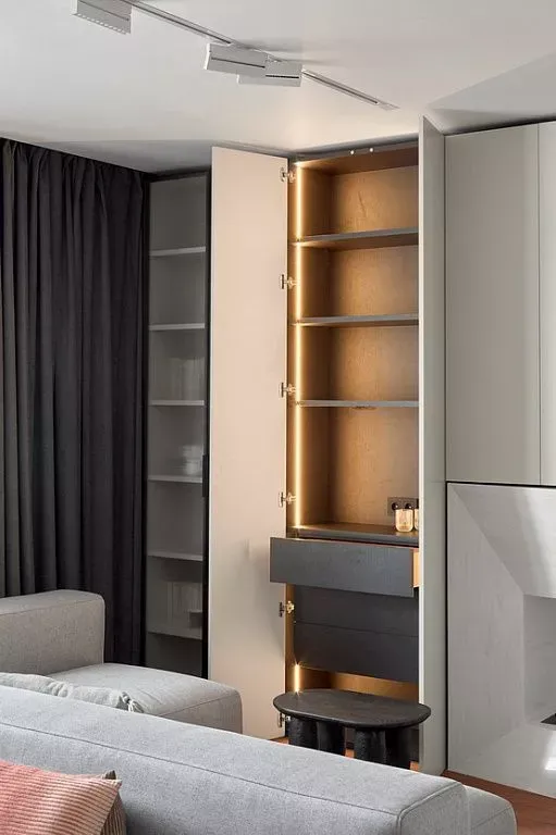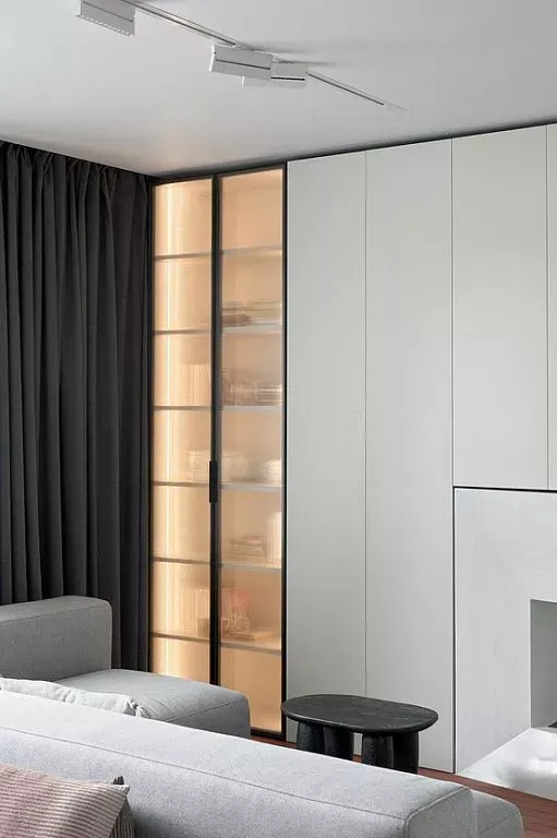 Из левого угла гостиной по стене вокруг камина расположилась функционально удобная и красивая стена. При высоте помещения 2700 мм (2,7 м) всегда непросто сделать мебель с длинным узким фасадом от пола до потолка.От «стеклянного» модуля вправо начинается блок из трёх двустворчатых шкафов, закрытых сплошными фасадами из МДФ в матовой эмали Туман. Левый блок закрыт высокими (2700) фасадами с установленными внутри стяжками-выпрямителями (специальной конструкцией для избежания коробления длинных фасадов), остальные два блока – без выпрямителей, т.к. значительно короче.