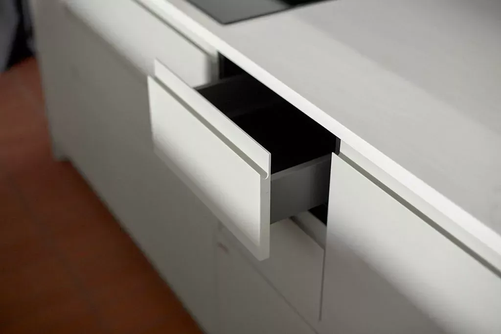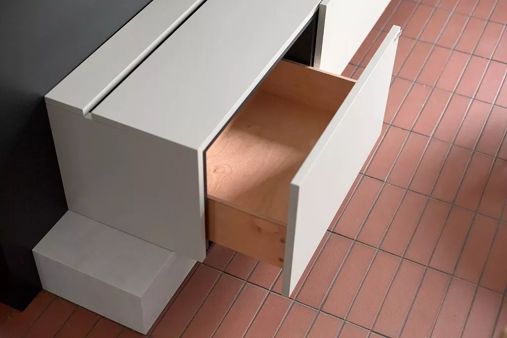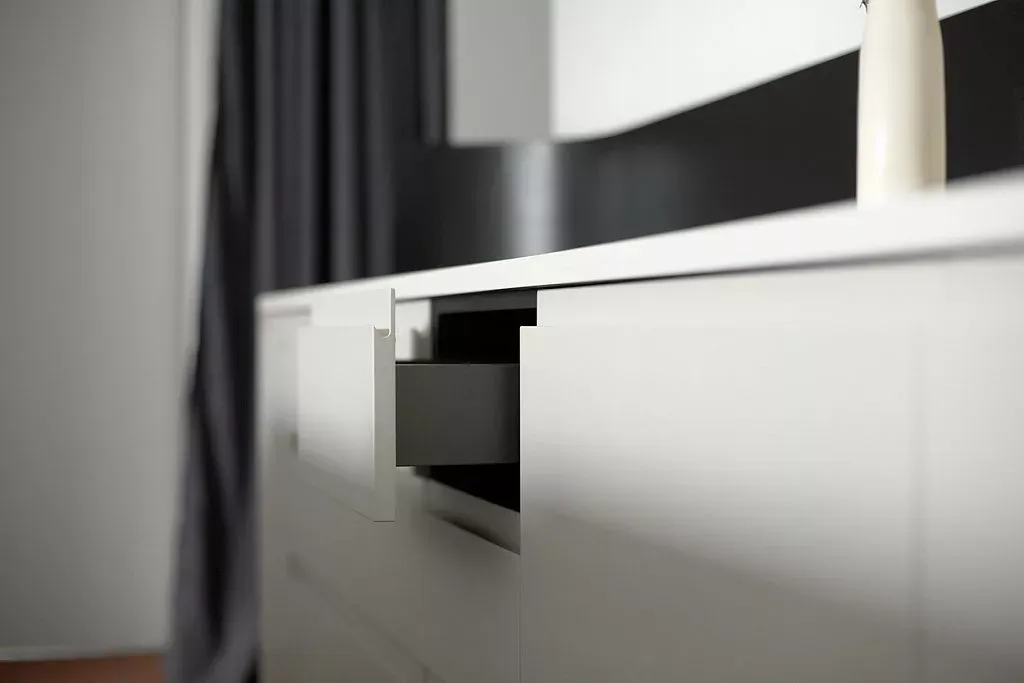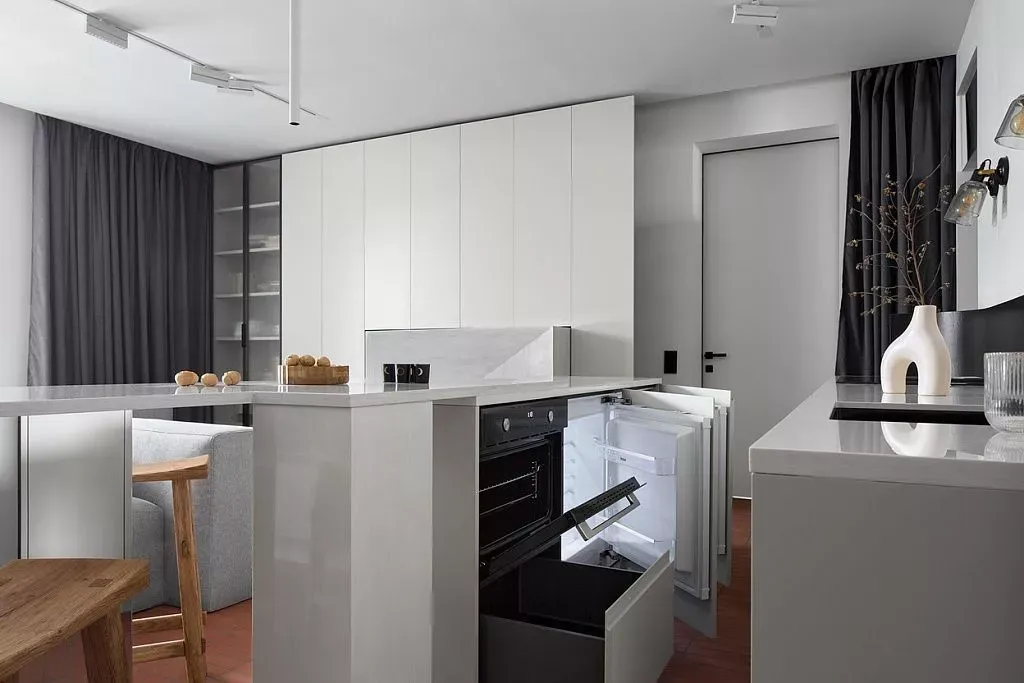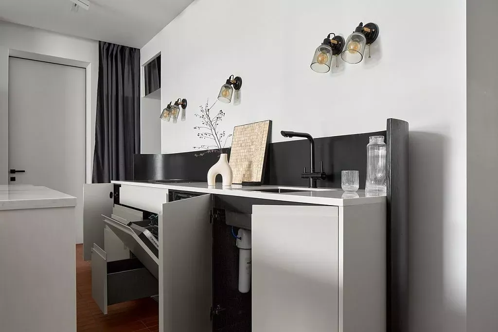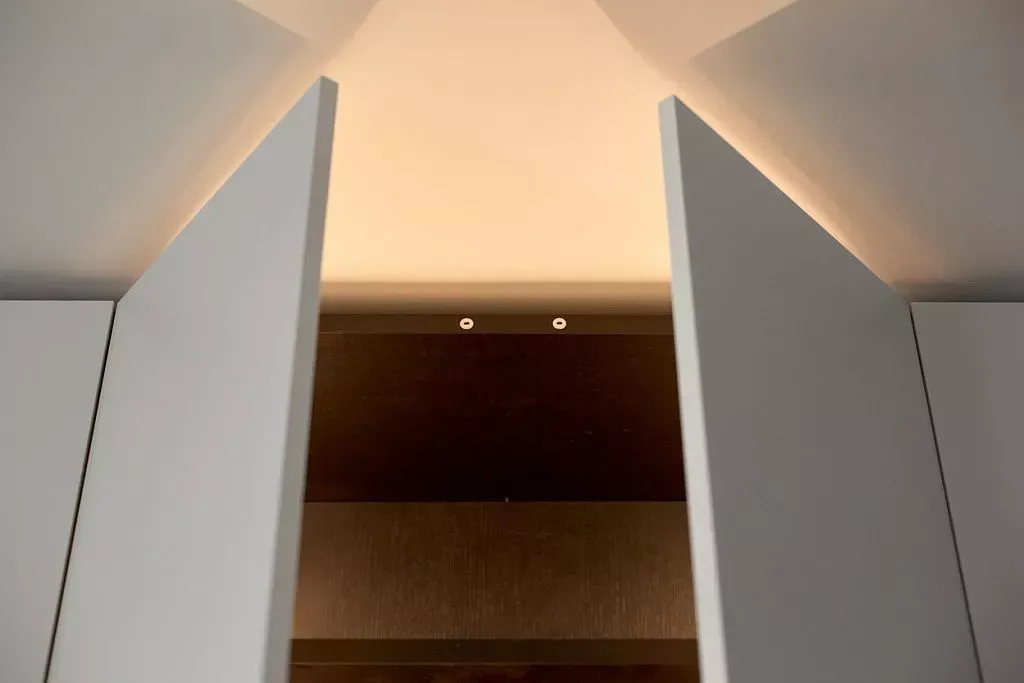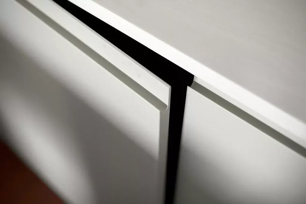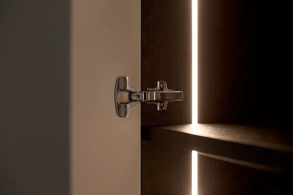 В левом блоке, помимо полок, есть отсек под мелкую бытовую технику (кофемашина или СВЧ-печь), а также 3 выдвижных ящика для мелочей. В среднем и правом блоках – только полки. Внутренности всех закрытых сплошными фасадами зон – ДСП Ситивуд Черный. По периметру каждой зоны в стенки интегрирована LED-подсветка (врезной профиль) с теплой гаммой 3000К. Включение подсветки в каждом модуле происходит индивидуально, т.к. за фасадами установлены датчики открывания.