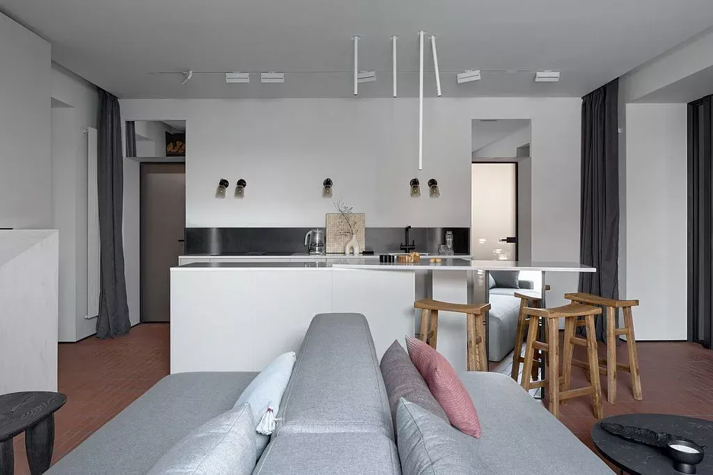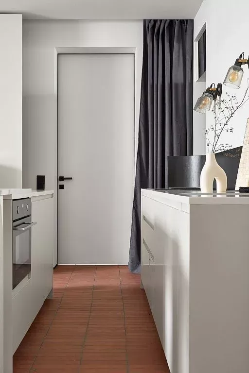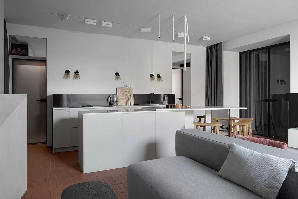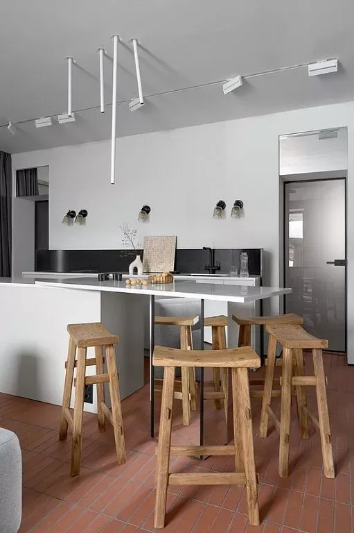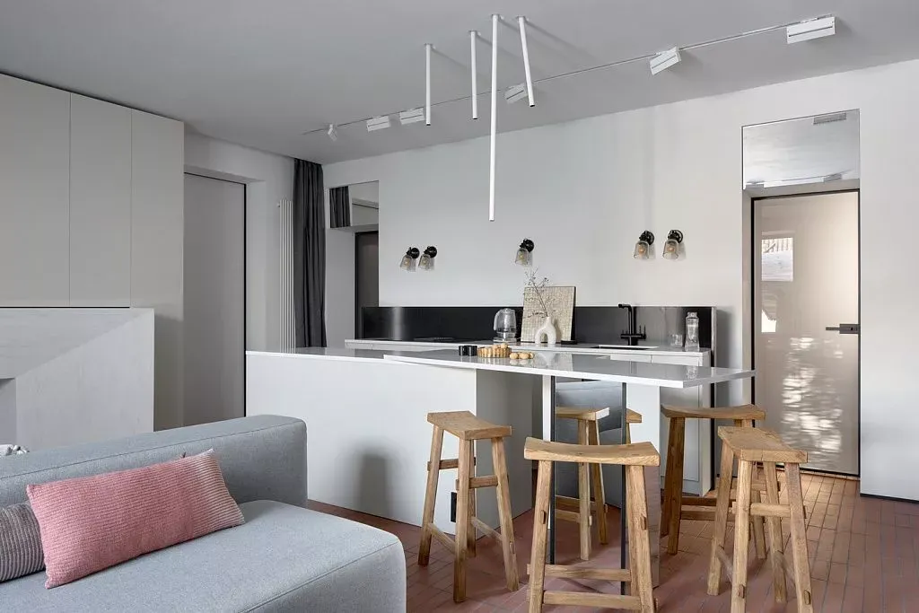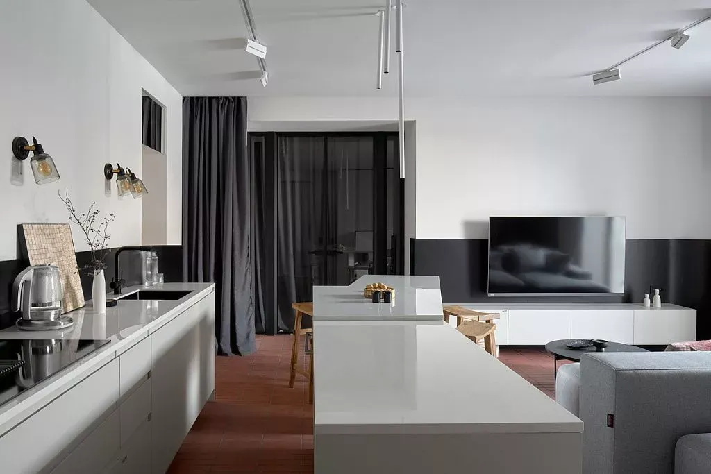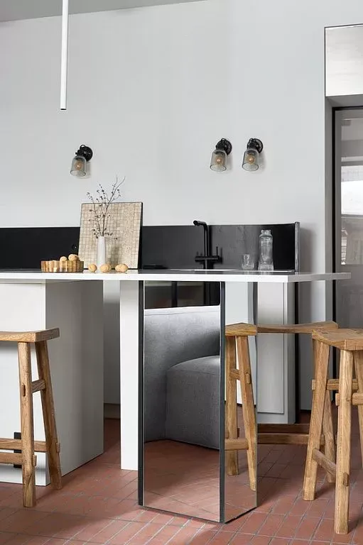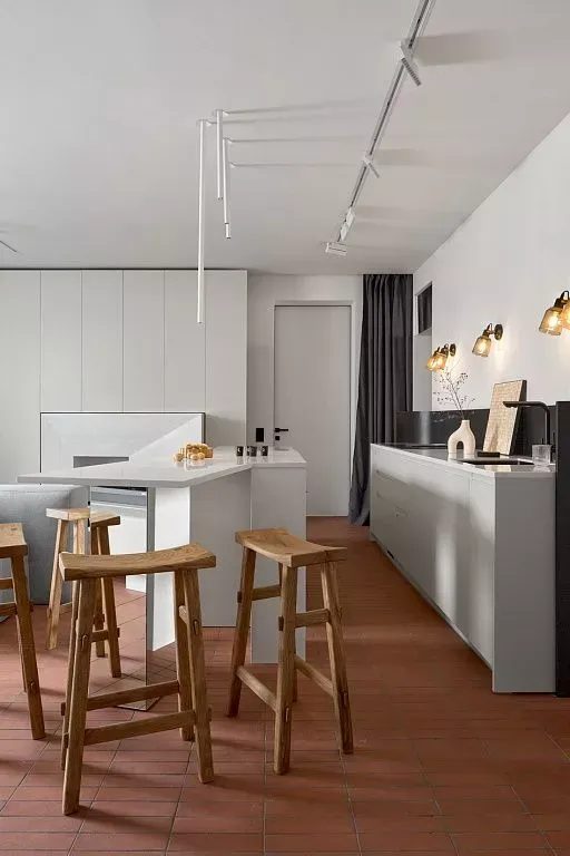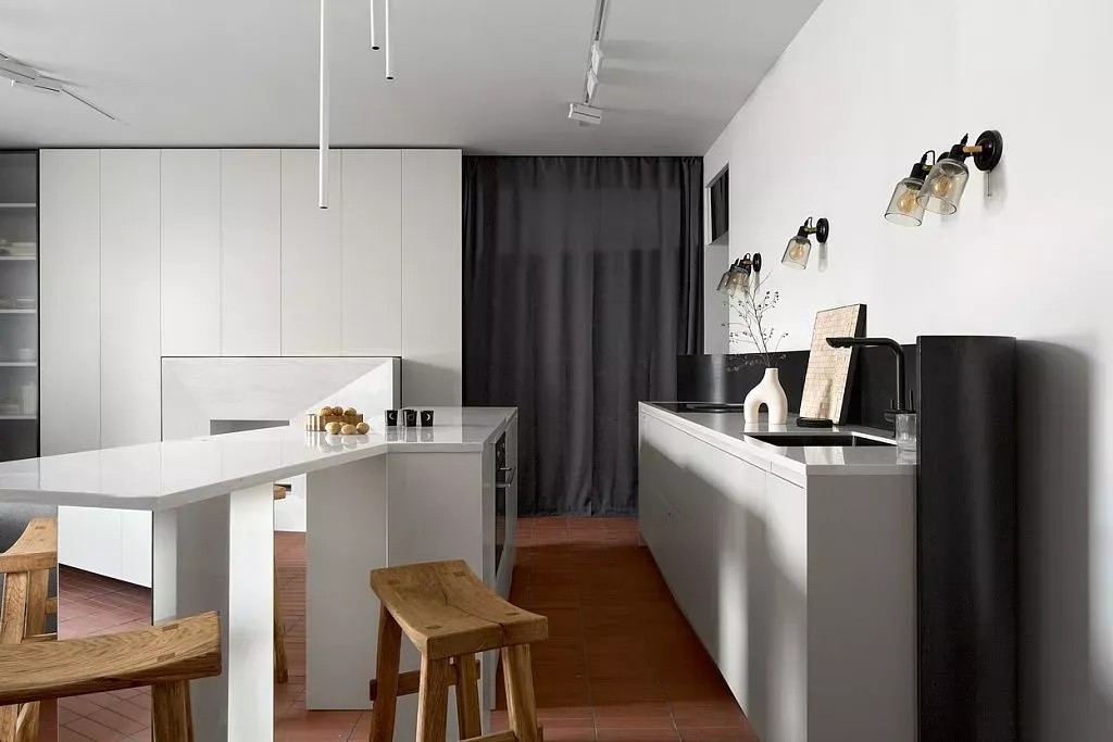 В левом блоке, помимо полок, есть отсек под мелкую бытовую технику (кофемашина или СВЧ-печь), а также 3 выдвижных ящика для мелочей. В среднем и правом блоках – только полки. Внутренности всех закрытых сплошными фасадами зон – ДСП Ситивуд Черный. По периметру каждой зоны в стенки интегрирована LED-подсветка (врезной профиль) с теплой гаммой 3000К. Включение подсветки в каждом модуле происходит индивидуально, т.к. за фасадами установлены датчики открывания.