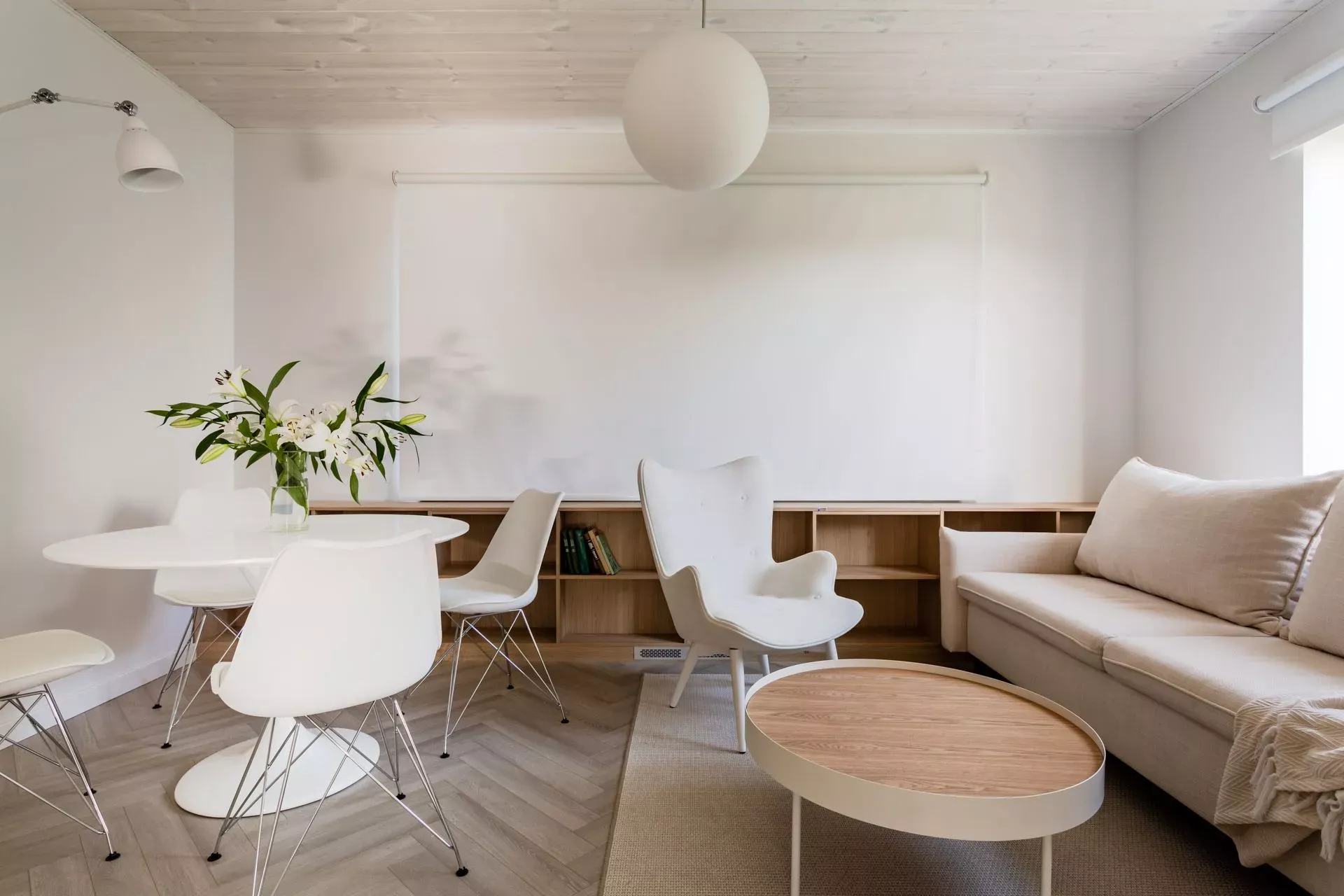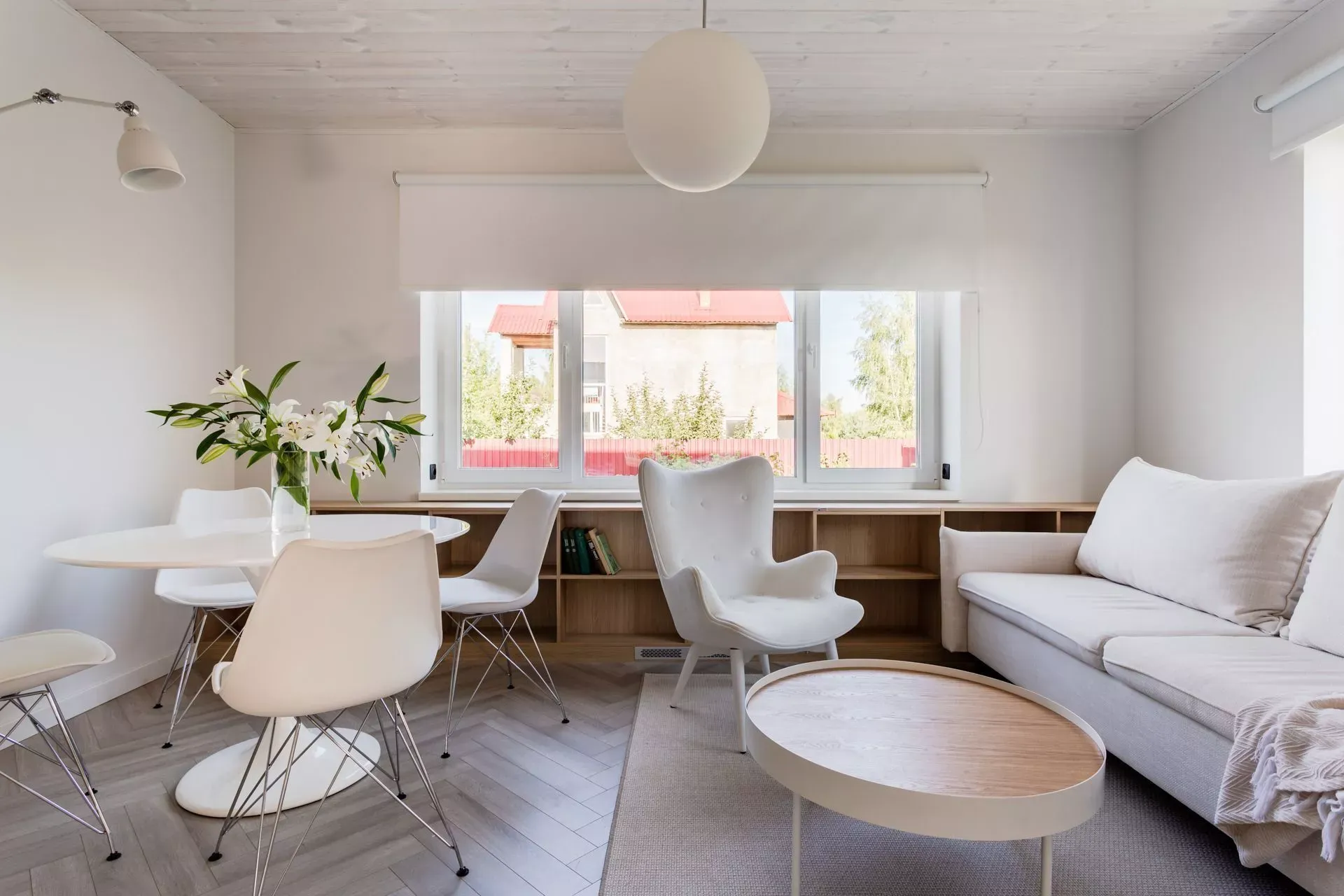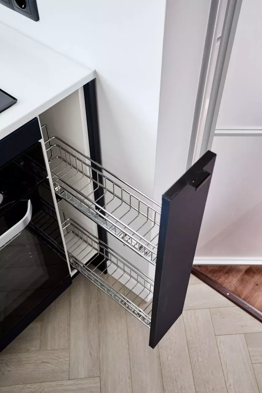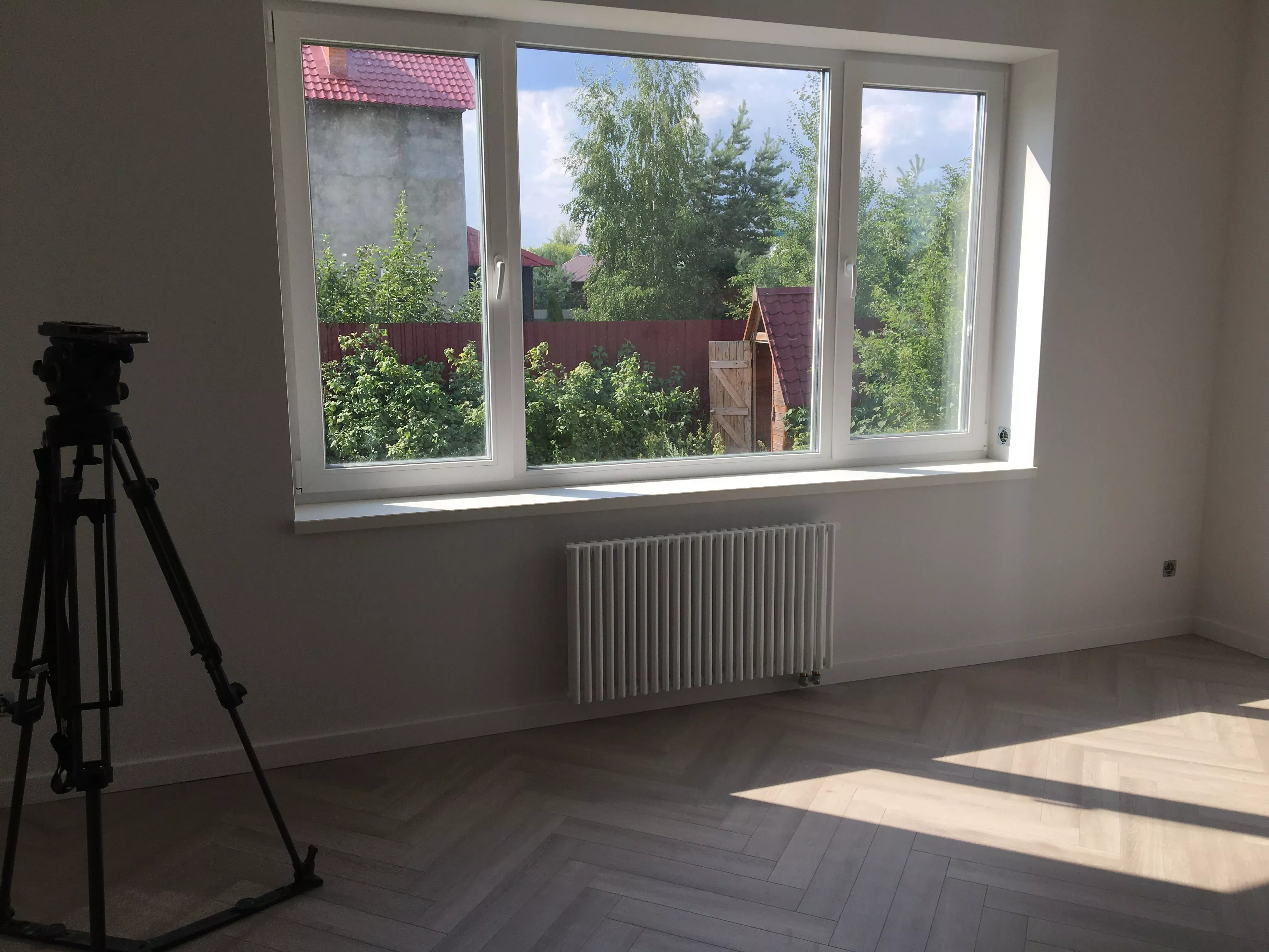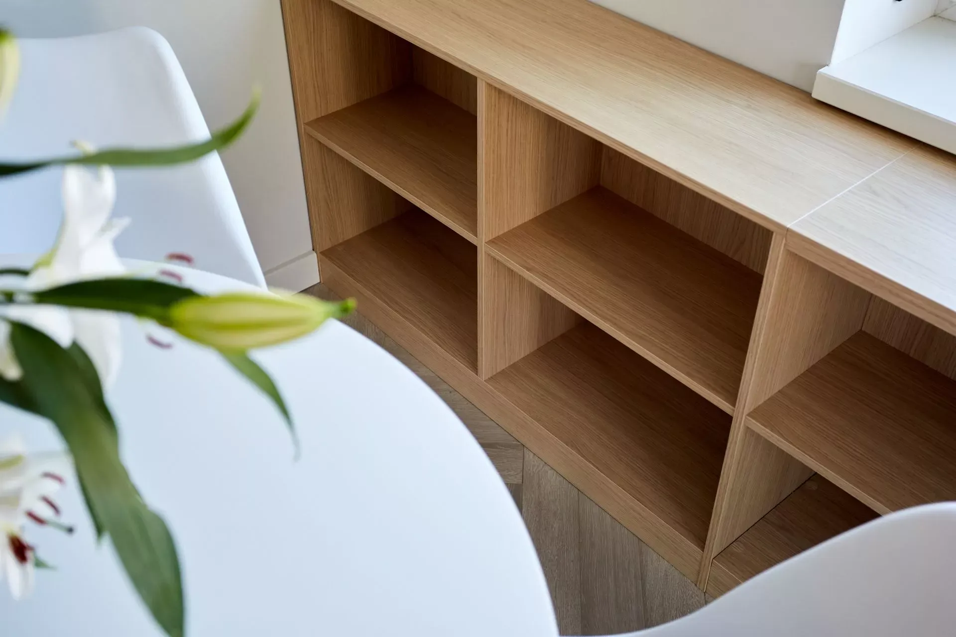 Во всю длину стены смонтировали стеллаж по проекту архитектора. Учли высоты окна, расположение и размеры радиатора отопления, скрытого за стеллажом под окном. Специальная конструкция стеллажа позволила не только грамотно обойти радиатор, но и оставить его работоспособным (снизу решётки для входа холодного воздуха, на столешнице такие же под окном - для выхода тёплого воздуха). Стеллаж полностью, включая цоколь, выполнен из 16-мм ДСП EGGER в декоре Дуб Винченца. Скандинавский стиль гостиной сохранён.
