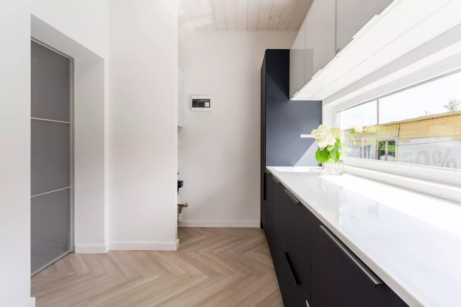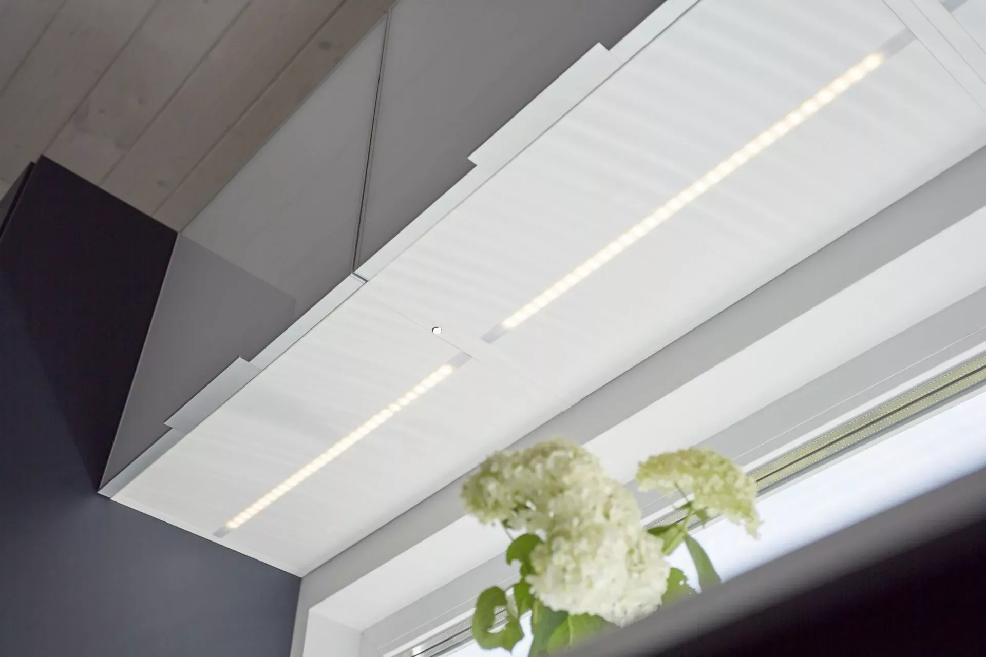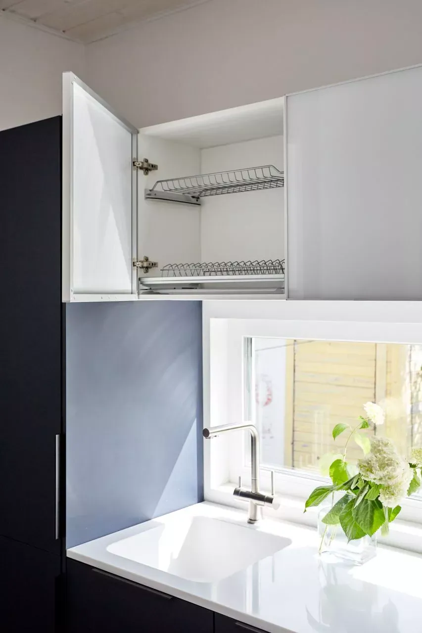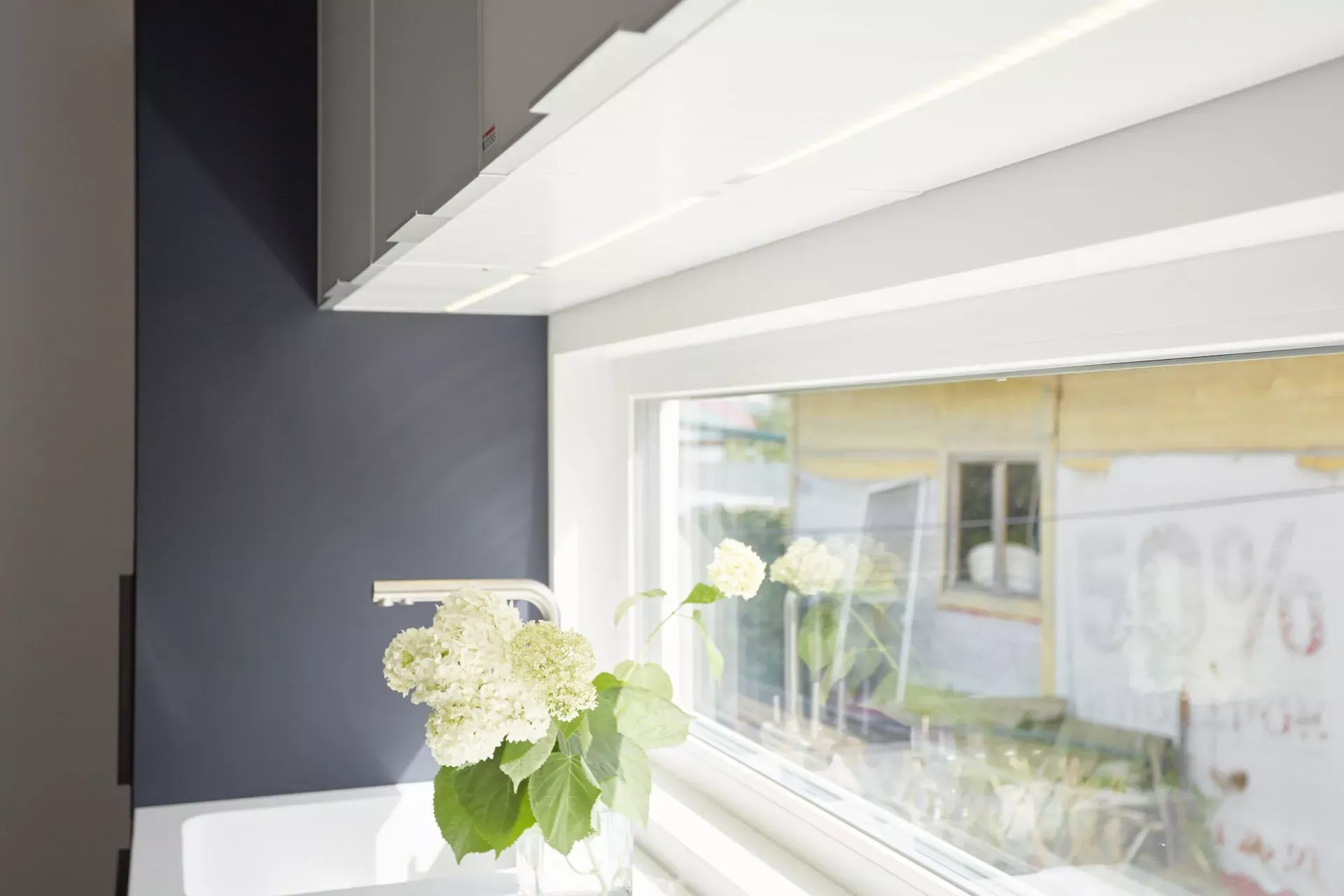 Во всю длину стены смонтировали стеллаж по проекту архитектора. Учли высоты окна, расположение и размеры радиатора отопления, скрытого за стеллажом под окном. Специальная конструкция стеллажа позволила не только грамотно обойти радиатор, но и оставить его работоспособным (снизу решётки для входа холодного воздуха, на столешнице такие же под окном - для выхода тёплого воздуха). Стеллаж полностью, включая цоколь, выполнен из 16-мм ДСП EGGER в декоре Дуб Винченца. Скандинавский стиль гостиной сохранён.