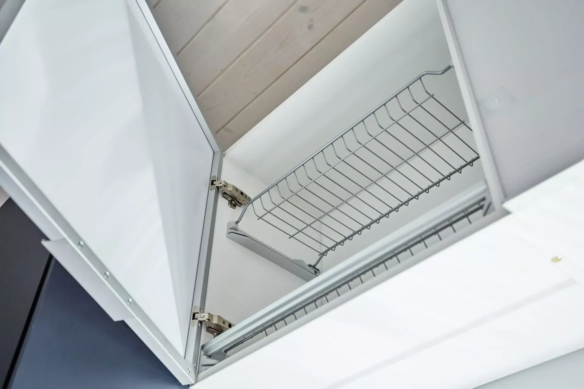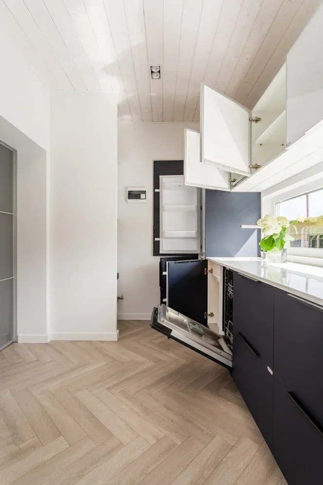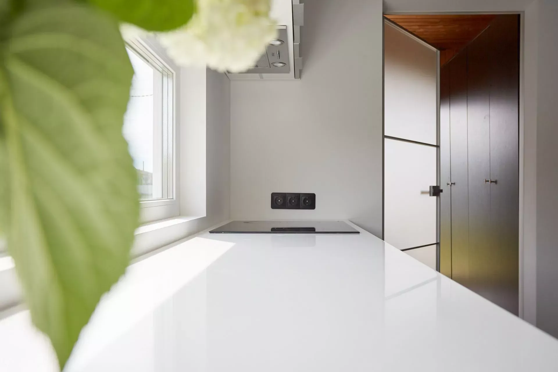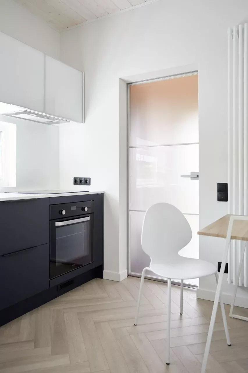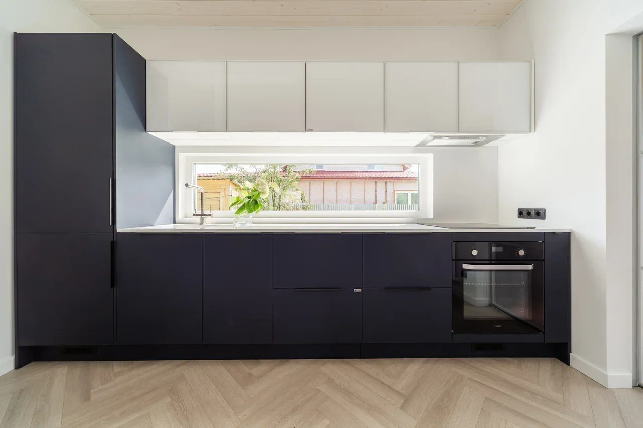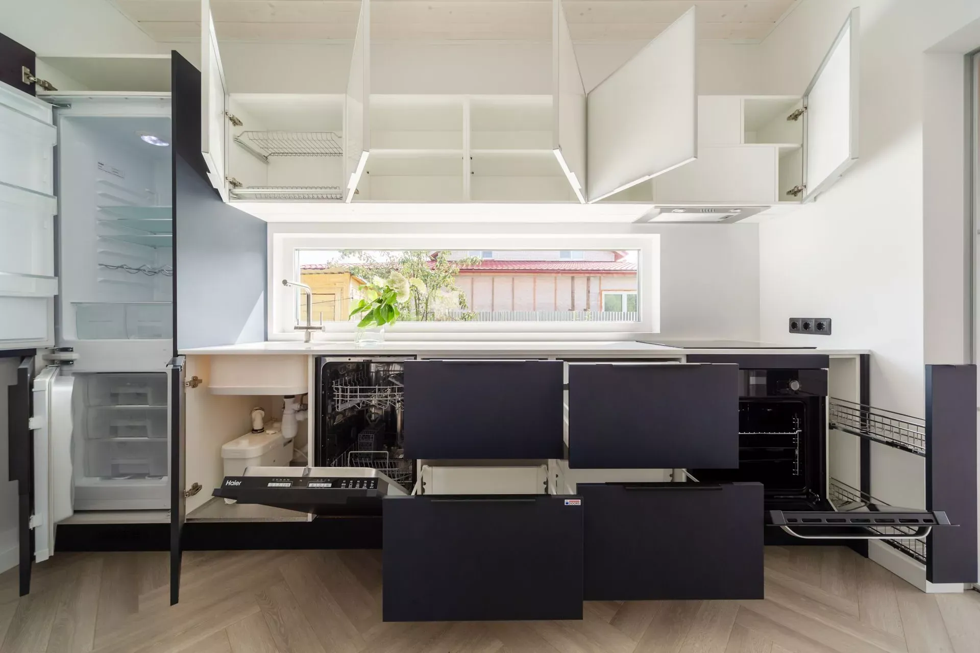 Во всю длину стены смонтировали стеллаж по проекту архитектора. Учли высоты окна, расположение и размеры радиатора отопления, скрытого за стеллажом под окном. Специальная конструкция стеллажа позволила не только грамотно обойти радиатор, но и оставить его работоспособным (снизу решётки для входа холодного воздуха, на столешнице такие же под окном - для выхода тёплого воздуха). Стеллаж полностью, включая цоколь, выполнен из 16-мм ДСП EGGER в декоре Дуб Винченца. Скандинавский стиль гостиной сохранён.