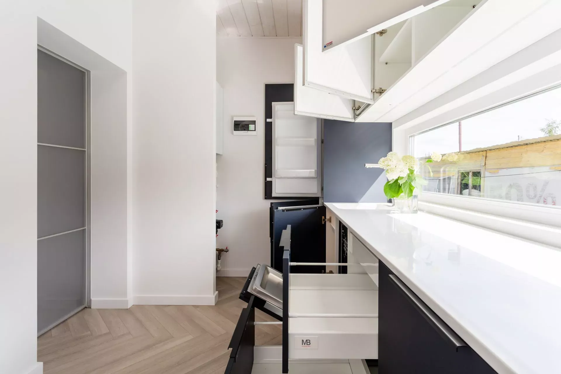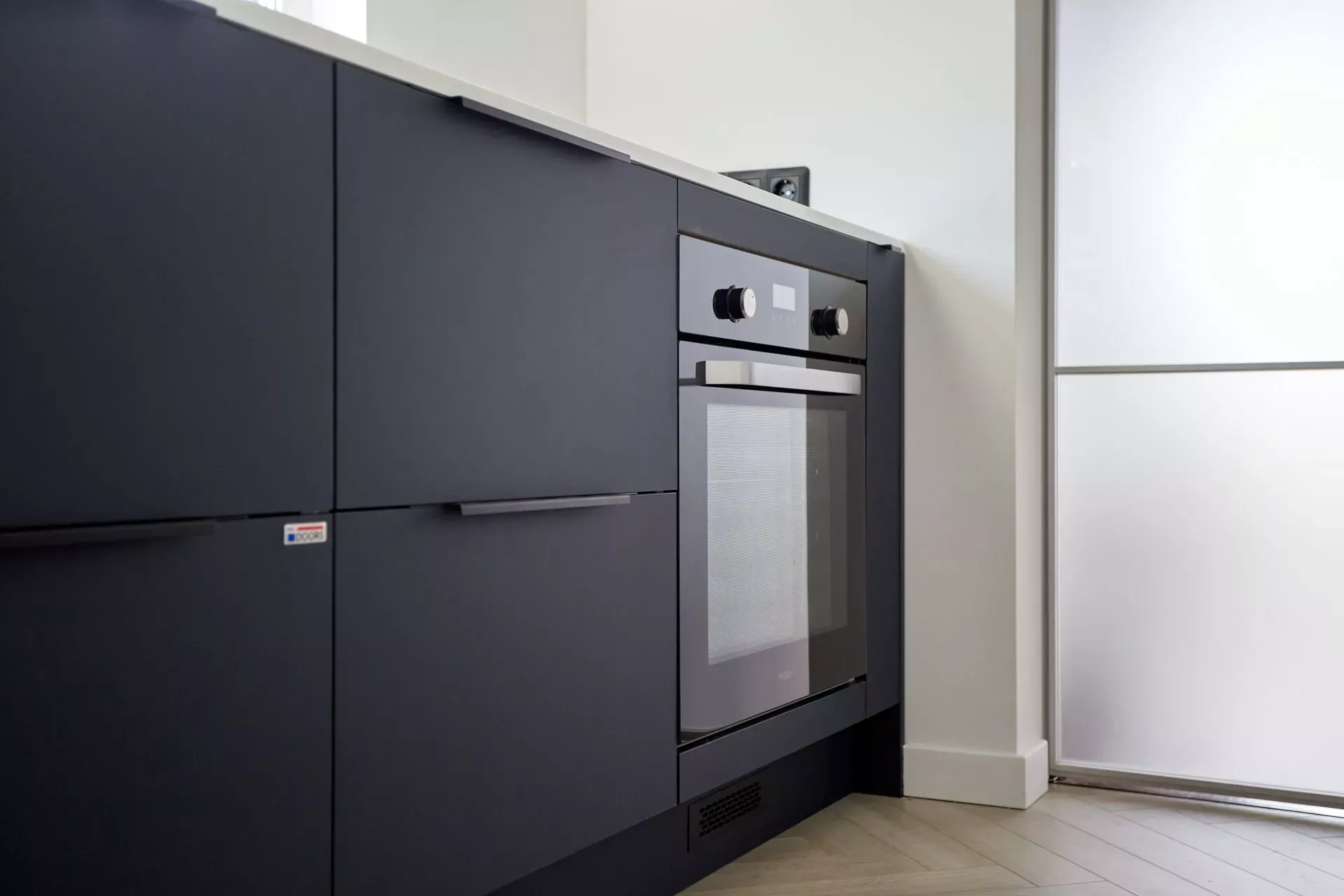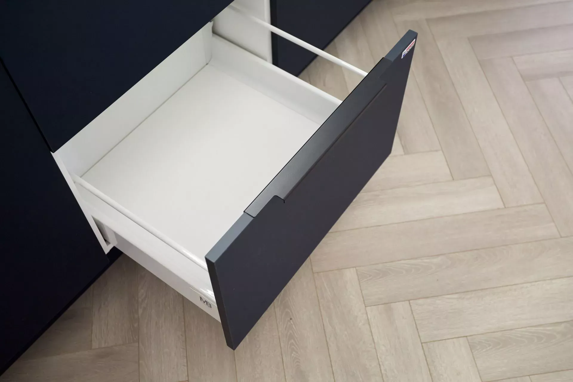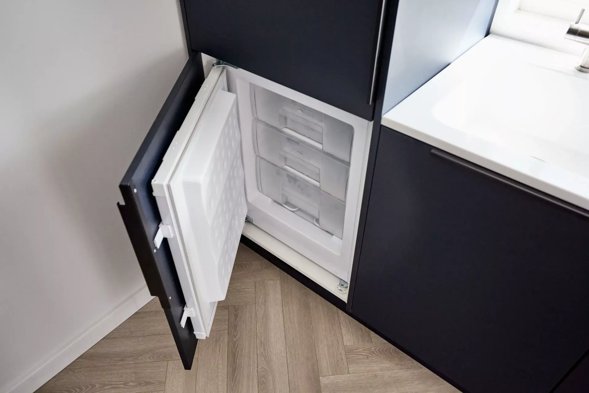 Во всю длину стены смонтировали стеллаж по проекту архитектора. Учли высоты окна, расположение и размеры радиатора отопления, скрытого за стеллажом под окном. Специальная конструкция стеллажа позволила не только грамотно обойти радиатор, но и оставить его работоспособным (снизу решётки для входа холодного воздуха, на столешнице такие же под окном - для выхода тёплого воздуха). Стеллаж полностью, включая цоколь, выполнен из 16-мм ДСП EGGER в декоре Дуб Винченца. Скандинавский стиль гостиной сохранён.