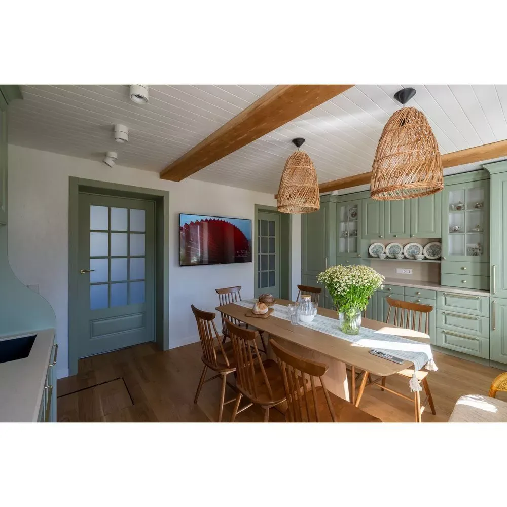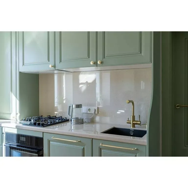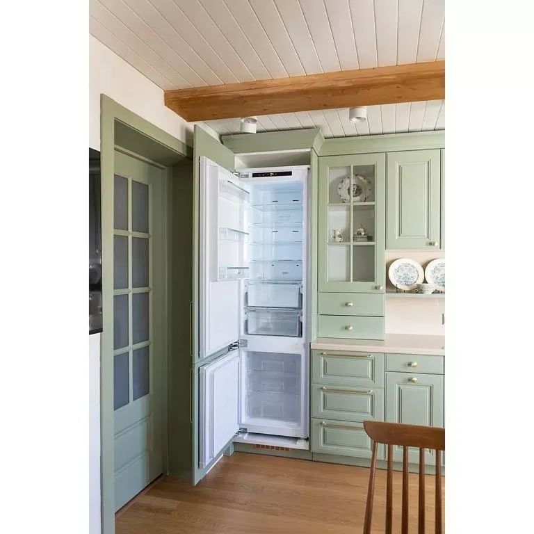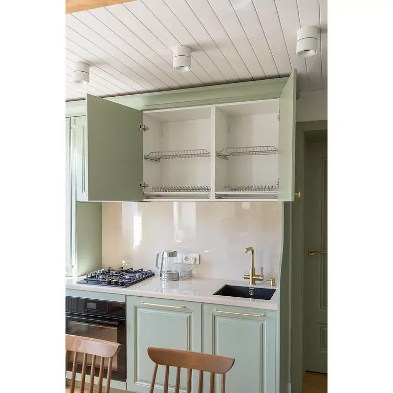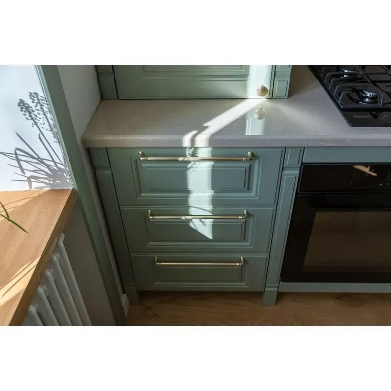 Напротив собрали рабочую зону с функциональным хранением и техникой, которую решено было тщательно скрывать за фасадами. Мойку от входа отделили фигурной панелью, котел и трубы спрятали в пенале. Кроме того, к системам хранения добавили еще больше ящиков и полок. При этом для небольших дверец предусмотрели ручки-кнопки, для более широких – ручки-рейлинги. Все в цвете латунь.