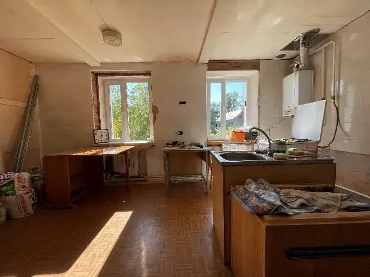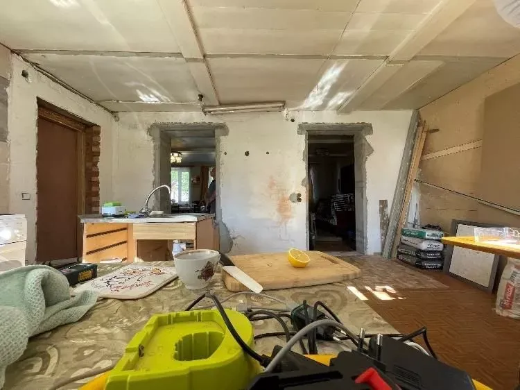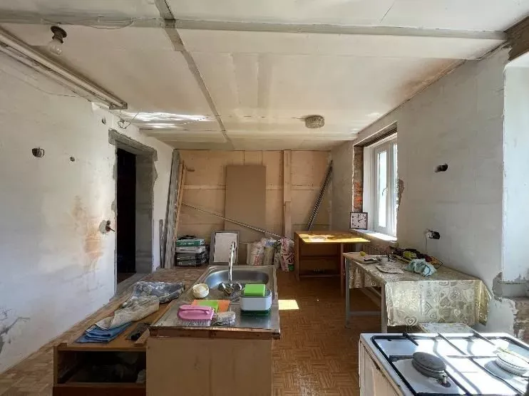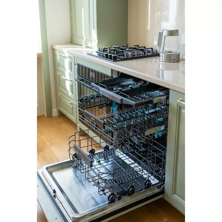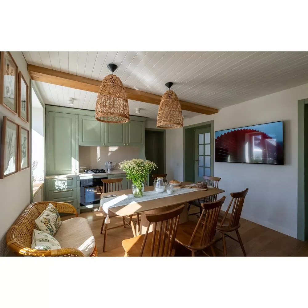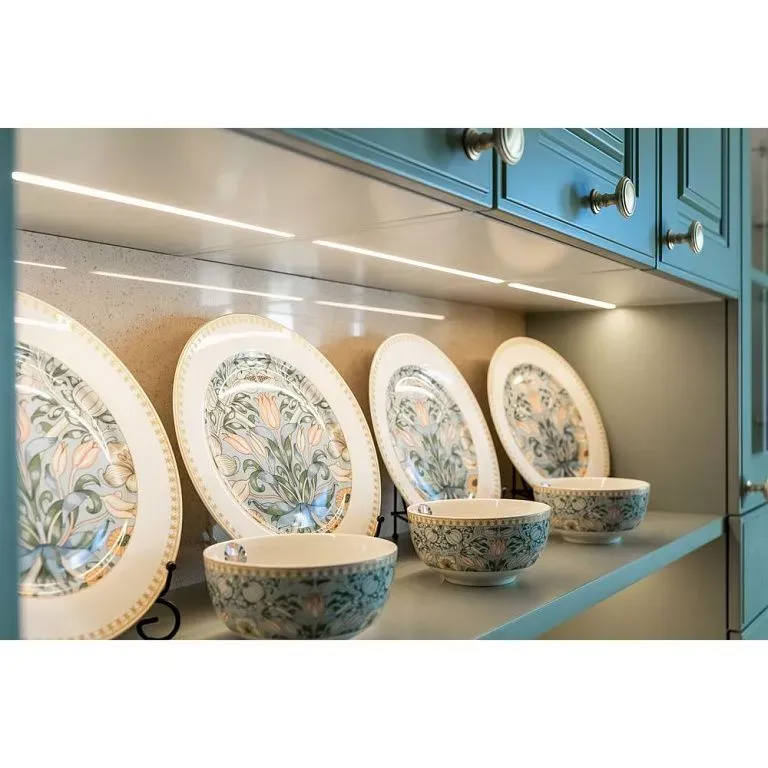 Напротив собрали рабочую зону с функциональным хранением и техникой, которую решено было тщательно скрывать за фасадами. Мойку от входа отделили фигурной панелью, котел и трубы спрятали в пенале. Кроме того, к системам хранения добавили еще больше ящиков и полок. При этом для небольших дверец предусмотрели ручки-кнопки, для более широких – ручки-рейлинги. Все в цвете латунь.