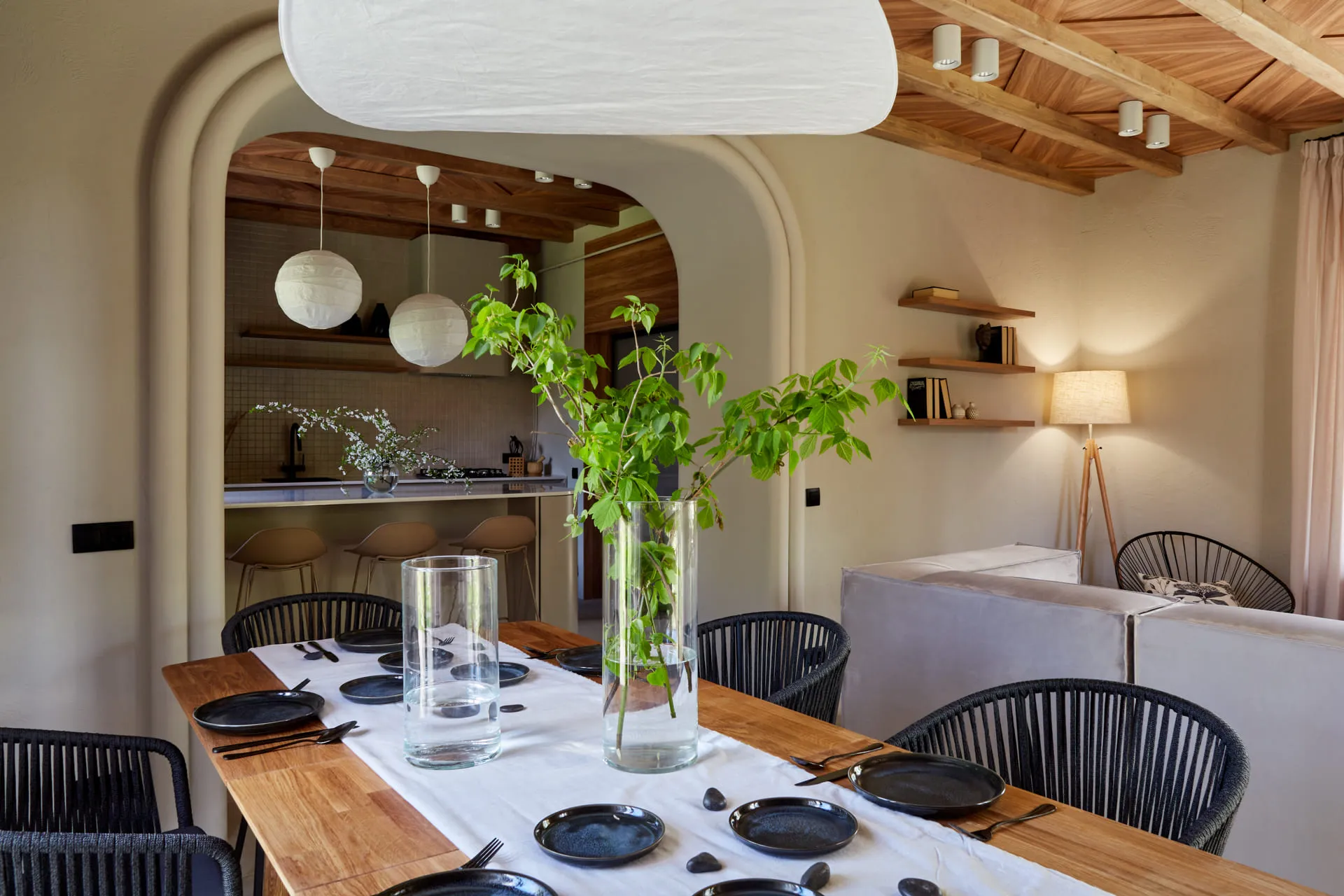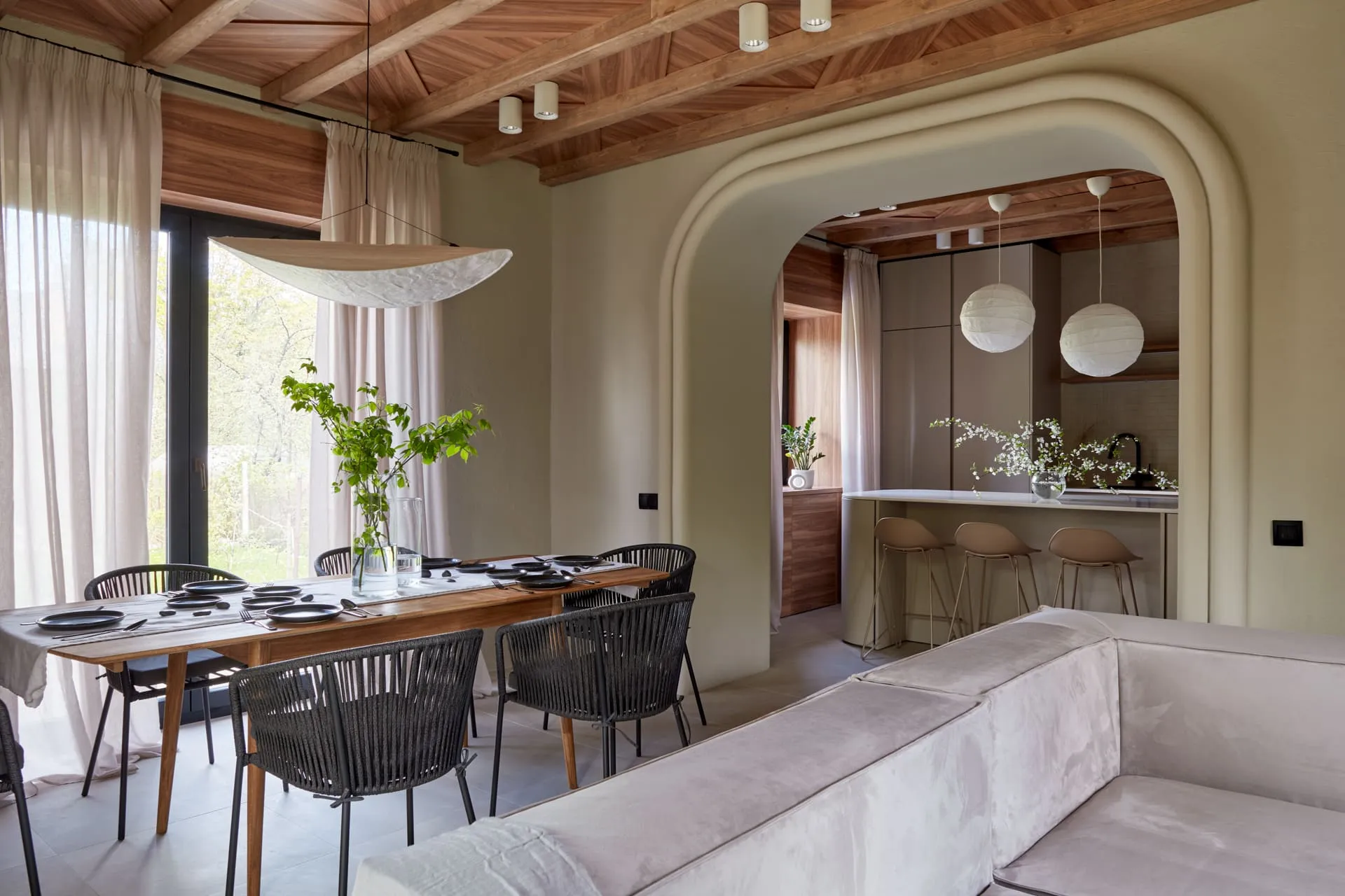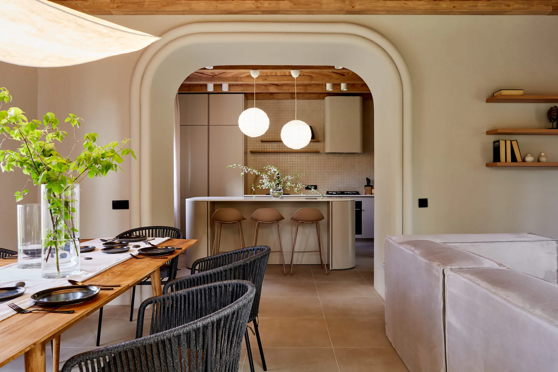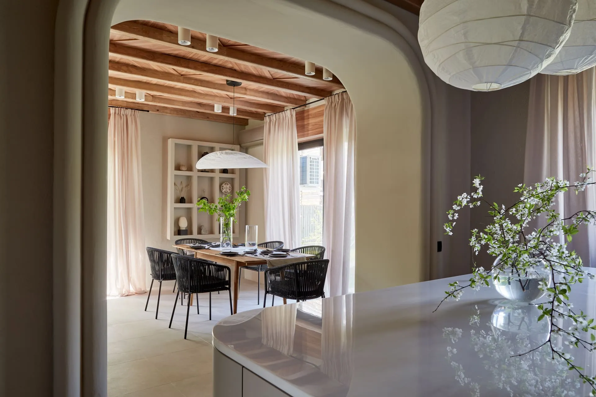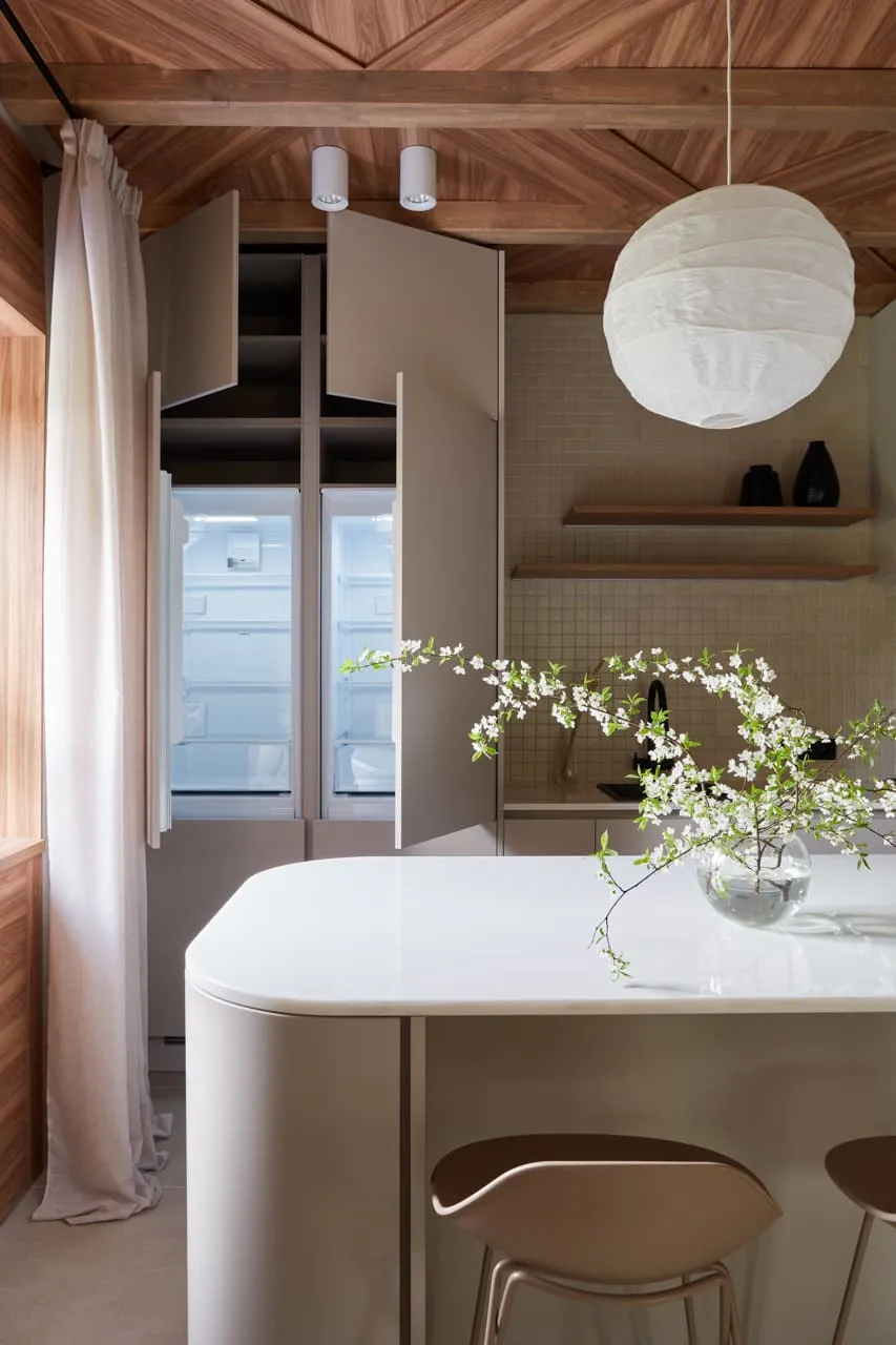 Задача автора проекта - сделать с помощью Mr.Doors кухню-гостиную удобной, но в первую очередь уютной. Кухня будет отделена от коридора проёмом со сдвижными дверьми, но останется на привычном нашим героям месте. В компоновке кухни появится большой двухкамерный холодильник, мойка и варочная панель займут удобные для готовки места, а площадь рабочих поверхностей существенно увеличит кухонный остров необычной округлой формы, которая будет задавать траекторию движения в комнате.