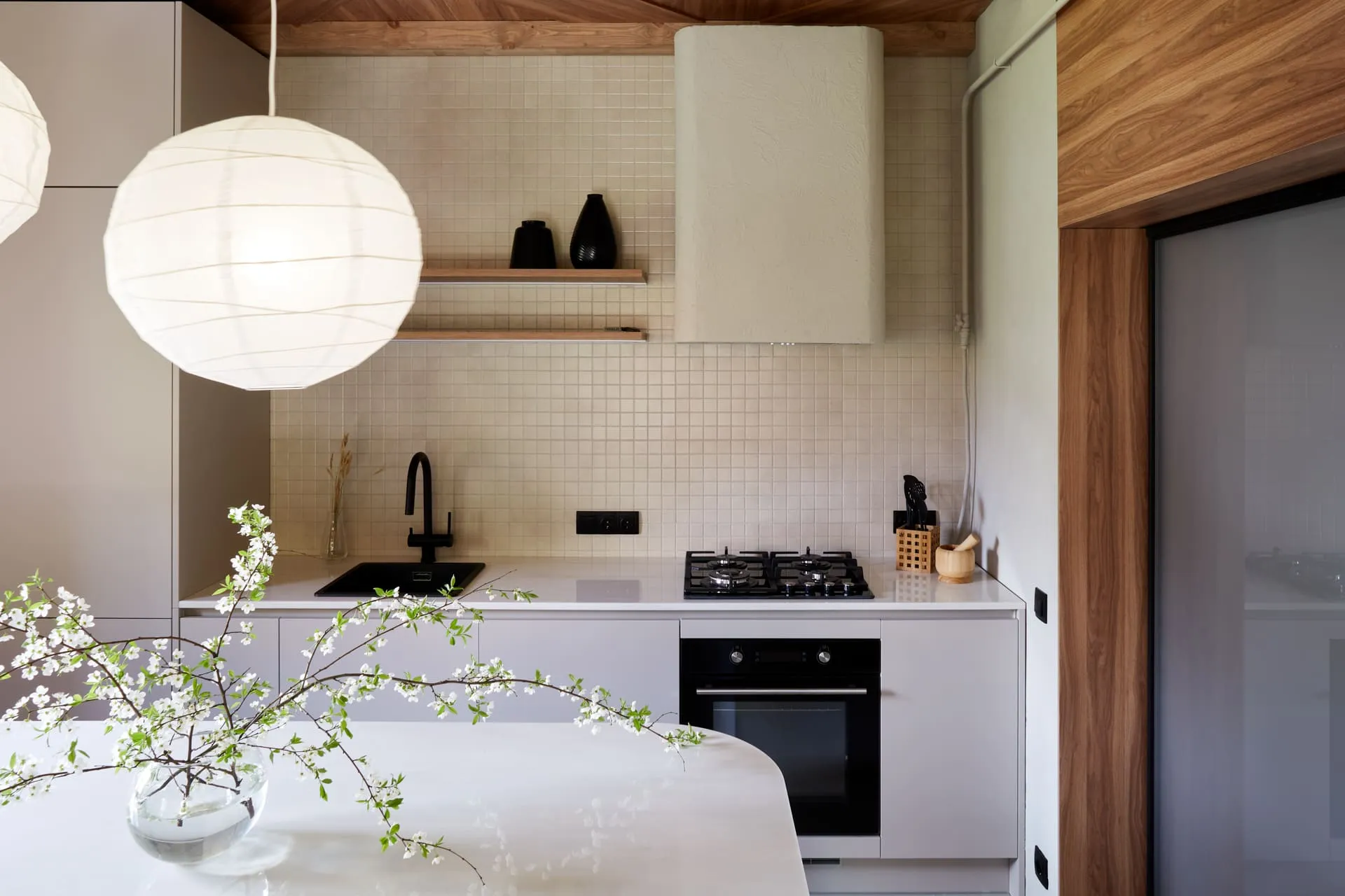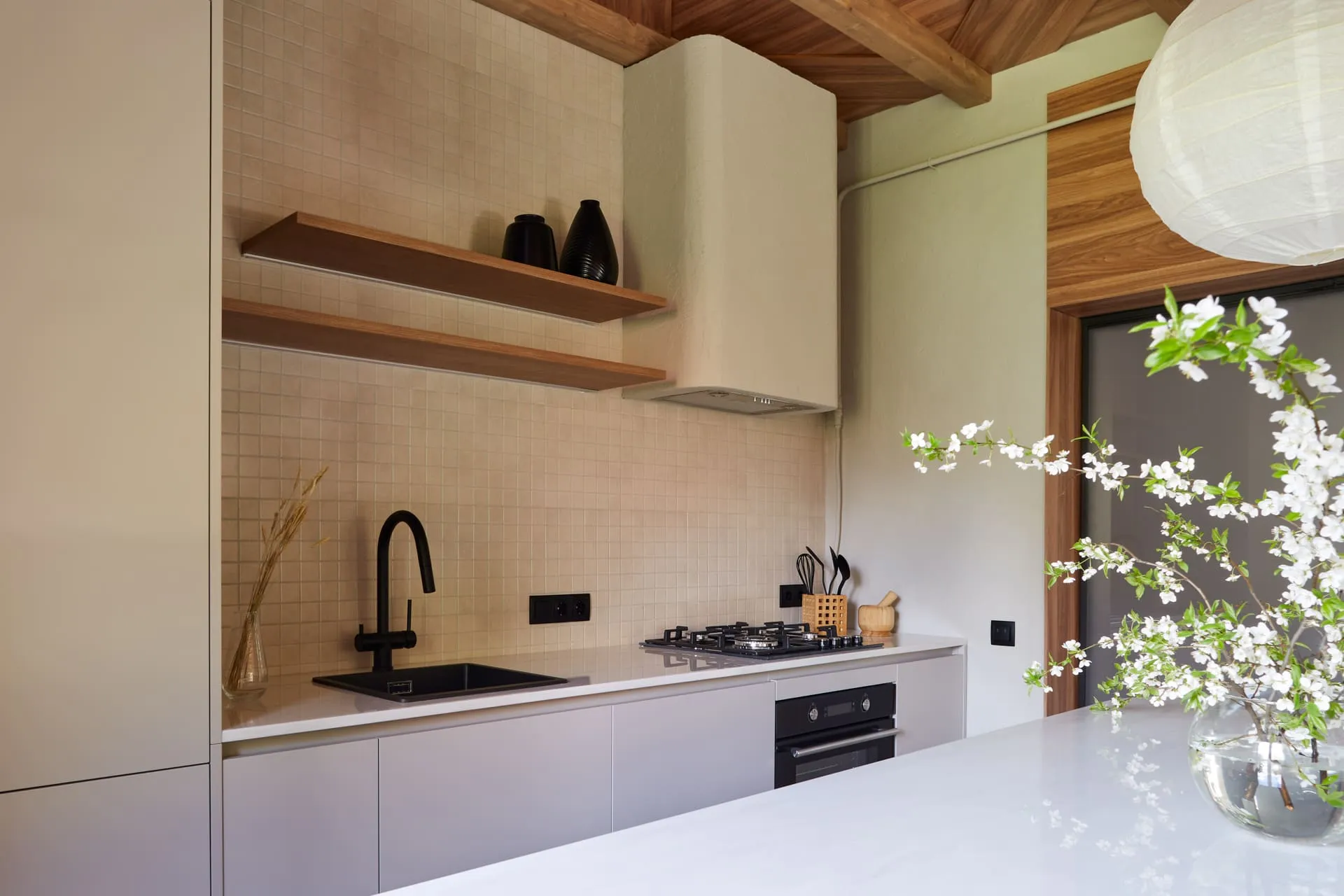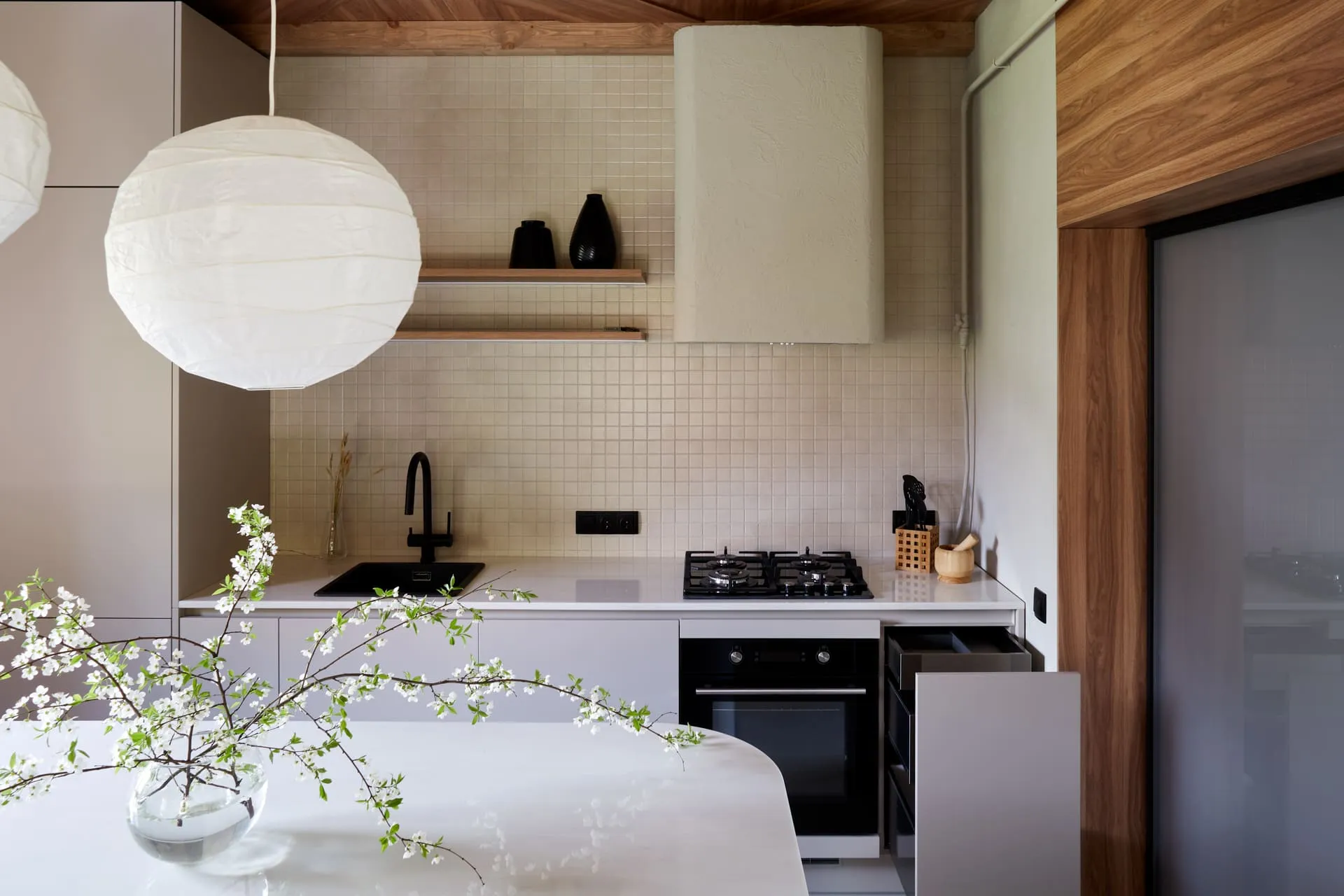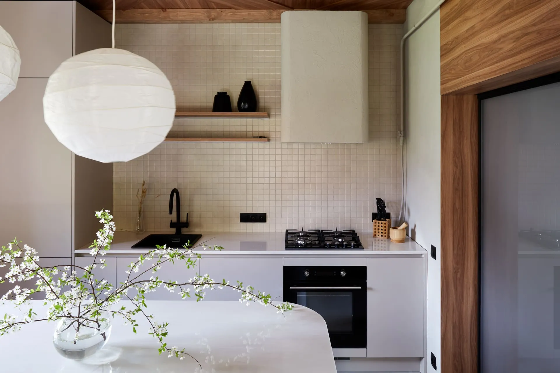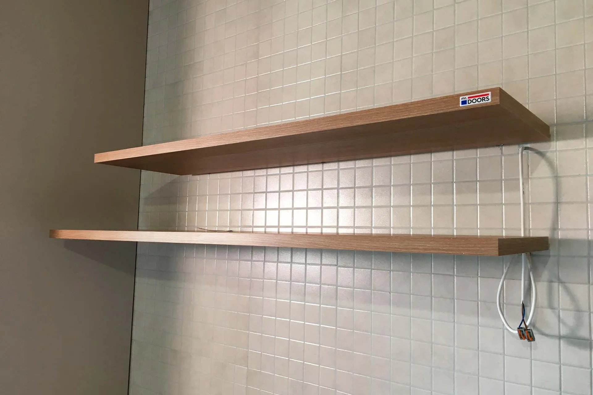 Столешница тонкая 20 мм (в тренде) из искусственного камня Грандекс декора Hazel Flow светло-ореховых оттенков, сделана на производстве Mr.Doors. В столешницу встроена мойка и газовая варочная панель. Над столешницей смонтированы две консольные полки из 25-мм ДСП в декоре Вишня Бренсон.