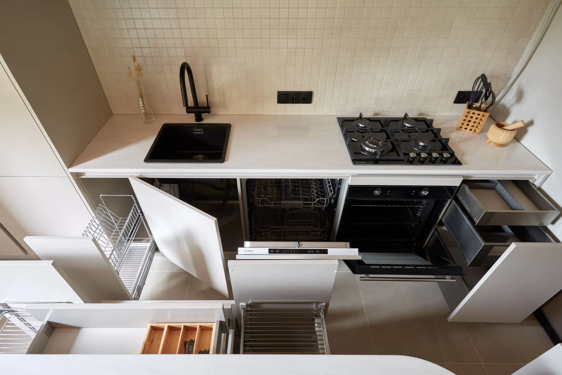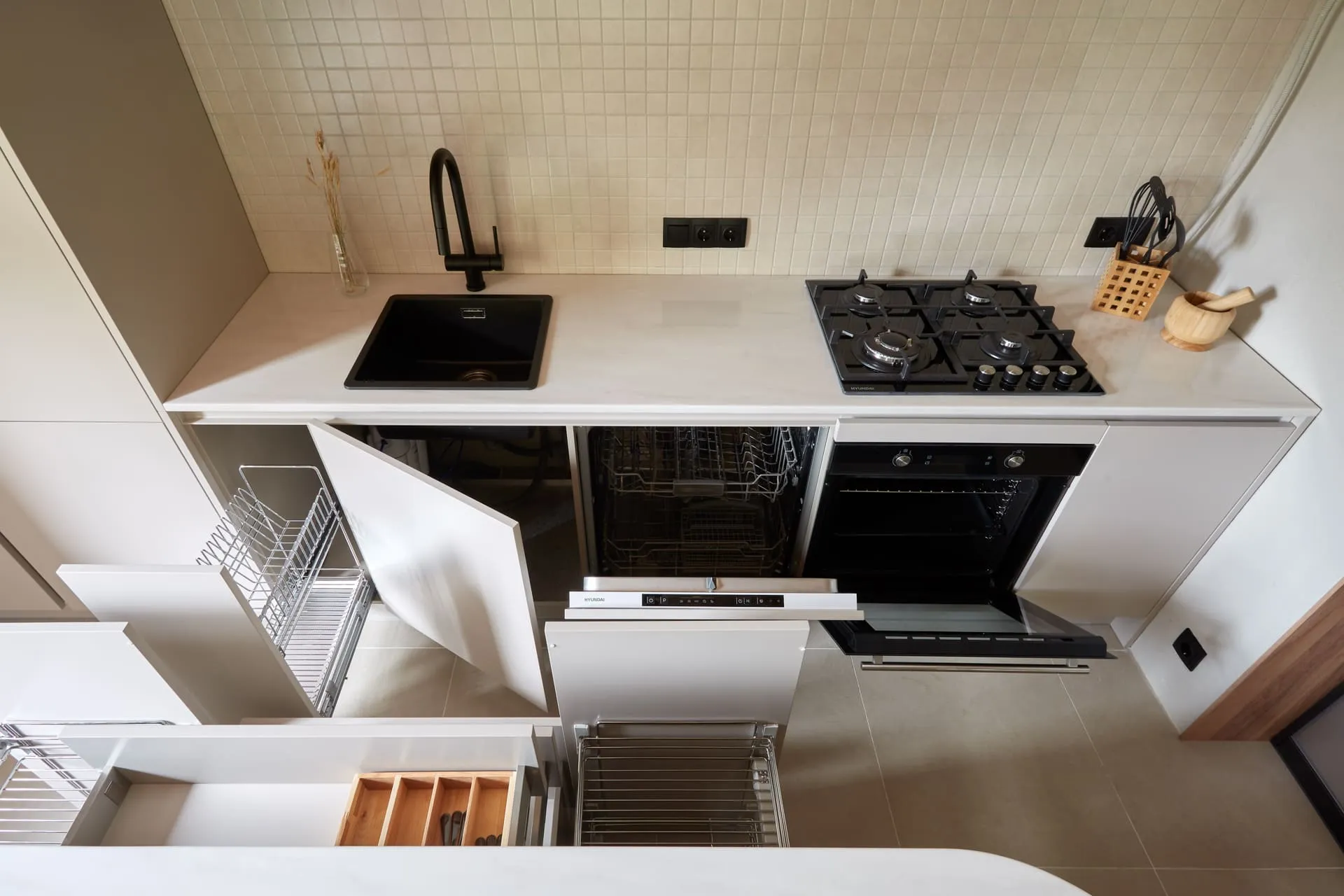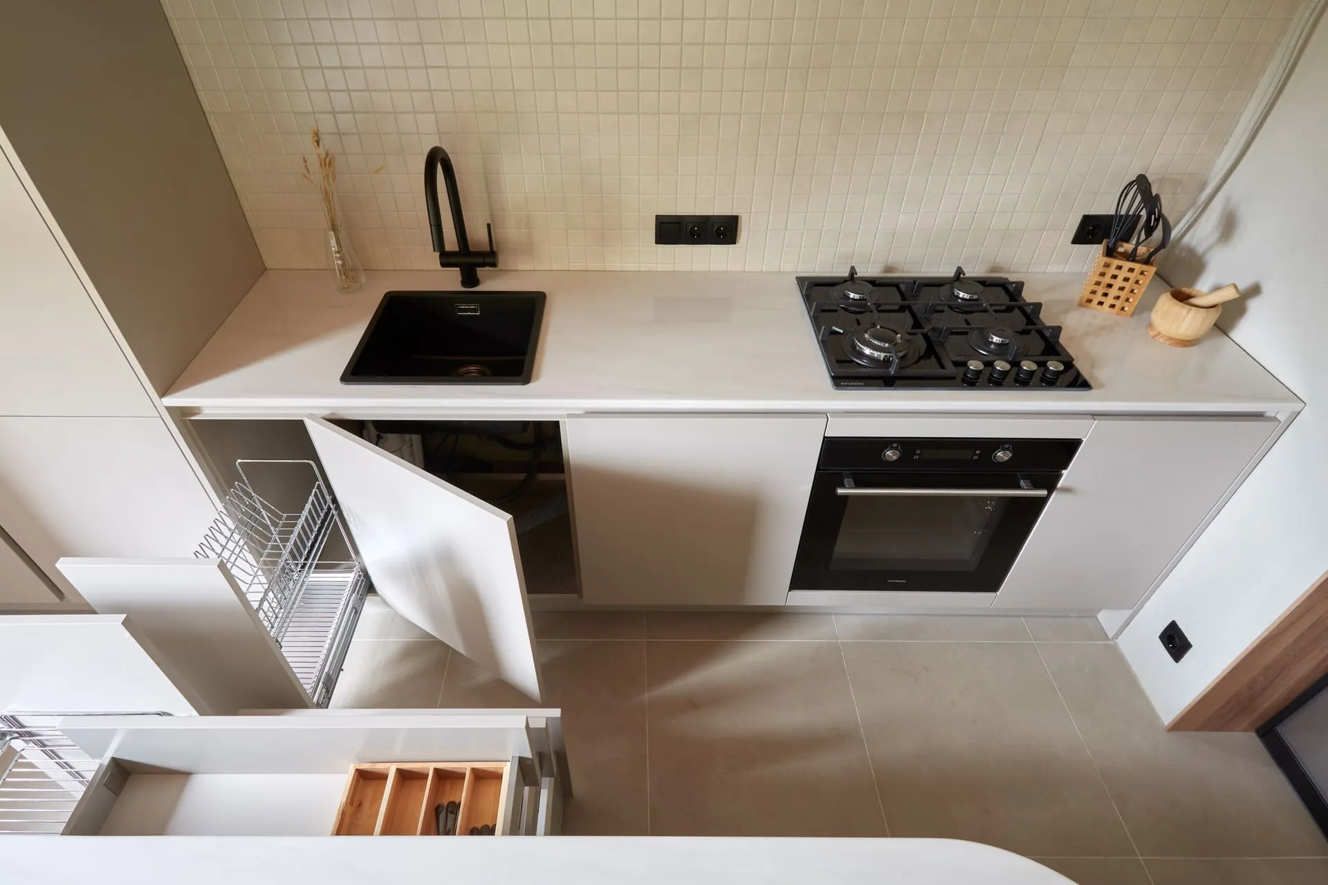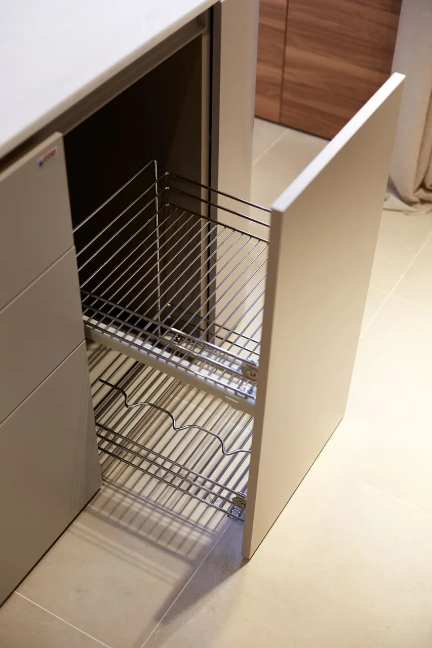 - распашной фасад, за которым зона подвода/отвода воды, фильтров, металлический гигиенический поддон от Mr.Doors, предотвращающий растекание и впитывание воды мебельными деталями, а также не допускающий контакт агрессивных жидкостей с корпусом мебели и механические повреждения корпуса