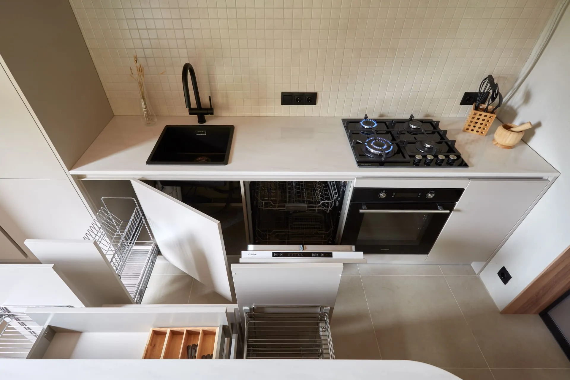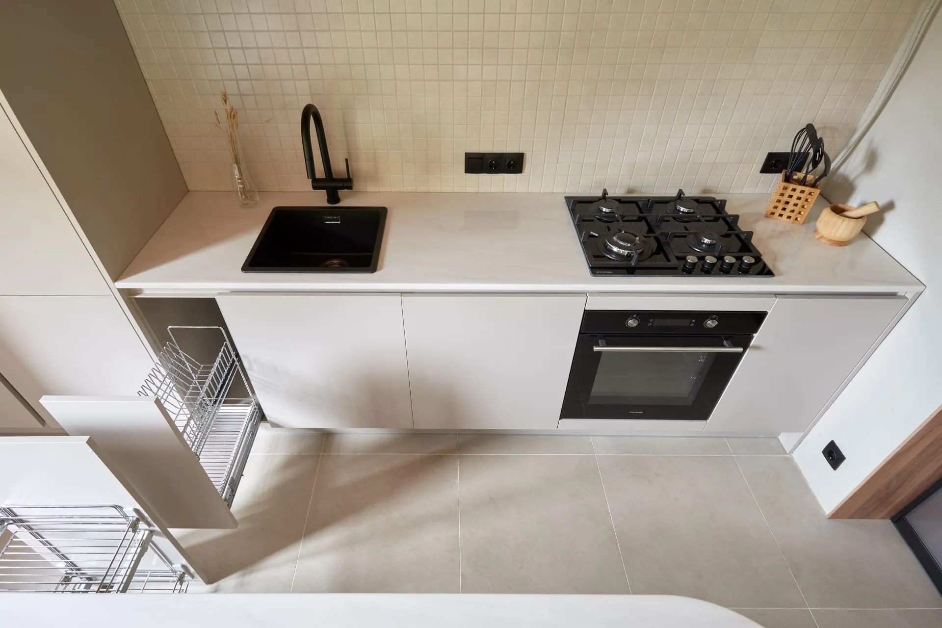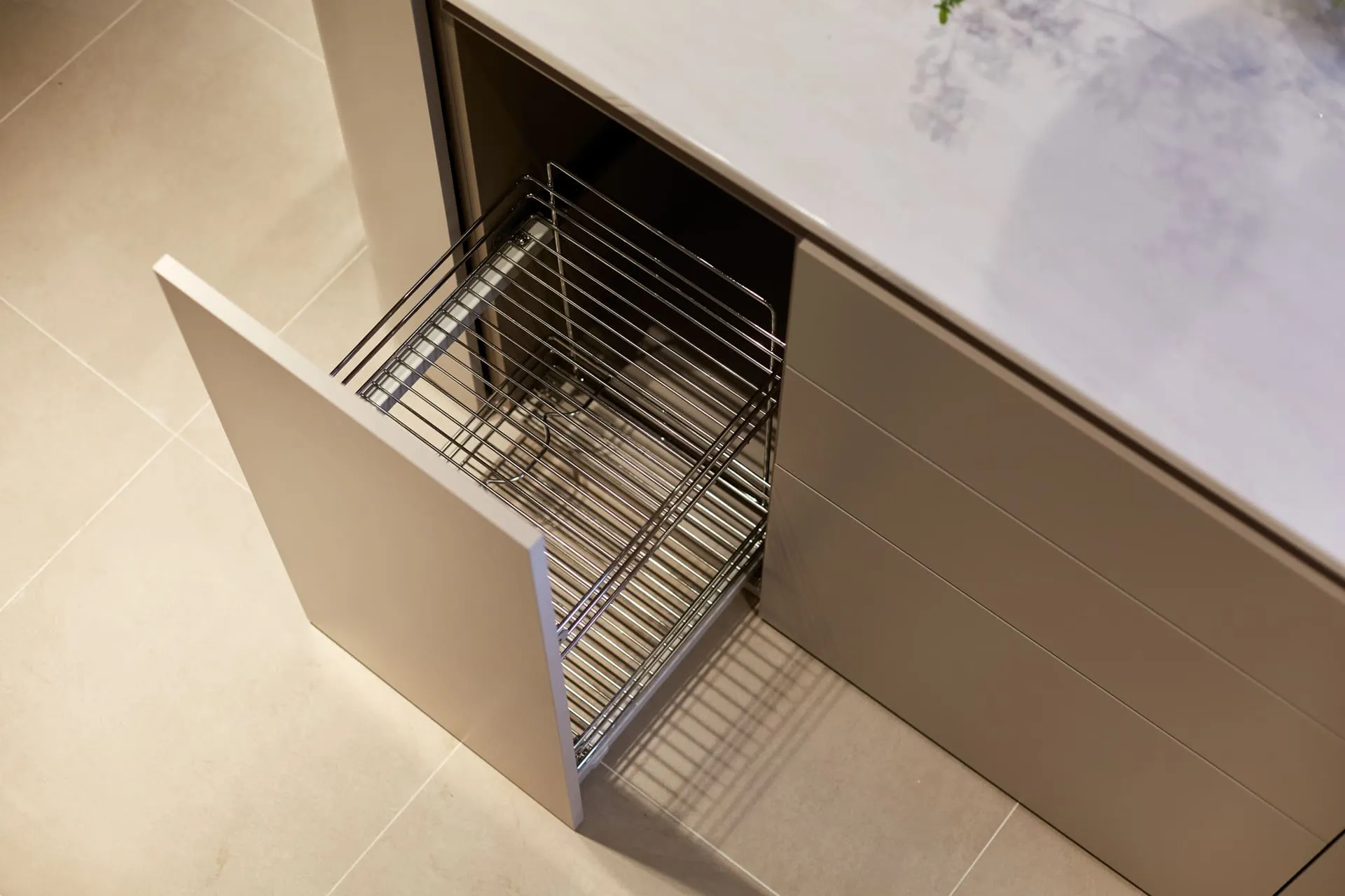 - распашной фасад, за которым зона подвода/отвода воды, фильтров, металлический гигиенический поддон от Mr.Doors, предотвращающий растекание и впитывание воды мебельными деталями, а также не допускающий контакт агрессивных жидкостей с корпусом мебели и механические повреждения корпуса