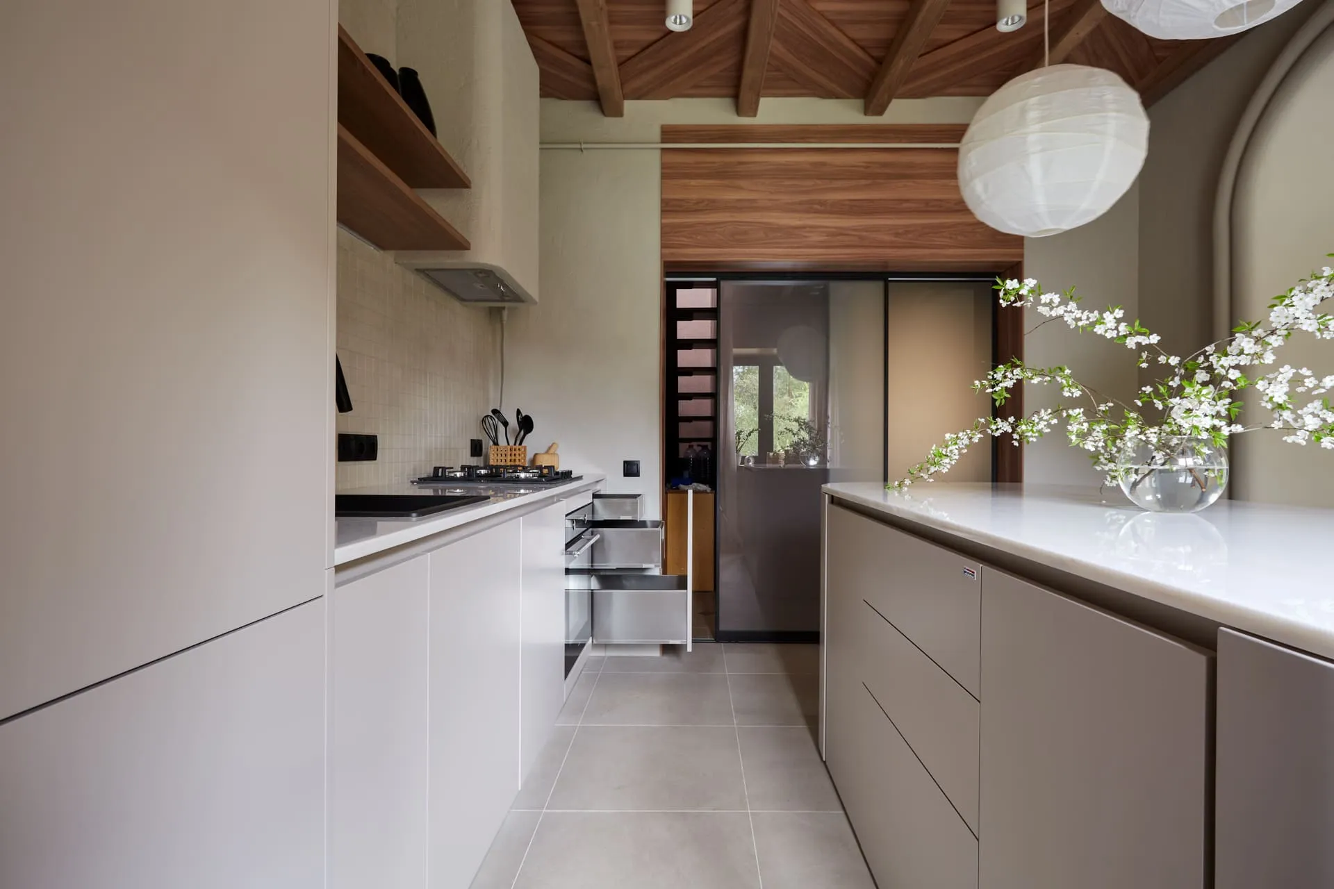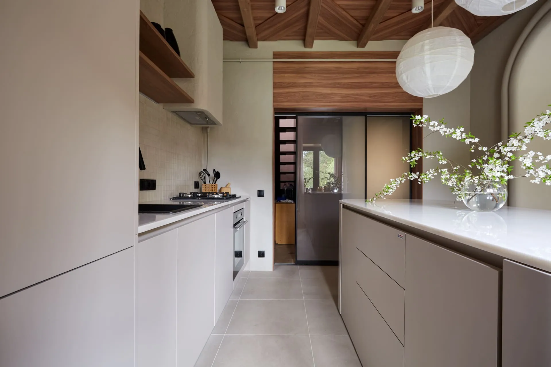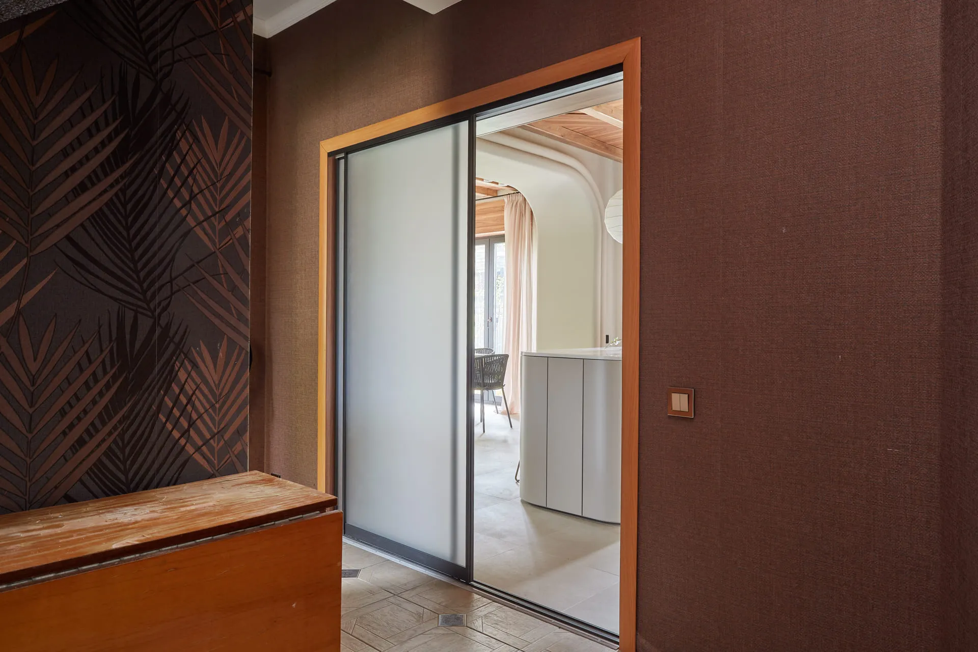 Двери между коридором и кухней - система Визио-Т, напольного качения, полноформатные - единым куском стекла в раме. Стекло матовое мателюкс, рама алюминиевая чёрная, доводчики фиксируют каждую из дверей у одной из стен (любой), так что проход может быть слева или справа, по желанию хозяев.