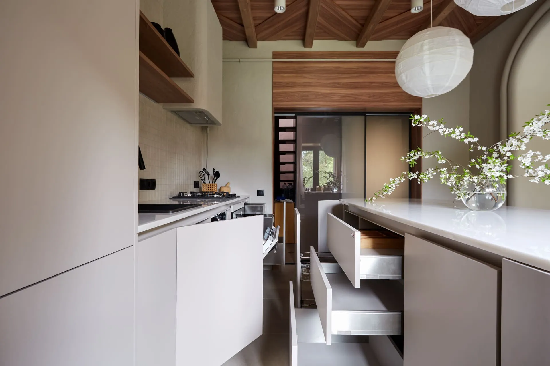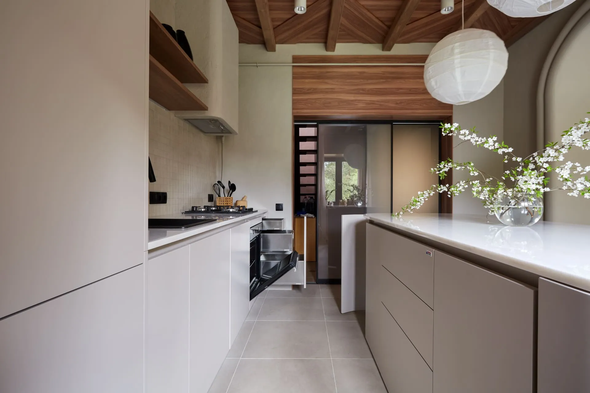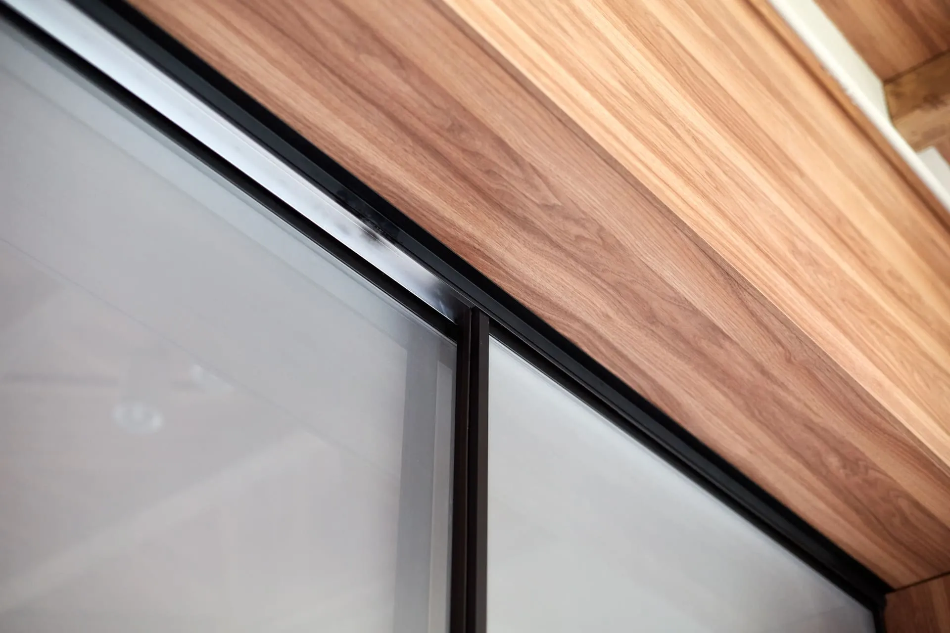 Двери между коридором и кухней - система Визио-Т, напольного качения, полноформатные - единым куском стекла в раме. Стекло матовое мателюкс, рама алюминиевая чёрная, доводчики фиксируют каждую из дверей у одной из стен (любой), так что проход может быть слева или справа, по желанию хозяев.