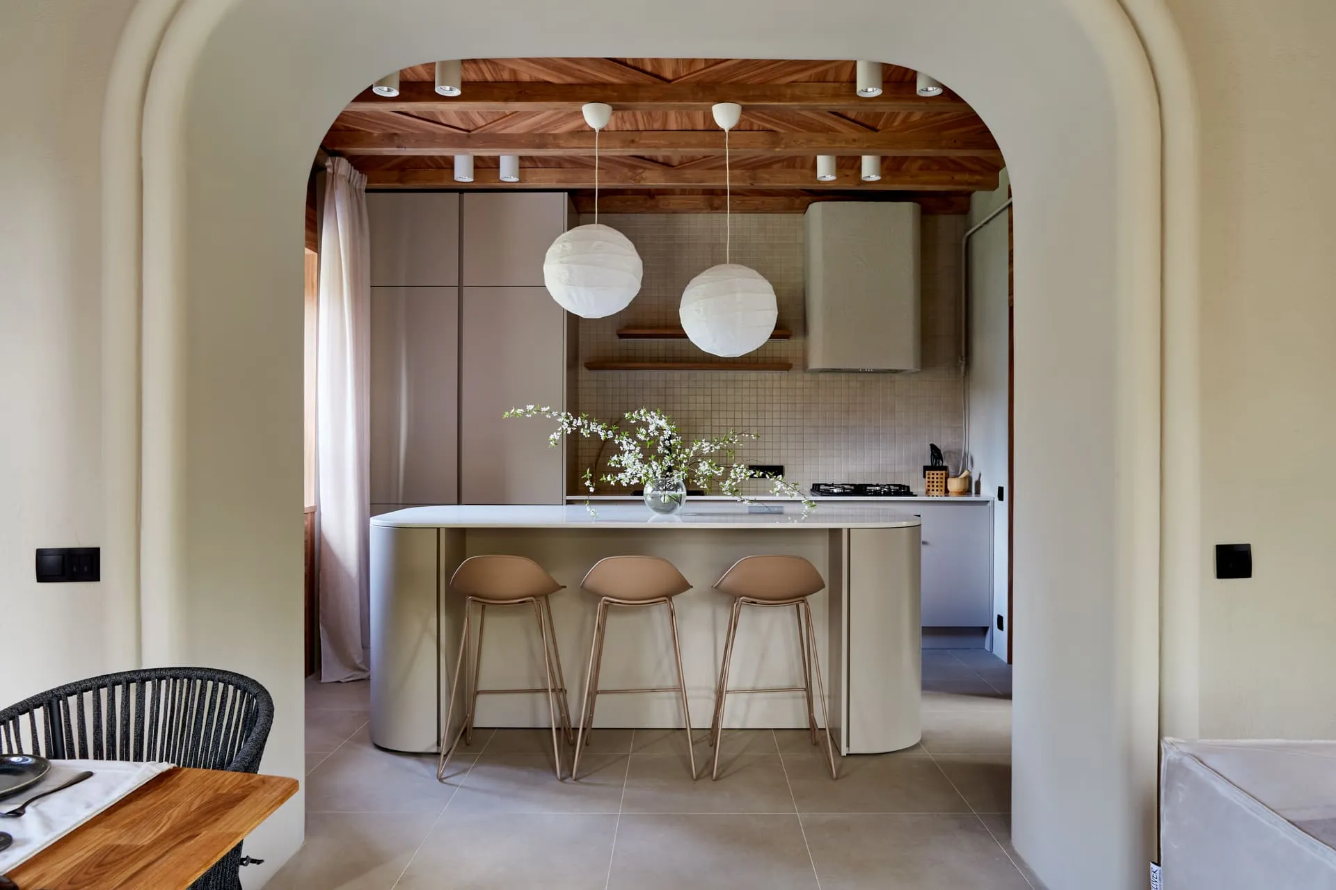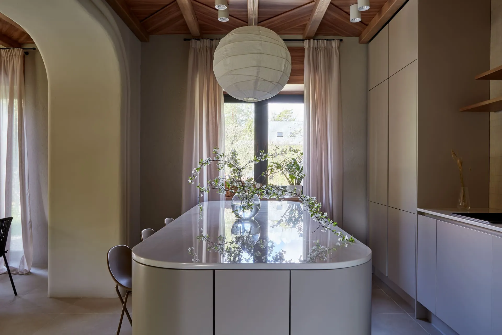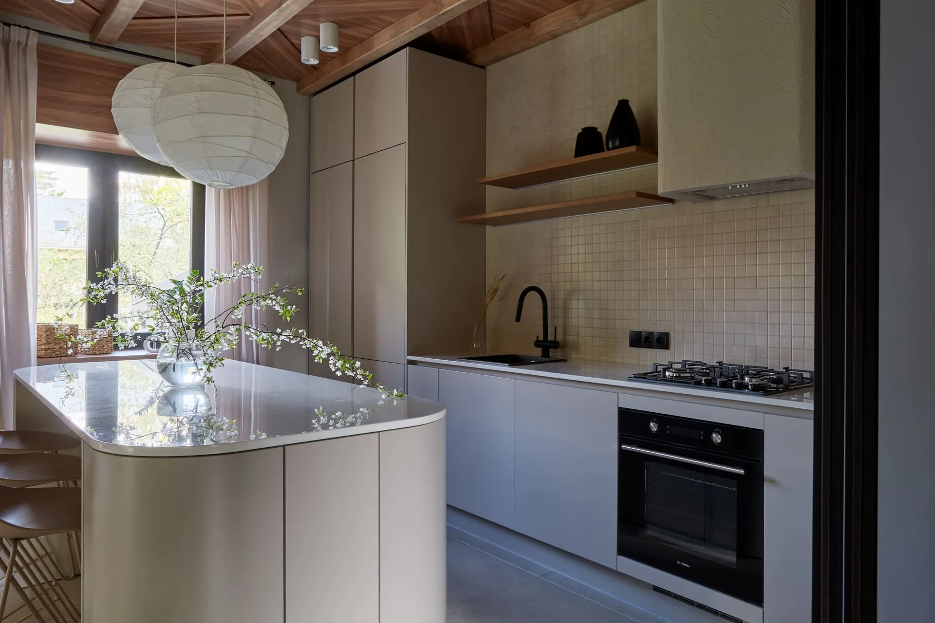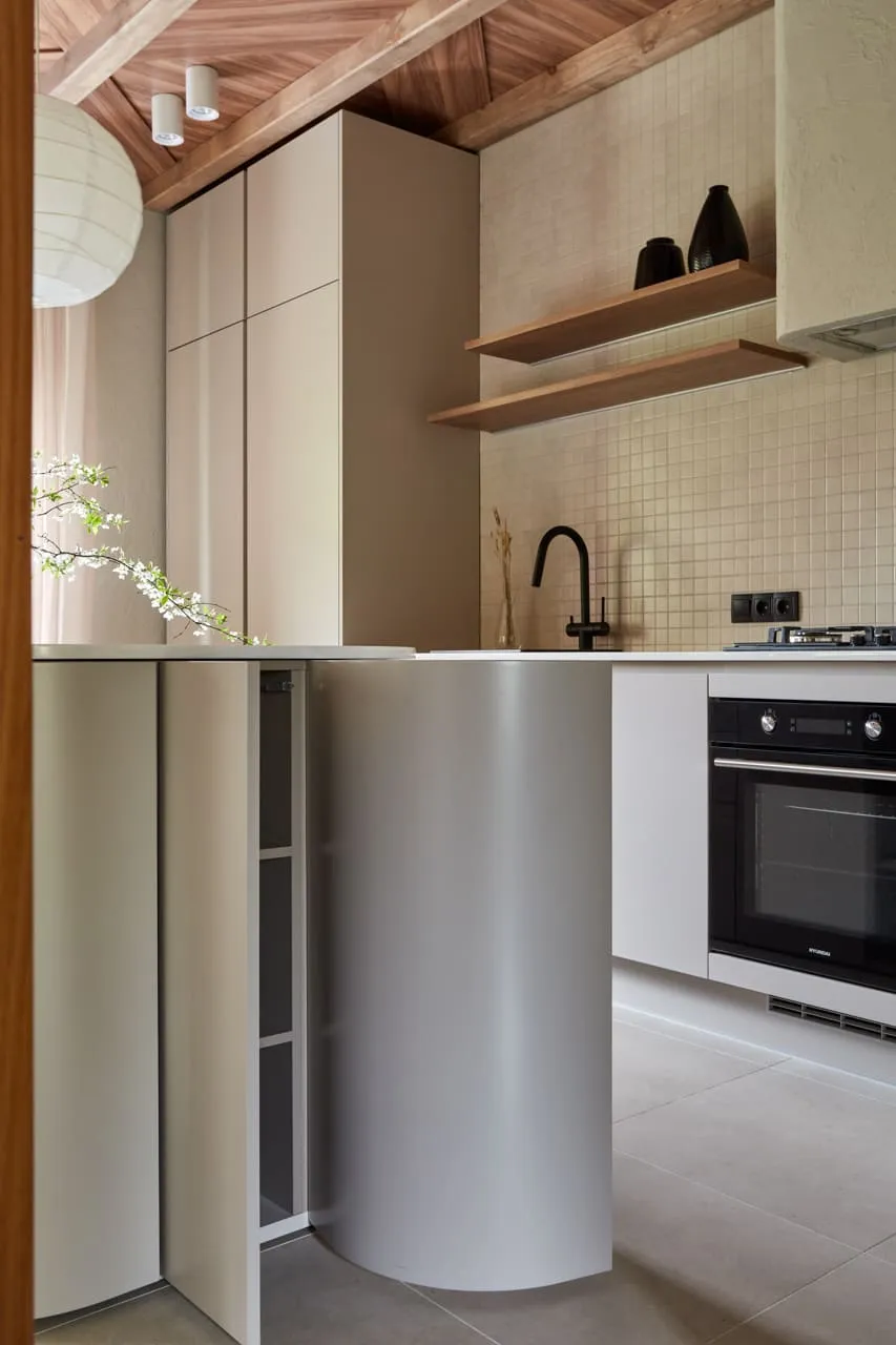 По задумке автора проекта, остров должен быть округлых очертаний по столешнице и боковинам. Нам пришлось изготавливать столешницу специальной скруглённой формы.