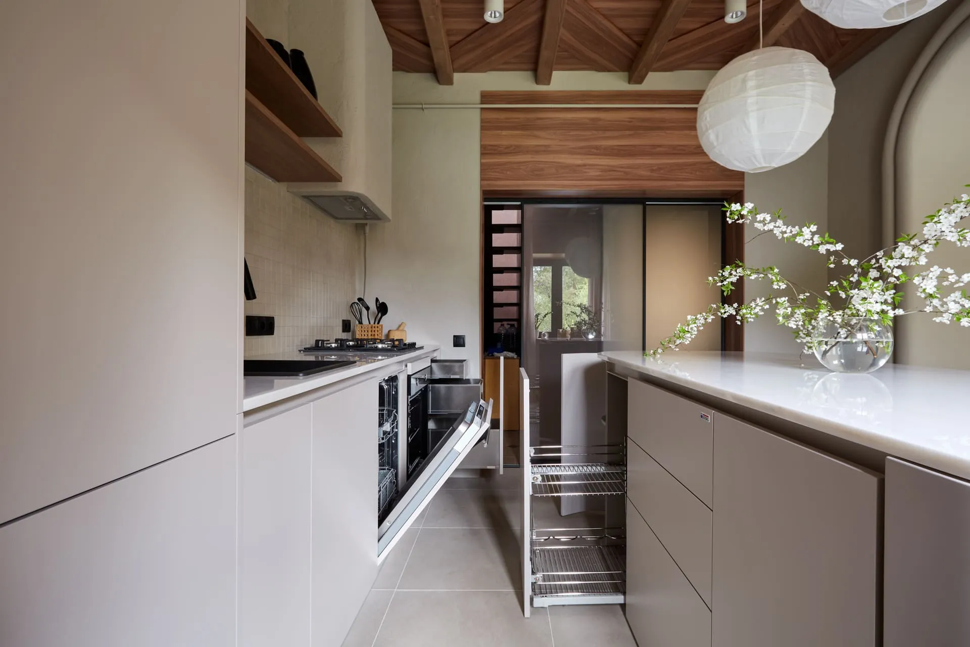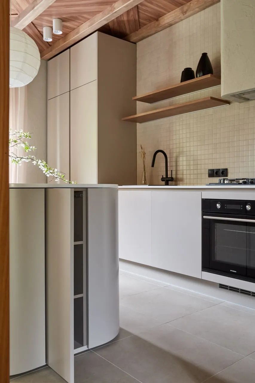 МДФ в матовой эмали Кашемир, в ней же цоколь и профиль ГОЛА (позволяет создать пространство без ручек, создавая некую пазуху за оборотной стороной фасада. Выполняется из алюминия, тонируется по желанию эмалью или анодируется). В нашем проекте Гола встроен под столешницей, открывая доступ ко всем фасадам сверху,