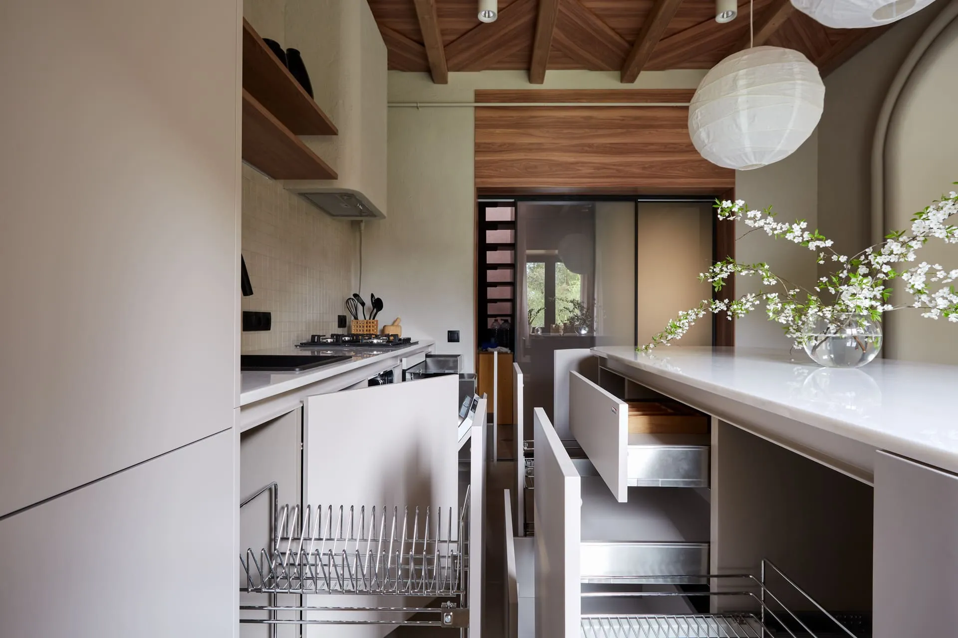 - вначале выдвижная хромированная сушка для посуды