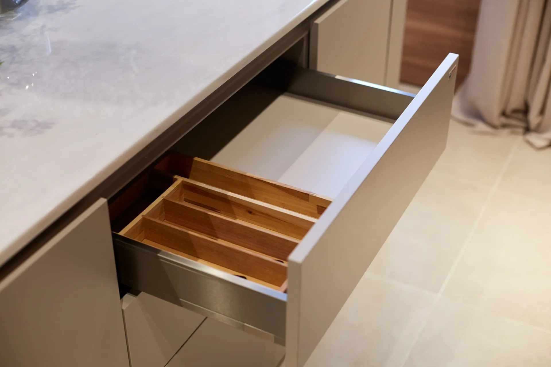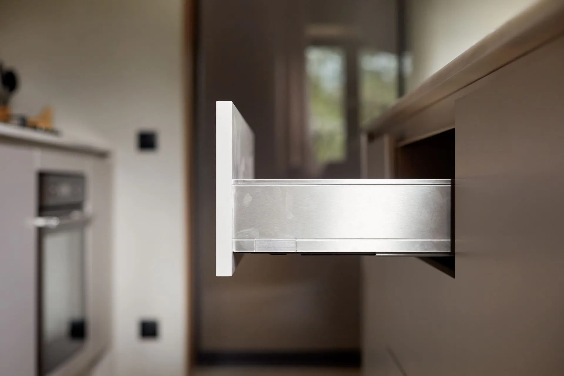 - у стены - выдвижной ящик LegraBox, за эмалевым фасадом которого скрыты ещё 2 выдвижных/потайных ящика с удобными комплектами разделителей внутреннего пространства.