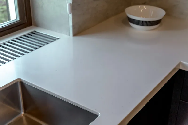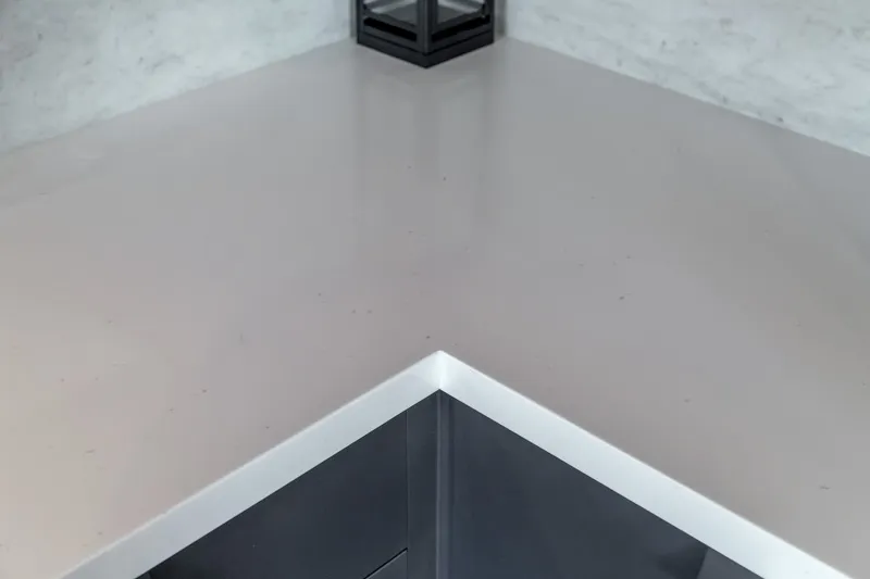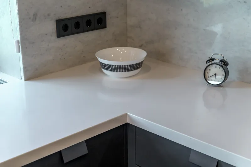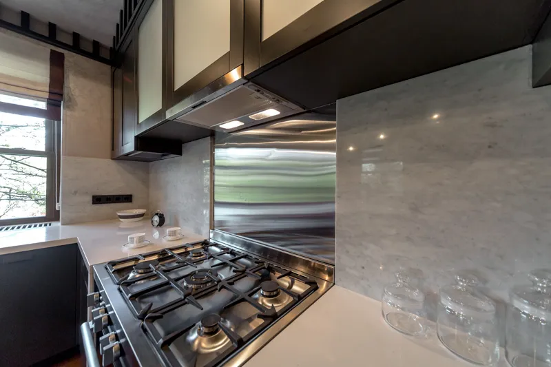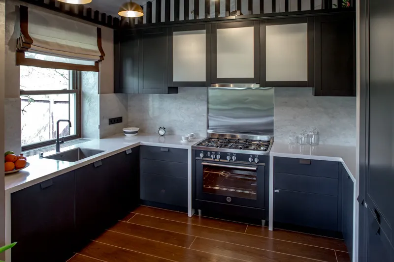 Прочная столешница выполнена из искусственного камня «Кориан» в цвете «Белый жасмин». Модули кухни изготовлены из ДСП в цвете «Графит», а рамочные фасады серии «Шейкер» — из МДФ в матовой эмали «Графит». Три фасада верхнего яруса дополнили вставкой из декоративного матового зеркала «Мателюкс», что добавило в помещение света и разбавило тёмное цветовое решение. На фасады и ящики нижних модулей установили ручки «ЗАГ» итальянского производства в цвет фасадов.