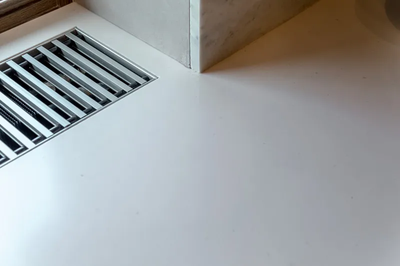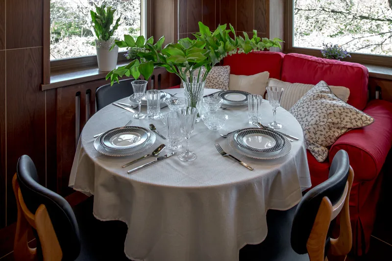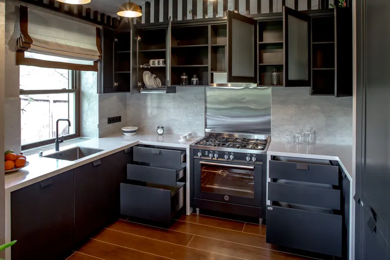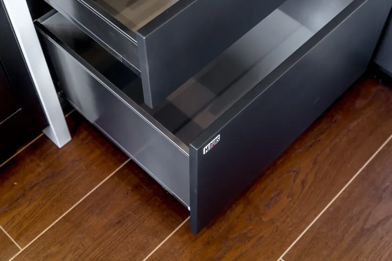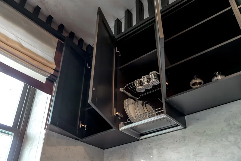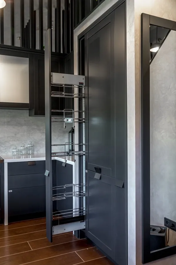 Короба выдвижных ящиков «Легробокс» — из нержавеющей стали с защитным покрытием, на котором не остаются отпечатки пальцев. Верхний ящик предназначен для хранения столовых приборов. В отдельной нише разместили модуль под встроенный холодильник, а по бокам от него — полноразмерные выдвижные колонки для хранения бутылок, специй и хозяйственной атрибутики. Все фасады и выдвижные элементы оснащены доводчиками австрийской компании BLUM, известной надёжностью и долговечностью своей фурнитуры.