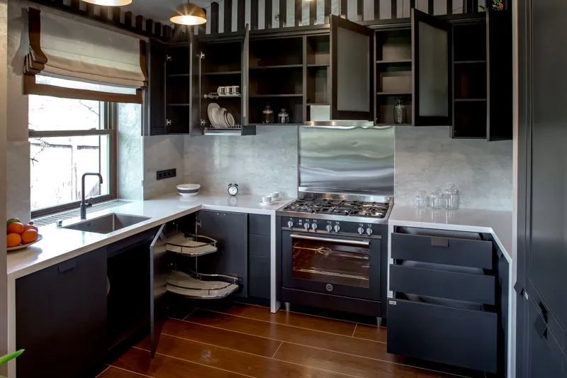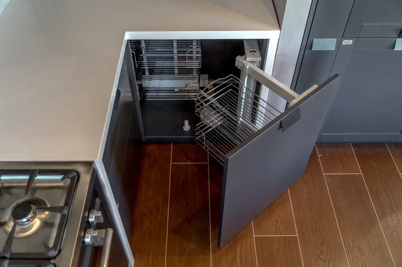В угловых модулях находится система хранения «Волшебный уголок», состоящая из механических раскладных и выкатных систем с закреплёнными на них корзинами и секциями. При закрывании двери эта конструкция складывается, обеспечивая компактное хранение кухонной утвари в несколько ярусов. Эта система, а также выкатные корзины позволяют наиболее оптимально использовать скрытое пространство и не загромождать открытые секции.