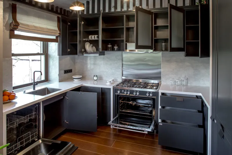 Функциональную зону кухни расположили буквой «П» вдоль трёх стен с выходом к окну. Такое решение обеспечило больше естественного освещения и повысило настроение тем, кто собирается проводить за приготовлением еды и мытьём посуды много времени.