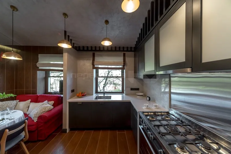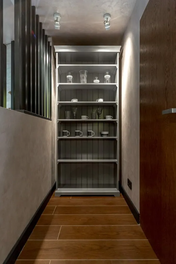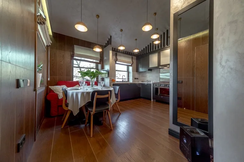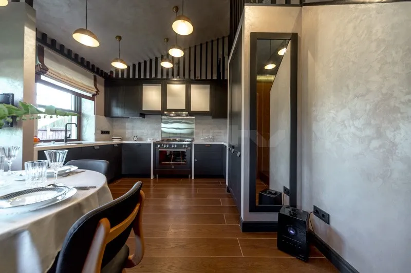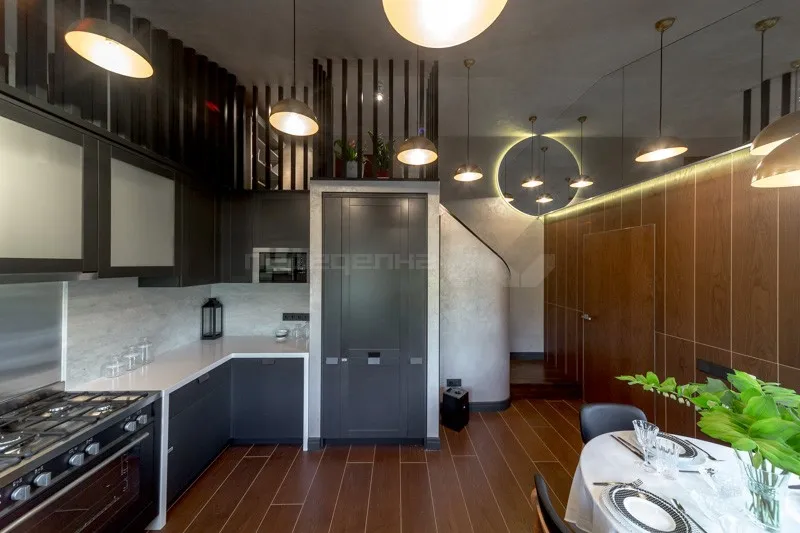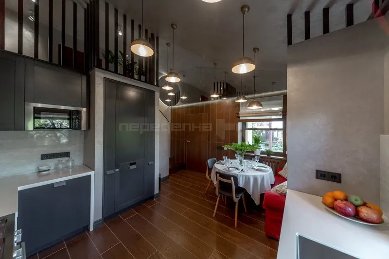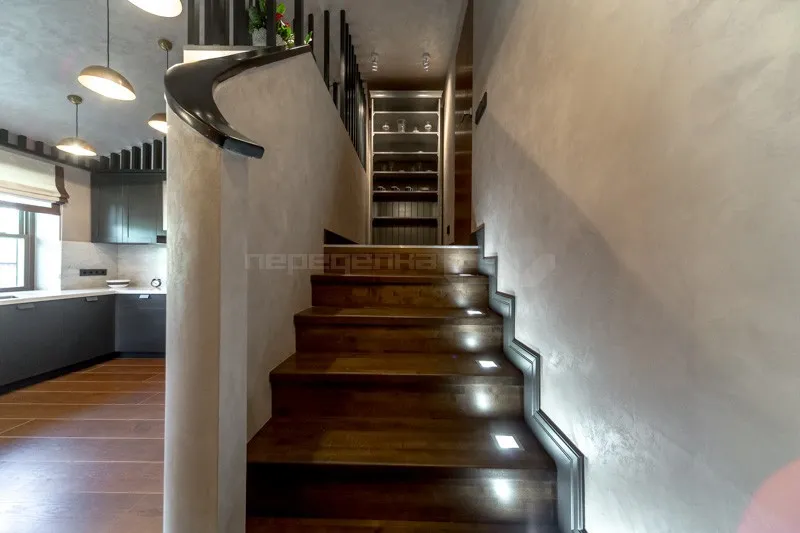 Помещение было полностью изменено: в кухне положили новые полы из паркетной доски с верхом из американского дуба, лестница на второй этаж с изящным изгибом отделила проход на второй этаж, а светлые стены с лёгким блестящим эффектом уравновесили тёмный низ. Зоны для готовки и приёма гостей разнесли по противоположным концам кухни, сделав её просторной и в то же время уютной.