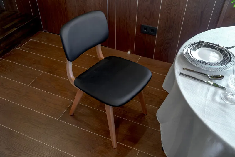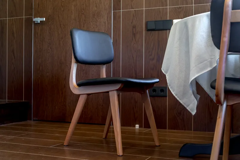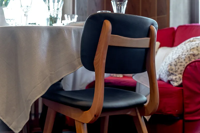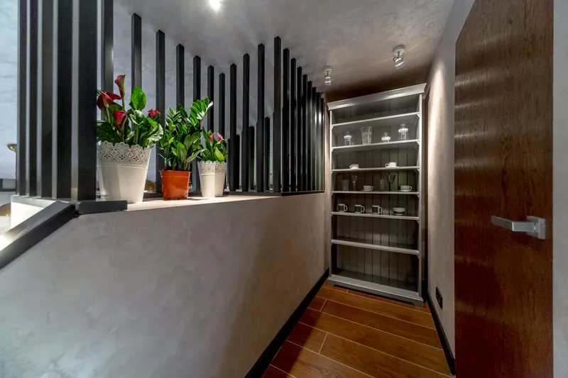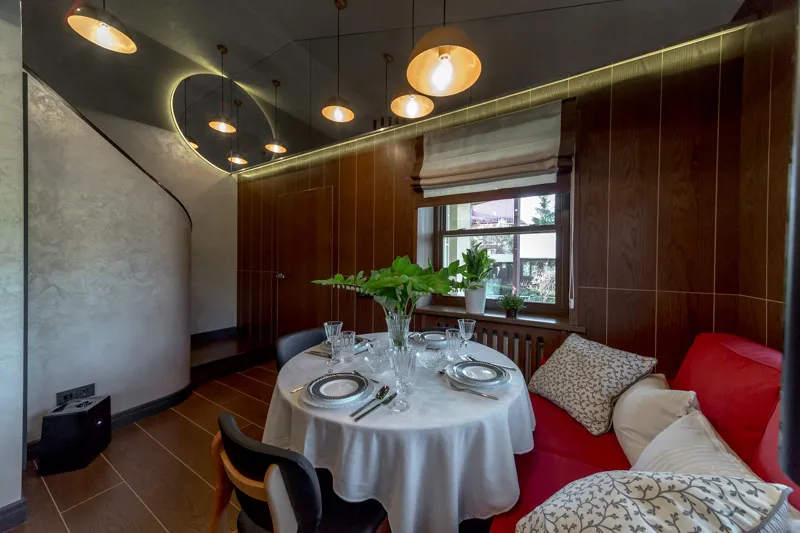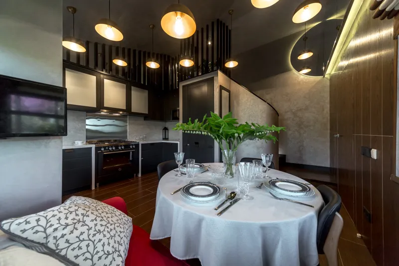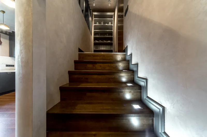 Помещение было полностью изменено: в кухне положили новые полы из паркетной доски с верхом из американского дуба, лестница на второй этаж с изящным изгибом отделила проход на второй этаж, а светлые стены с лёгким блестящим эффектом уравновесили тёмный низ. Зоны для готовки и приёма гостей разнесли по противоположным концам кухни, сделав её просторной и в то же время уютной.