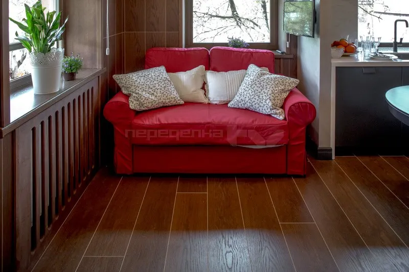 На стене у входа в кухню повесили зеркало в полный рост. Его рама выполнена из МДФ в цвете «Графит», за счёт чего оно перекликается со всем интерьером.