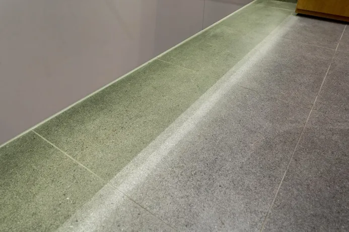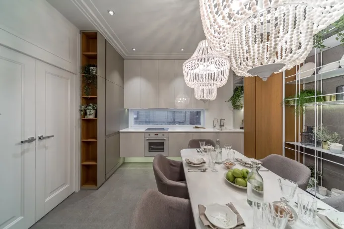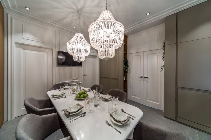 Столешница обеденного стола выполнена из искусственного камня Quarzelan в декоре «Арктика Супериор».