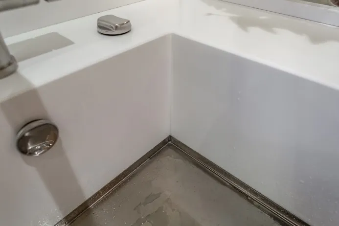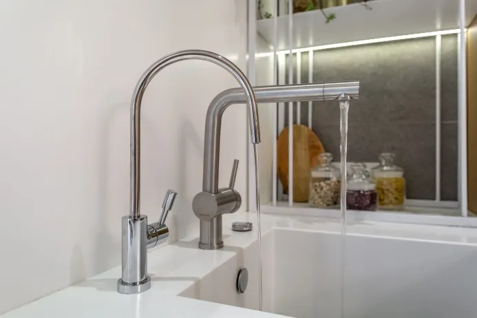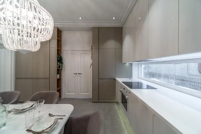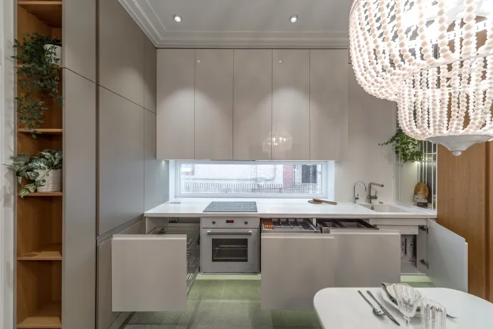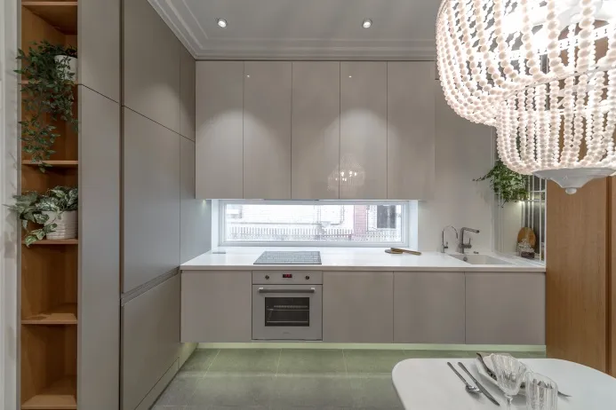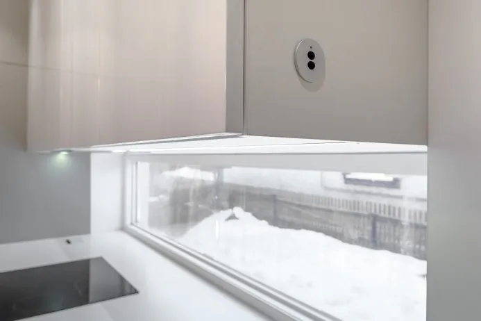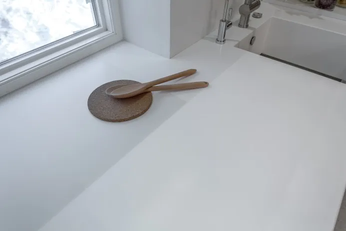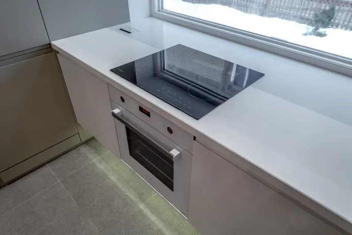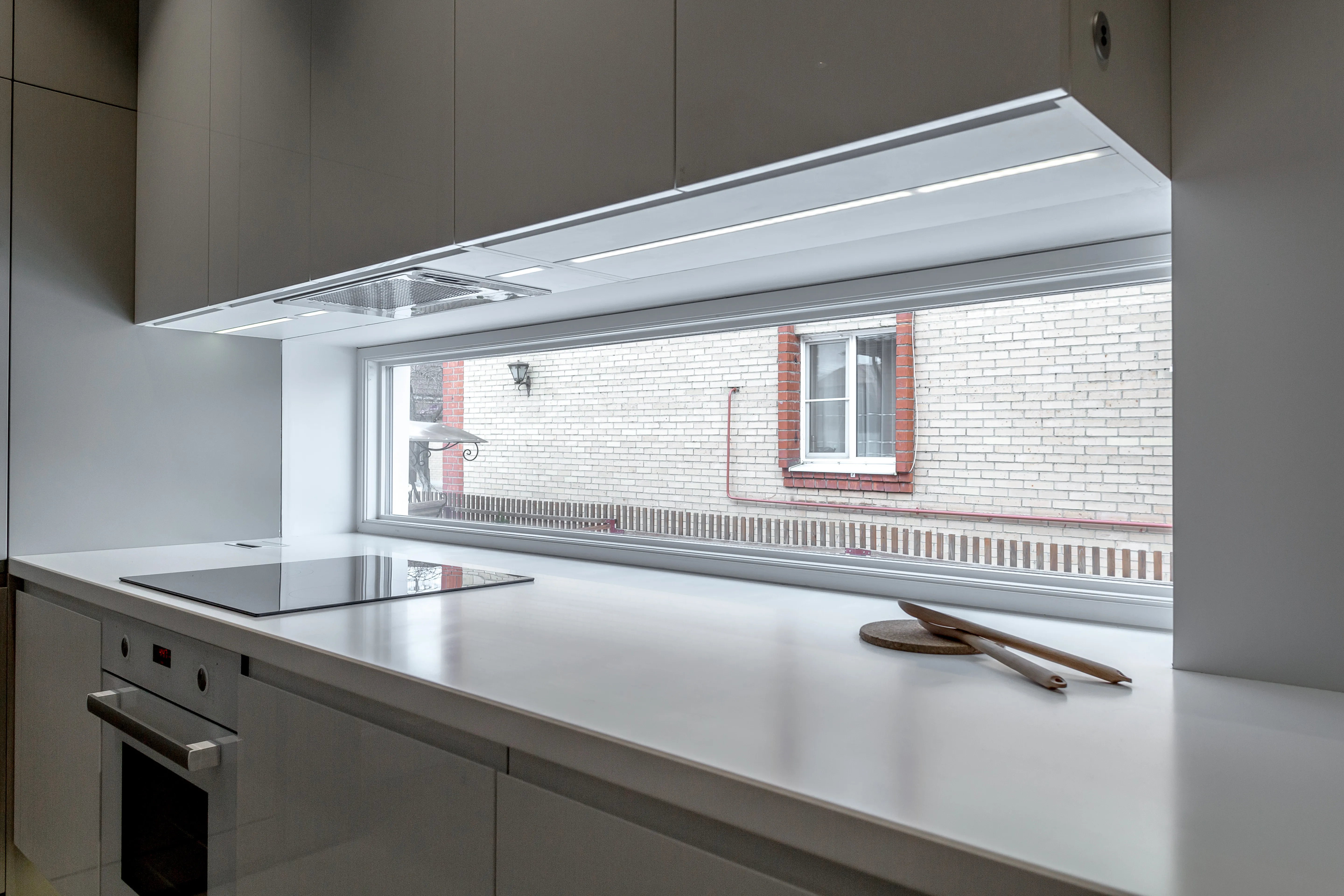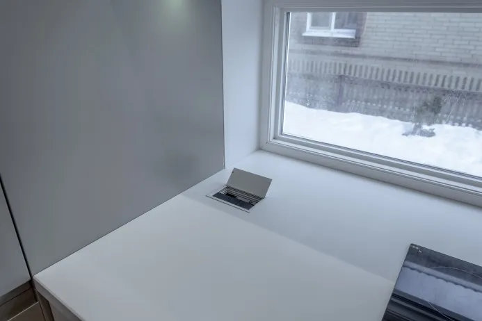 Столешница толщиной 40 мм и стеновая панель 12 мм выполнены из искусственного камня StoneTwelve в декоре «Уни Бланко». Столешницу расположили вплотную к окну, увеличив полезное пространство.