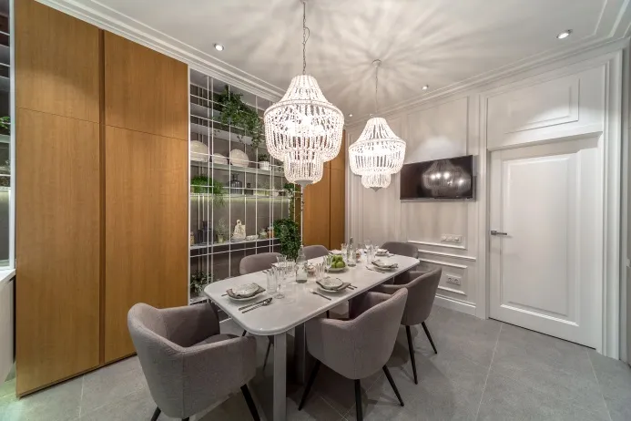 Мистер Дорс не боится браться за сложные индивидуальные проекты и успешно их реализует. В этот раз вместе с дизайнерами «Дачного ответа» мы сделали объединенную зону кухни-столовой-гостиной.