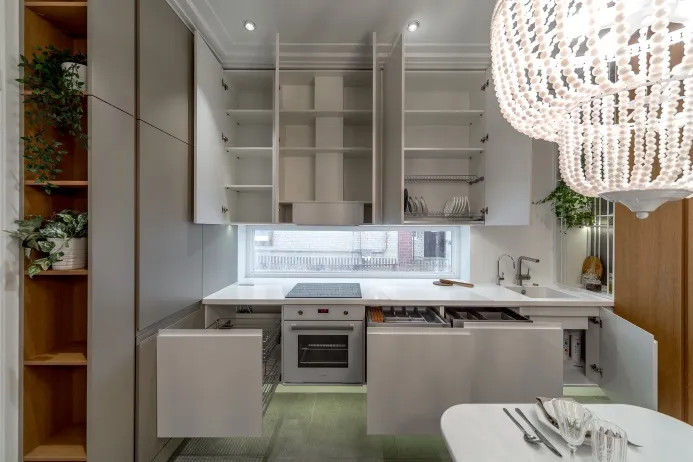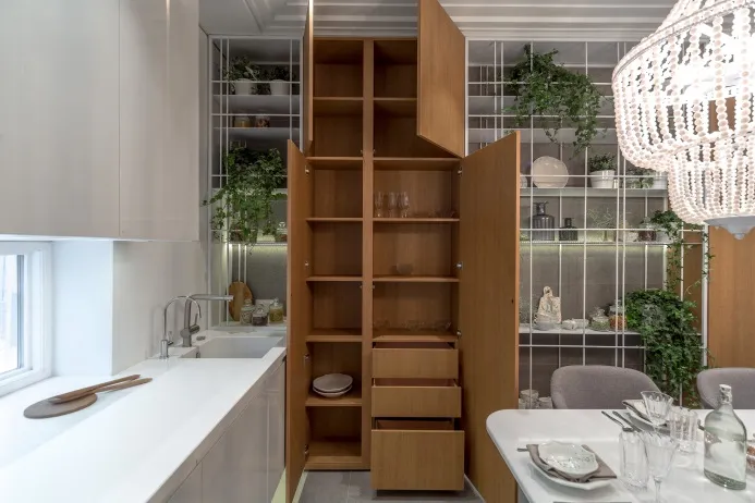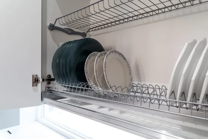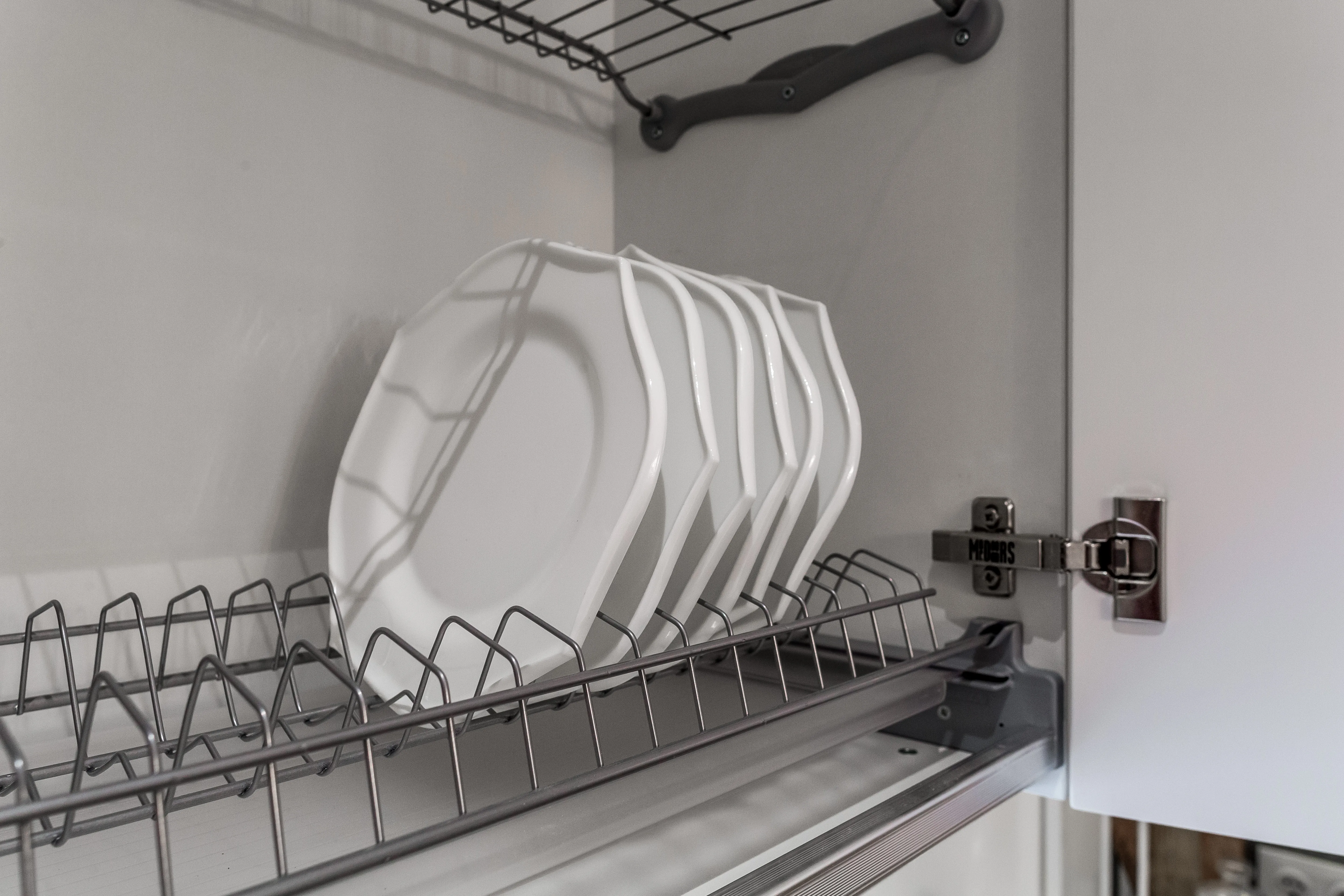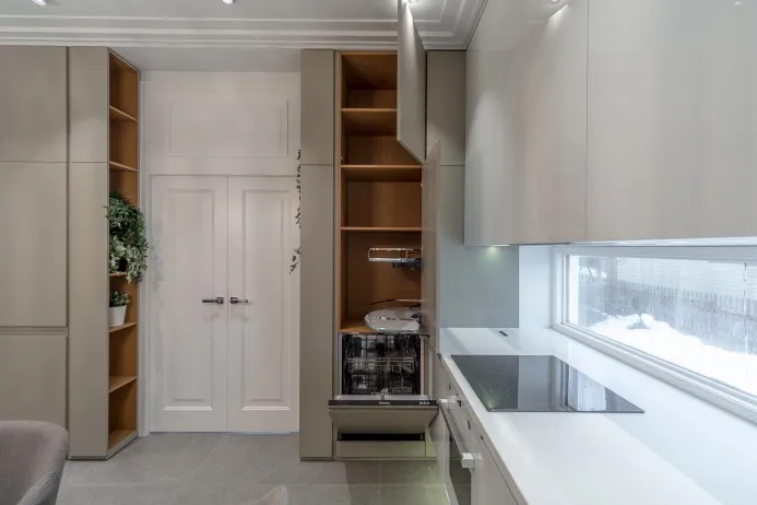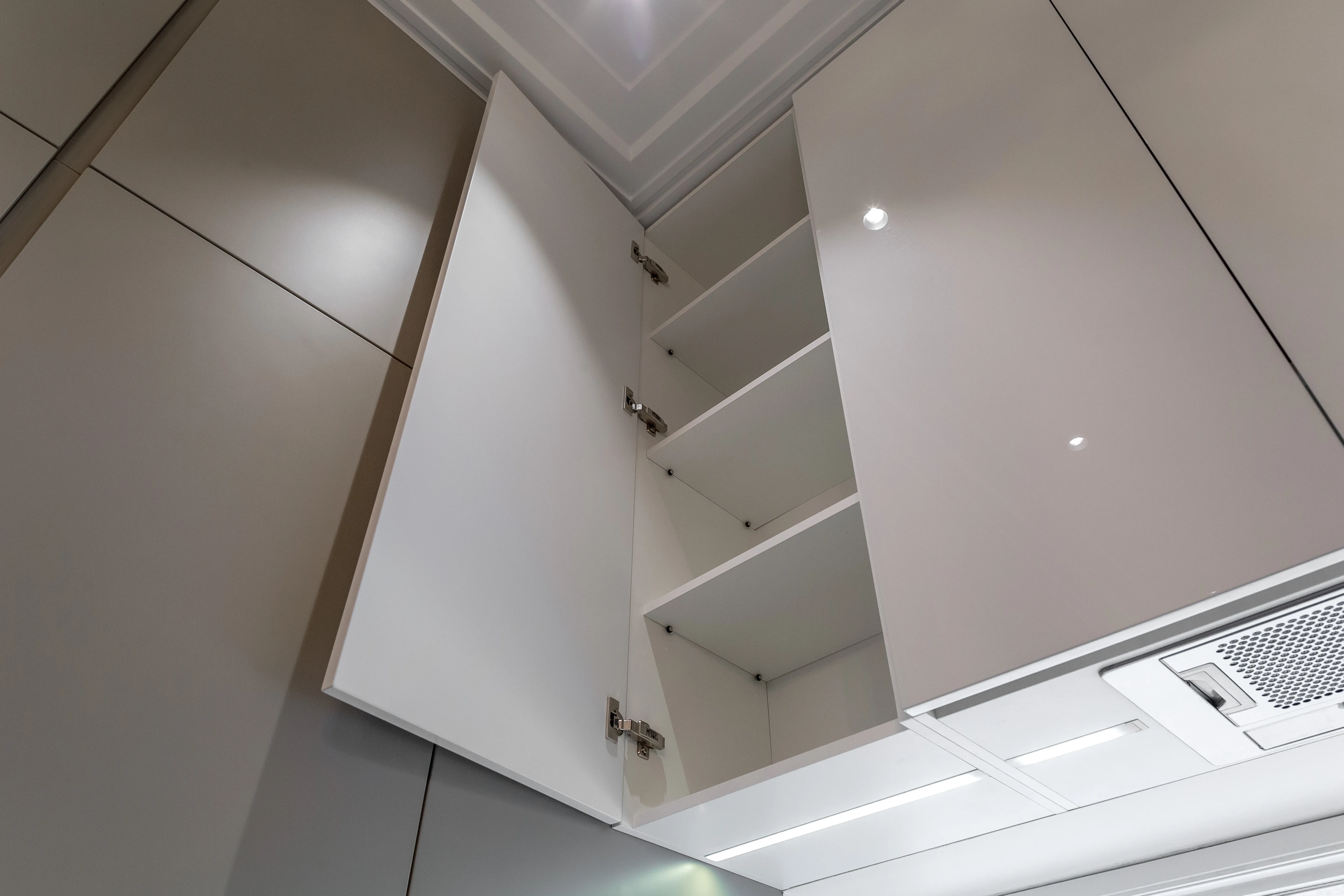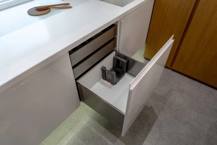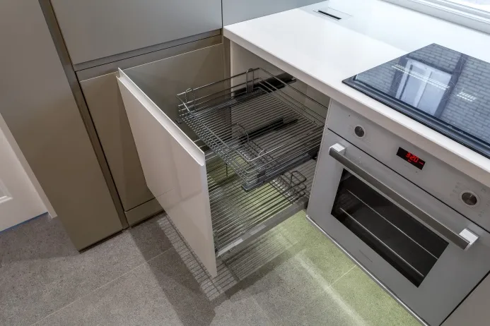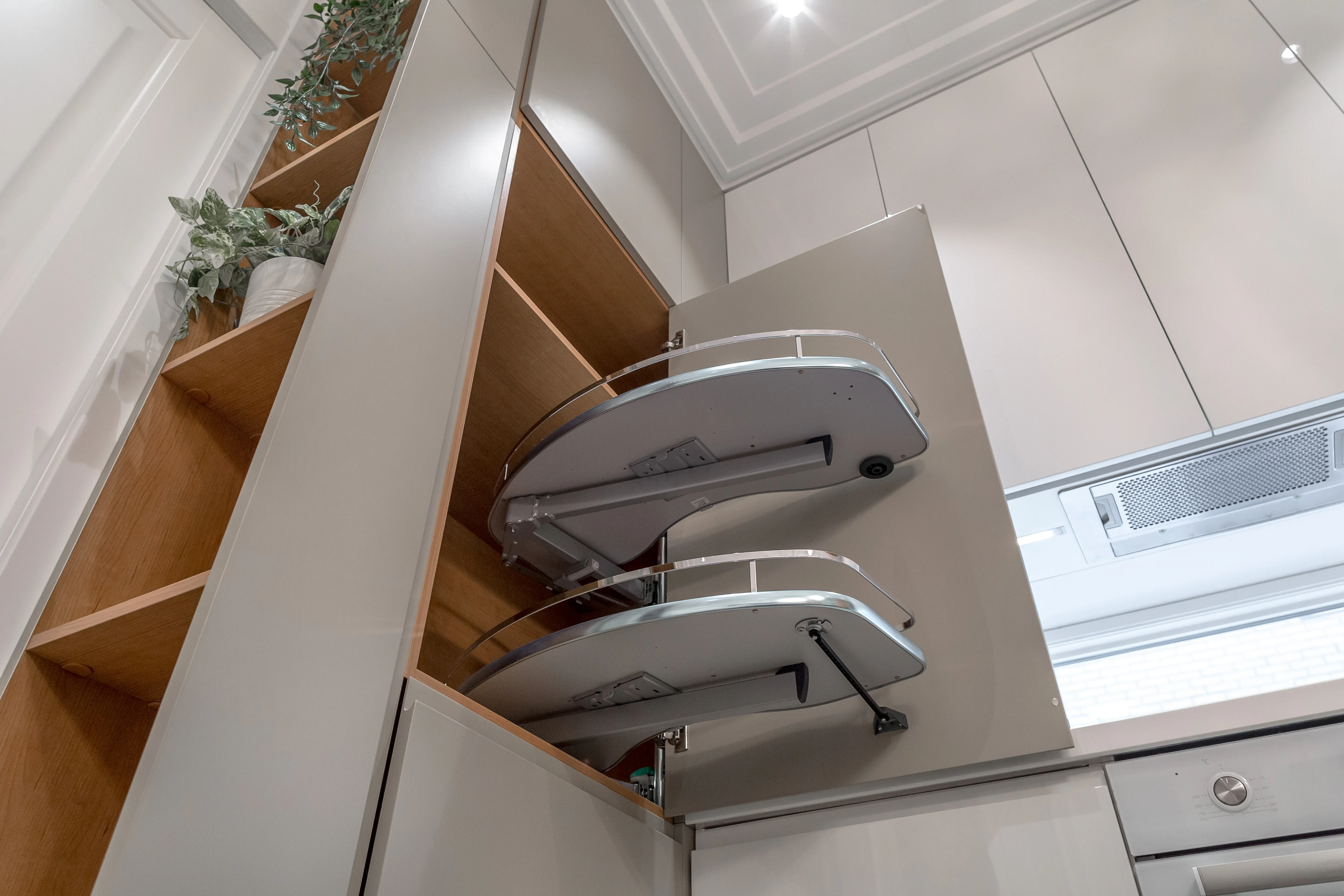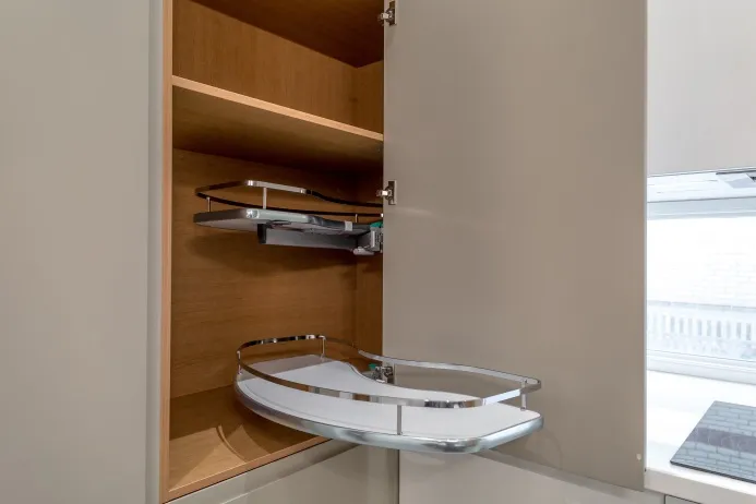 Во втором – посудомойку и выкатную угловую корзину. Таким образом задействовали пространство, которое часто остается просто пустым, и добавили места для хранения различных полезных на кухне вещей. Системы открывания варьируются – J или Push-to-Open/Нажал-открыл.
