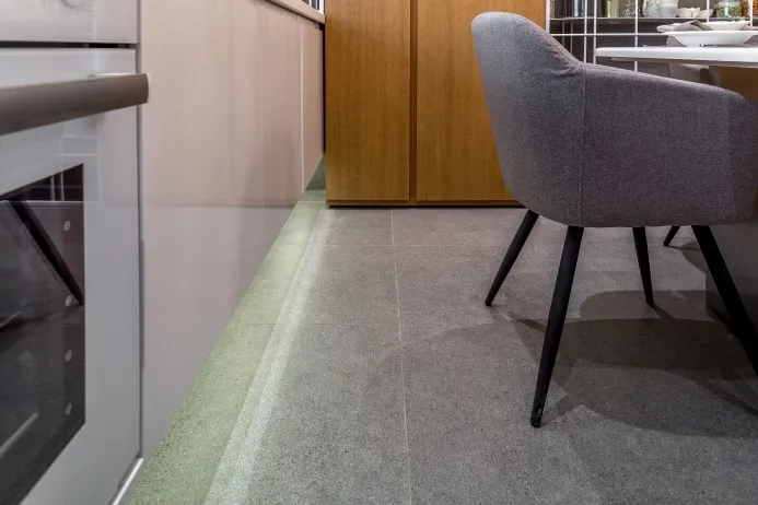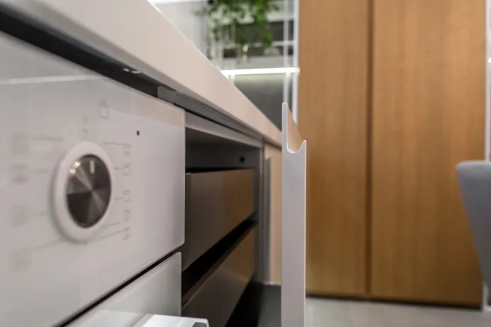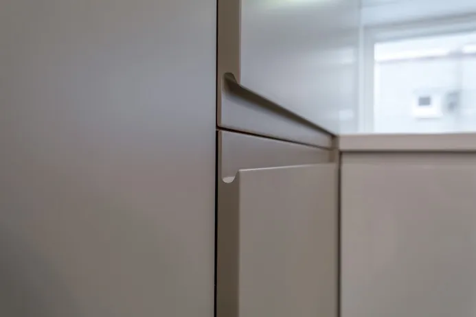 Нижние фасады и фасады боковых шкафов сделаны с фигурным вырезом в виде буквы J, за который удобно захватывать и открывать панель.