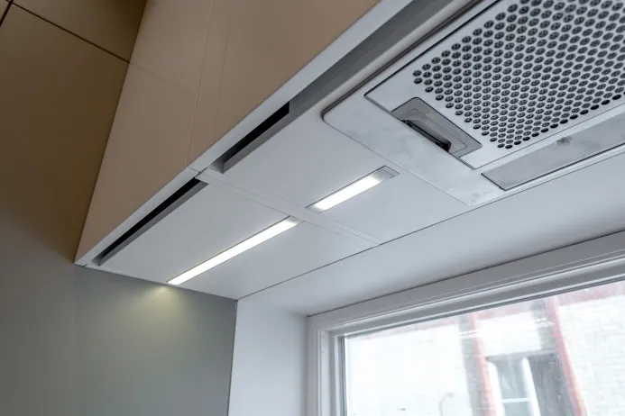 В навесной модуль встроили вытяжку и разместили сушку для посуды. Под модулями – и верхними, и нижними - устроена линейная LED-подсветка, управляемая дистанционным выключателем, расположенным сбоку на шкафу.