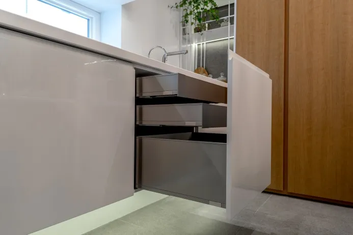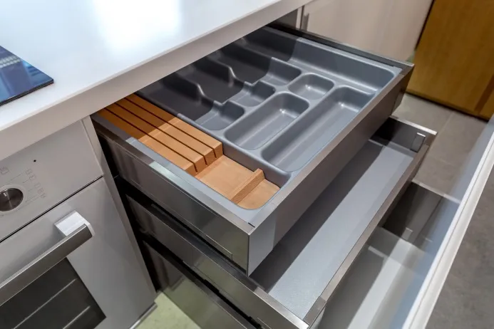В рабочей зоне внизу разместили модули с выдвижными корзинами и ящики Леграбокс. На сегодняшний день, это самые совершенные ящики с точки зрения отсутствия зазоров, провисания и надёжности механизмов скольжения. Нагрузка возможна до 70 кг. Ящики отличает элегантный дизайн и плавное бесшумное закрывание. В один из ящиков поместили лоток для столовых приборов и держатель для посуды.