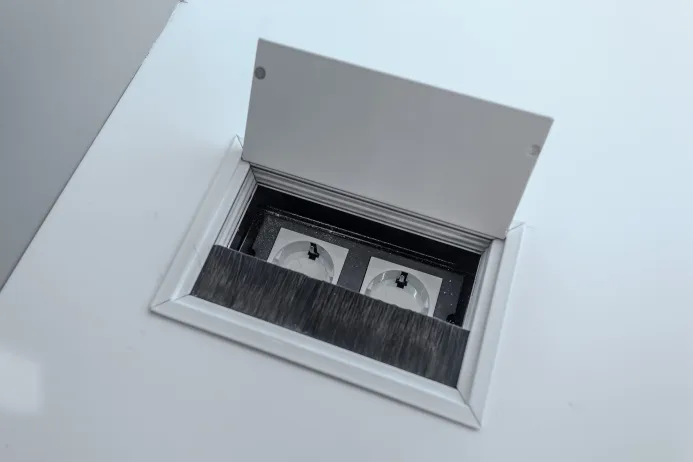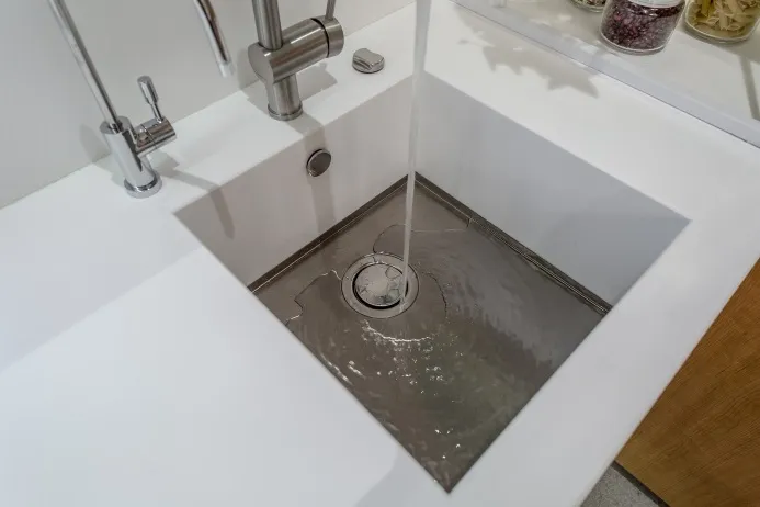 В неё интегрировали мойку, а также врезали блок с розетками – очень удобно и функционально.