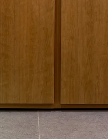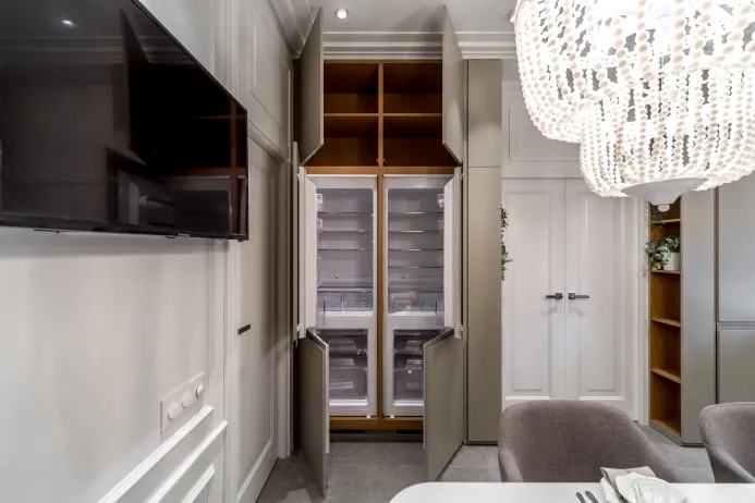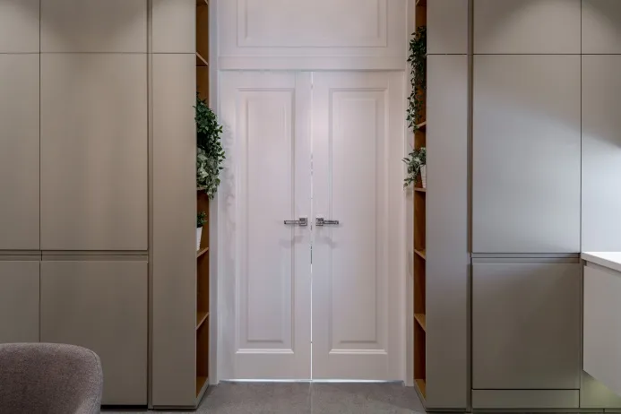Шкафы гостиной зоны выполнены из МДФ в плёнке «Вишня Каролина». Следуя за последними тенденциями мебельной моды, между секциями шкафов сделаны проставки из ДСП 32 мм, распашные фасады – накладные. Система открывания Push-to-Open.