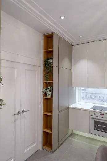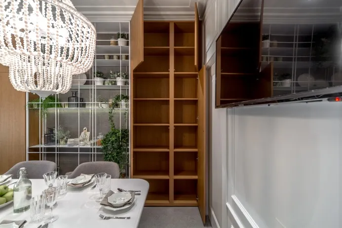 В торцах модулей, выходящих на входную дверь, – открытые полки.