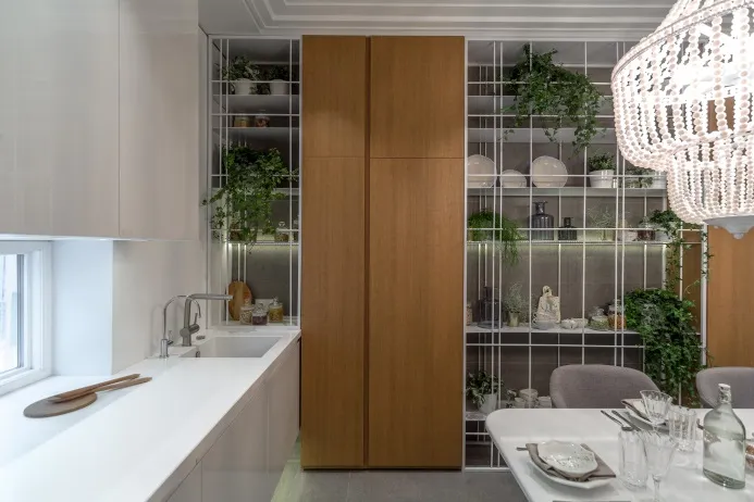 Корпус шкафов, обрамляющих слева и справа кухонную зону, выполнен в цвете «Вишня Каролина», а фасады – МДФ в матовой эмали «Джут». В одном шкафу «спрятали» холодильники и морозильные камеры.