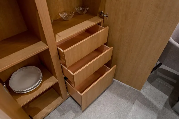 Внутри шкафов – многочисленные полки для хранения и ящики полного выдвижения. Все дверцы и ящики в композиции снабжены доводчиками, обеспечивающими плавное и бесшумное закрывание.